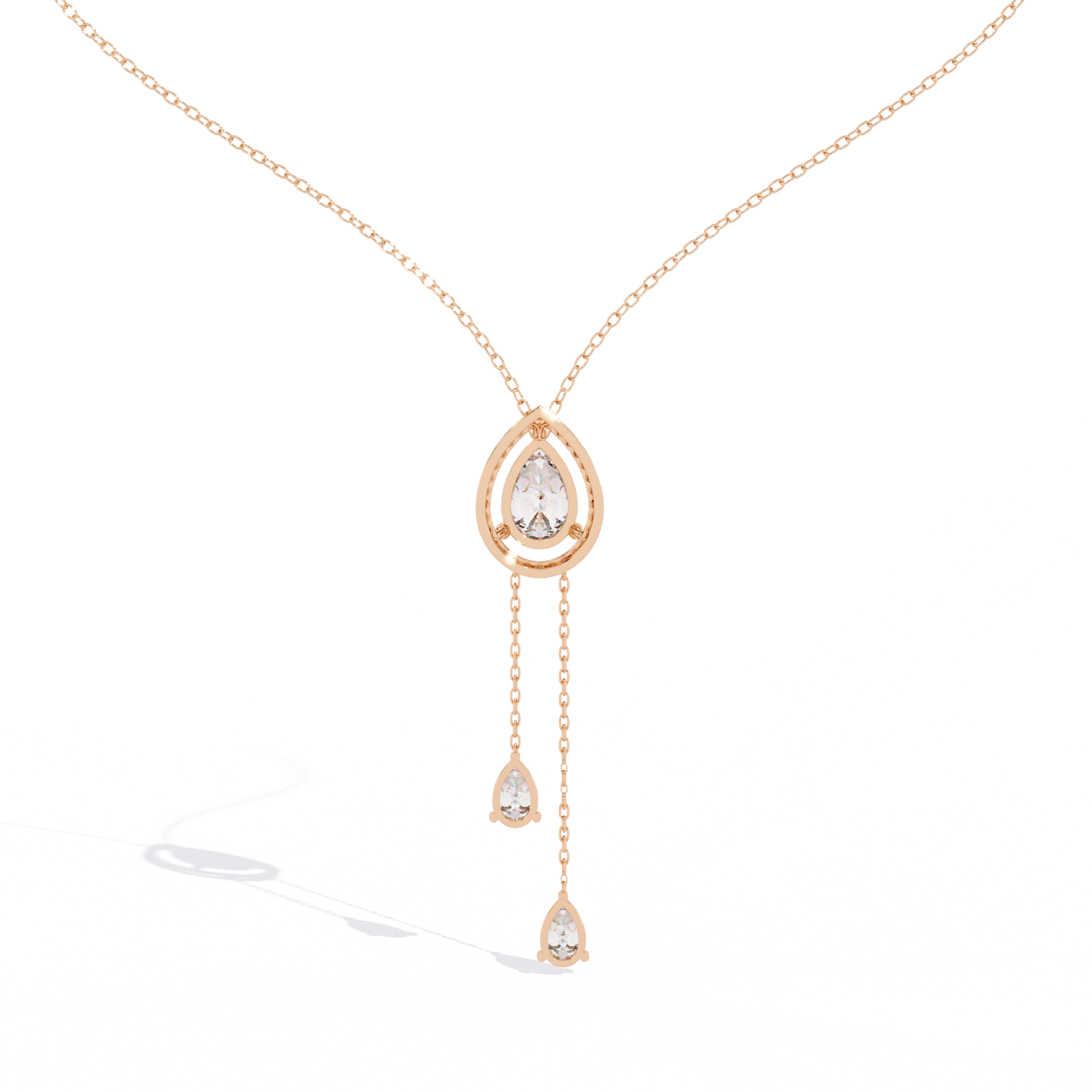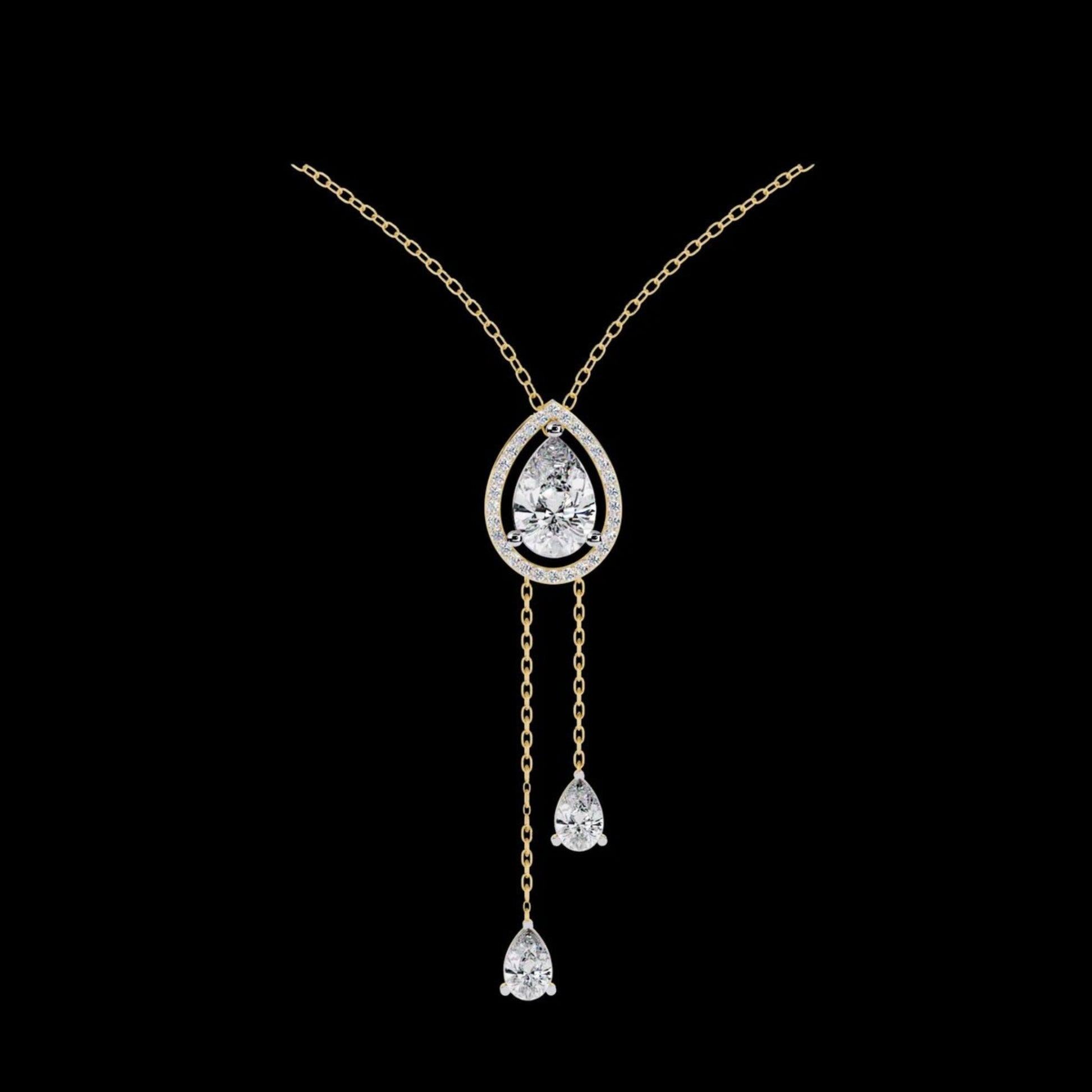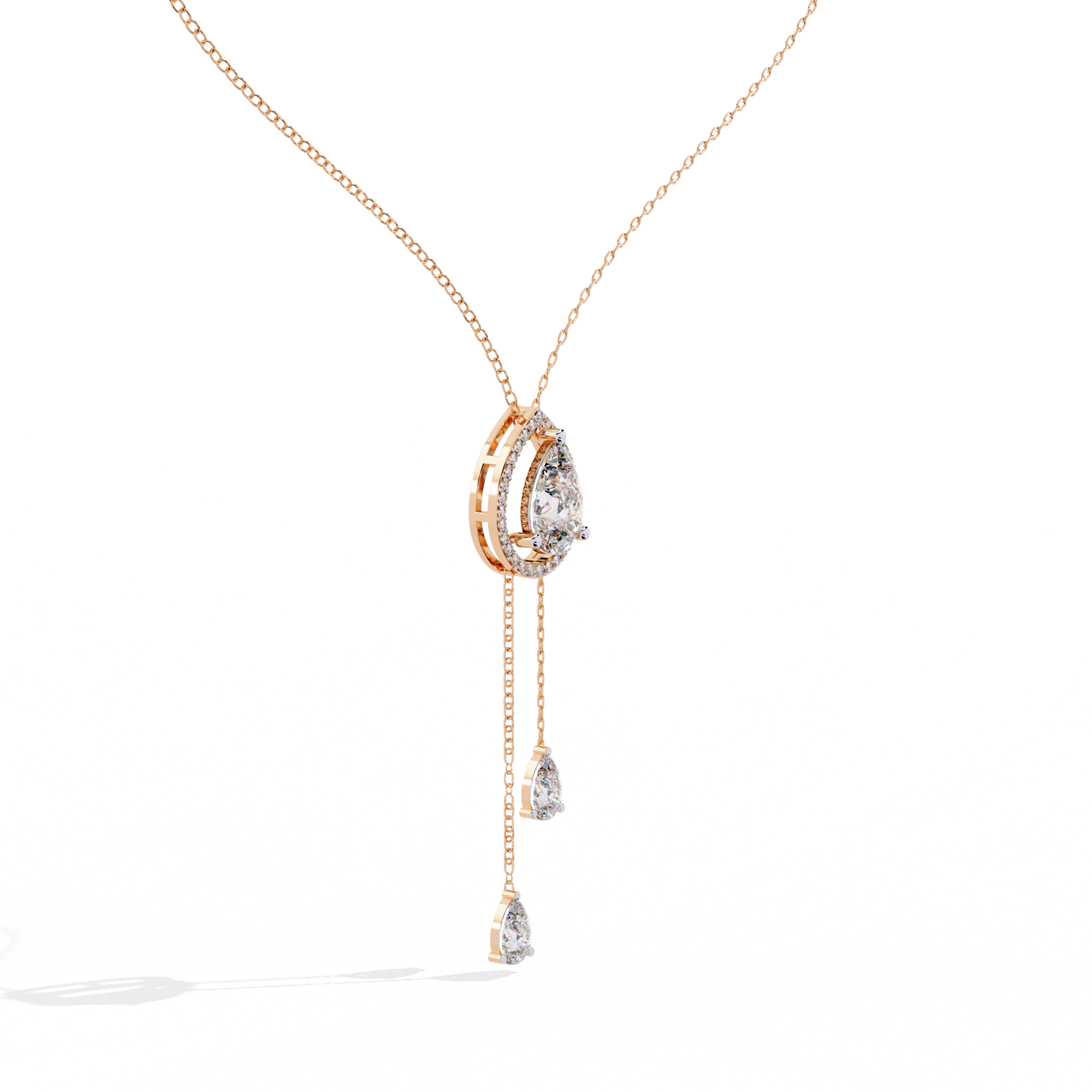 Introducing the Ivevar Luxury Teardrop Diamond Necklace, a masterpiece of timeless sophistication. This exquisite piece features a brilliant pear-shaped Diamond centerpiece, surrounded by a delicate halo of shimmering stones, gracefully suspended on a fine rose gold chain. Two dainty drops elegantly extend from the pendant, adding movement and allure to every turn. Perfect for weddings, anniversaries, or any moment that deserves a touch of luxury, this necklace embodies elegance and radiant beauty.