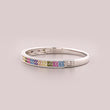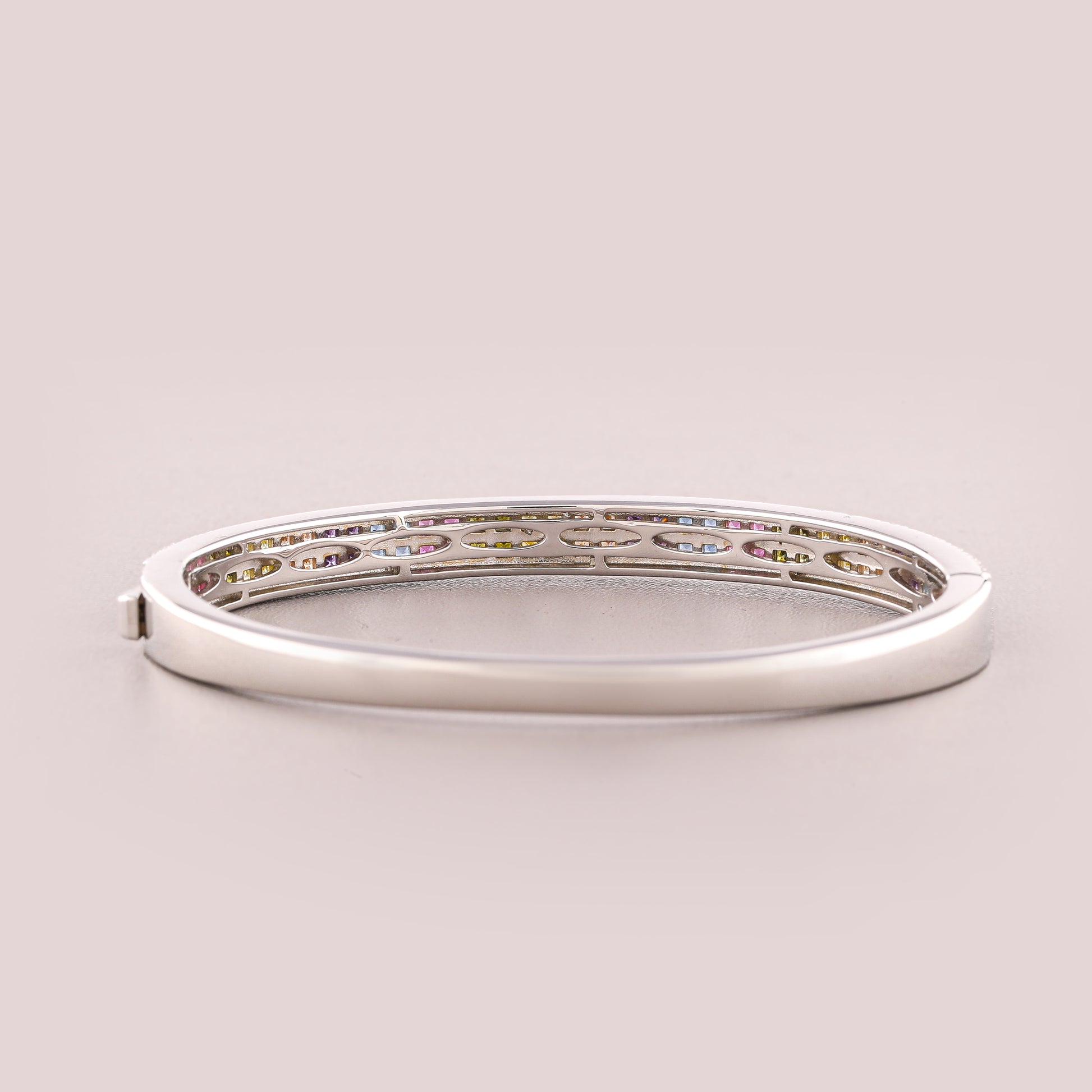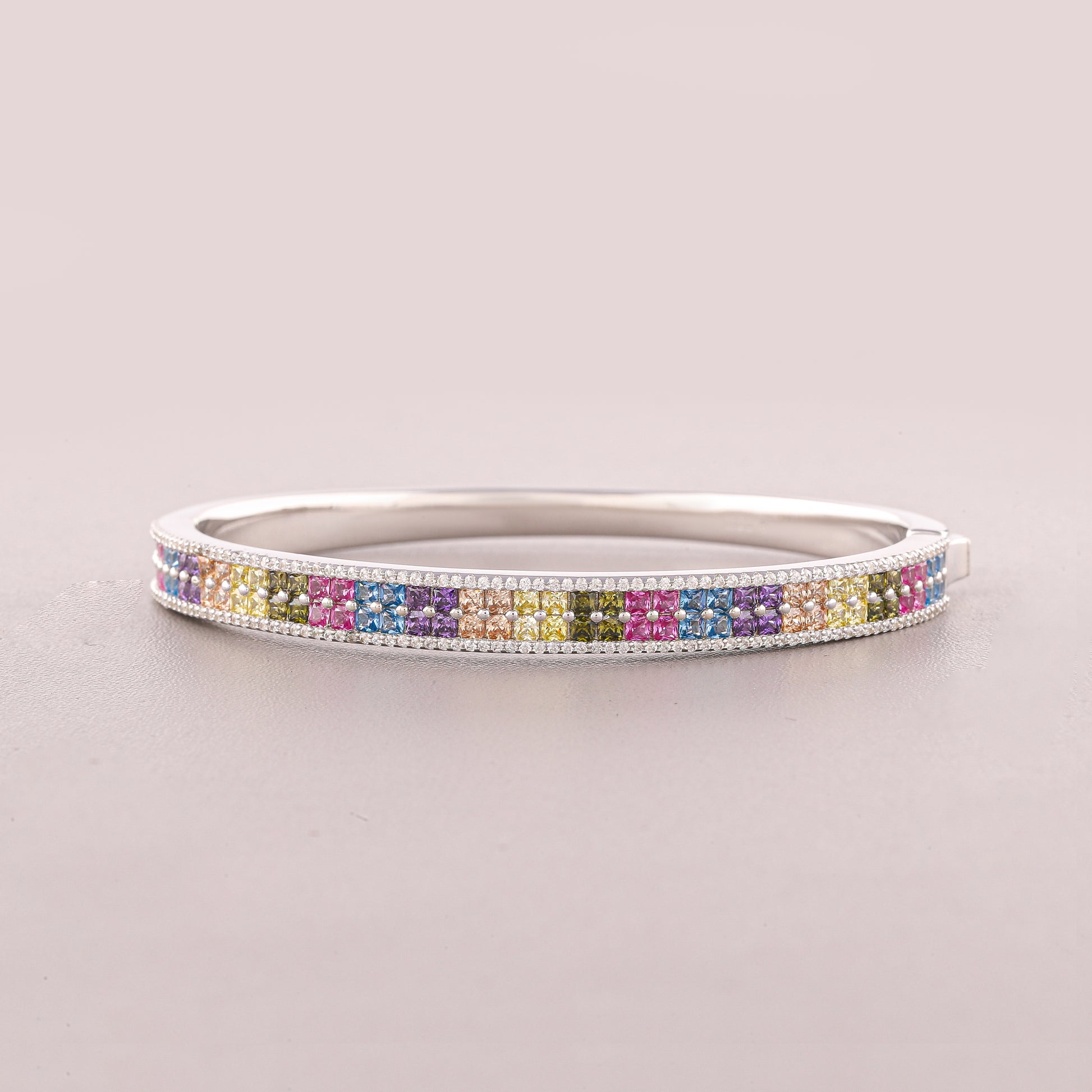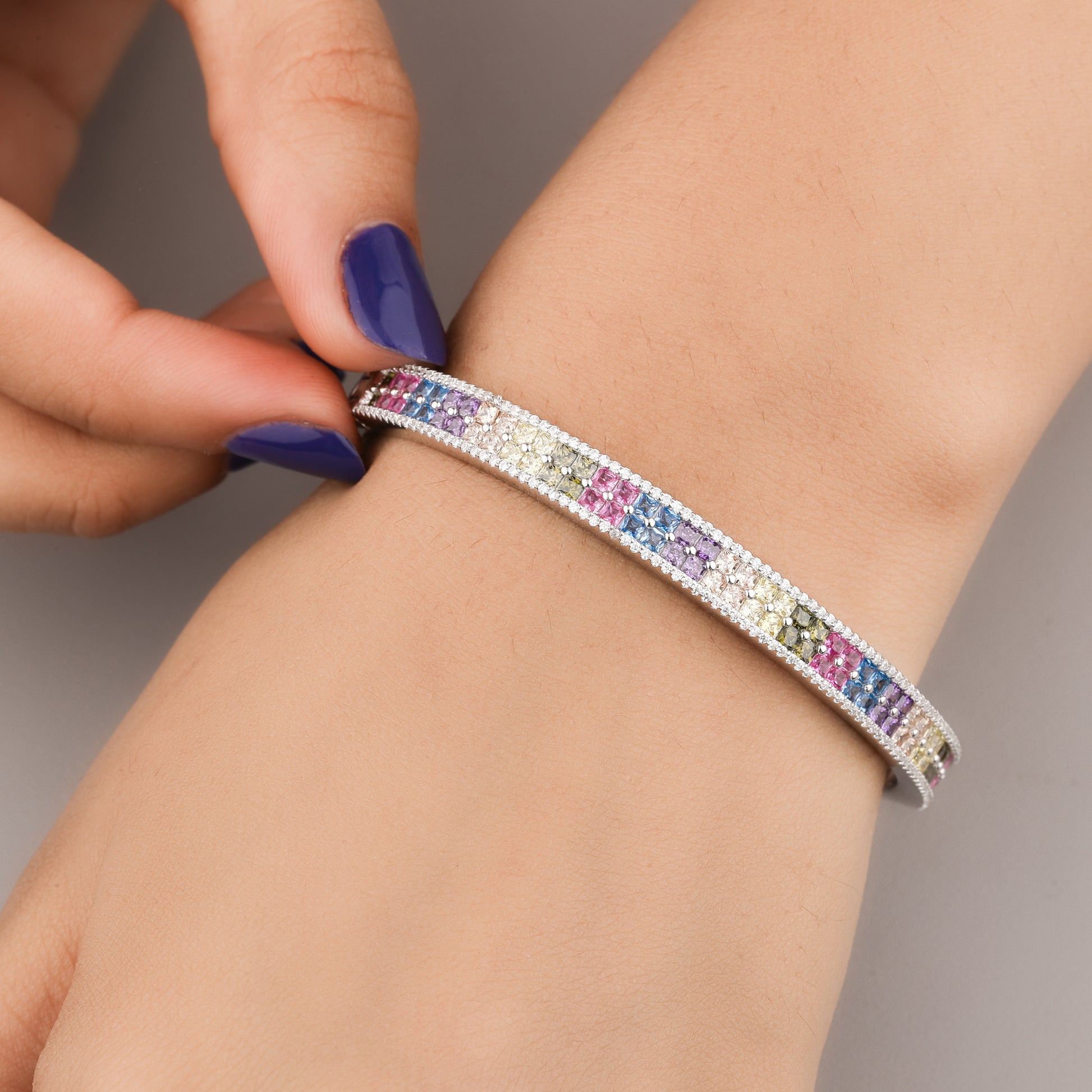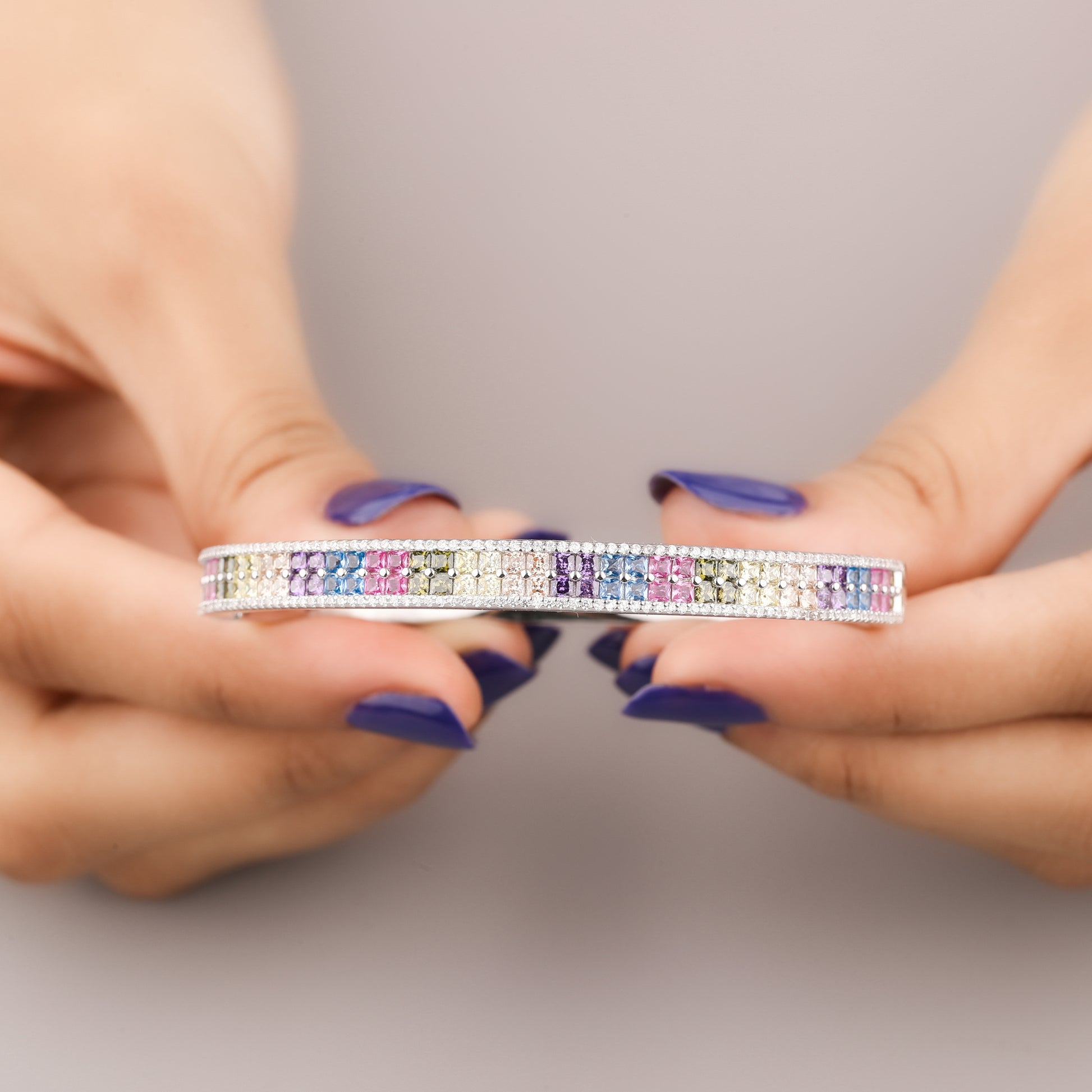 This image features a stylish Silver-Tone Dual-Row Rainbow and Clear Gemstone Bangle Bracelet. The bangle has a substantial yet elegant design, with its surface divided into two parallel rows. One row is set with Princess-cut stones in a vibrant, continuous "natural rainbow" sequence, featuring colors like pink, blue, purple, yellow, and green. The adjacent row is set with small, brilliant-cut clear stones (likely white diamonds or cubic zirconia) for added brilliance. This dual-row design offers a sophisticated blend of intense color and classic sparkle, making it a luxurious statement piece perfect for formal events or as a colorful accent in a bracelet stack.