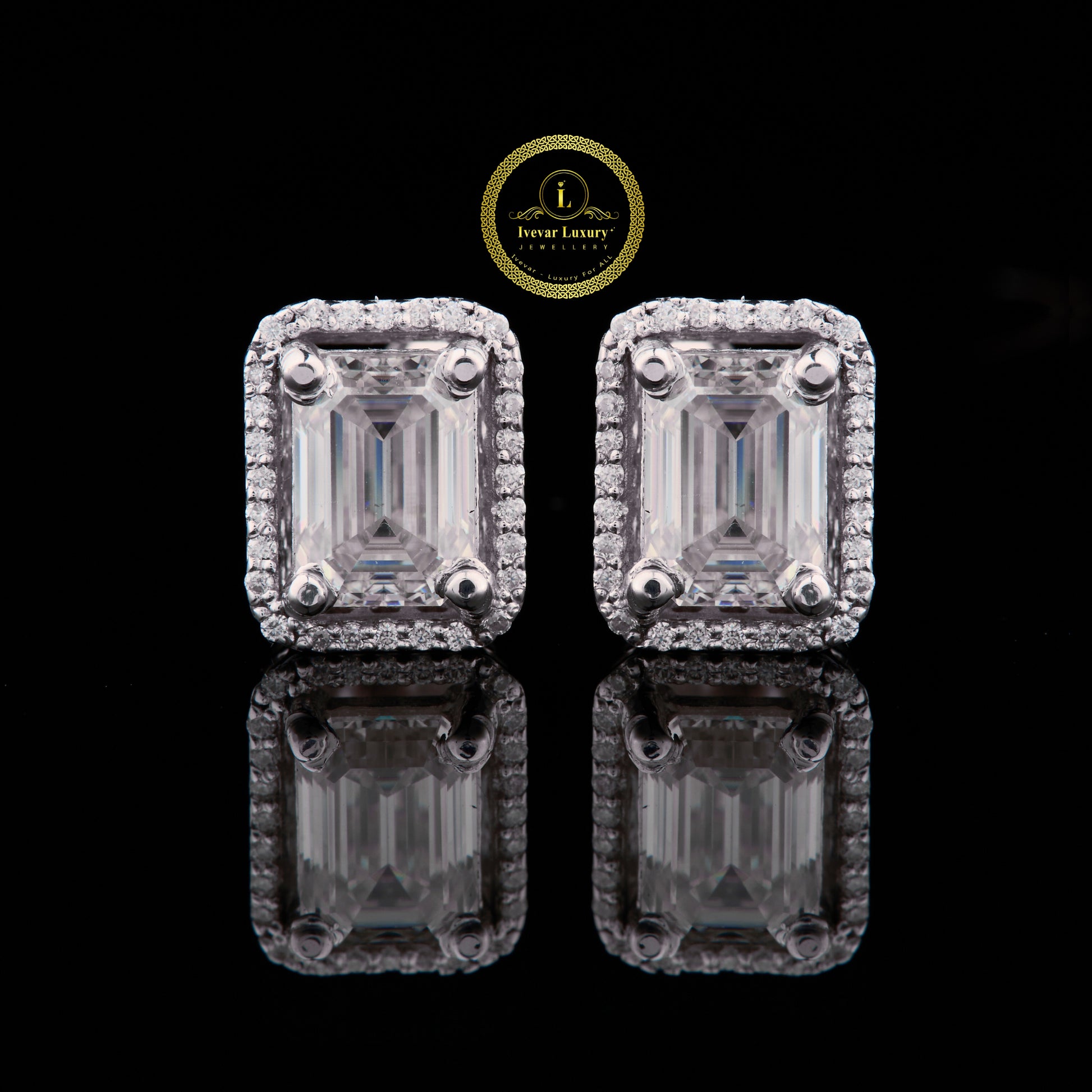 Emerald Cut Diamond Halo Earrings in White Gold | Sleek, Elegant Studs by Ivevar Luxury