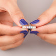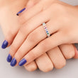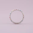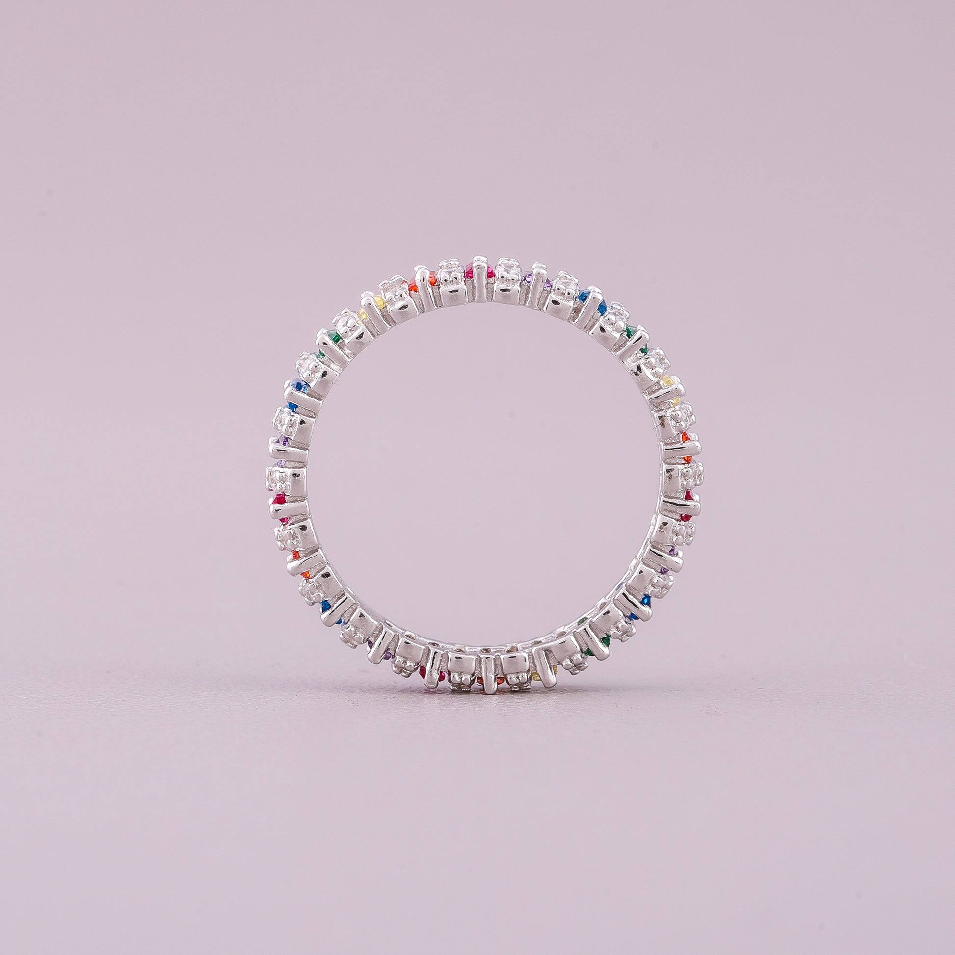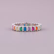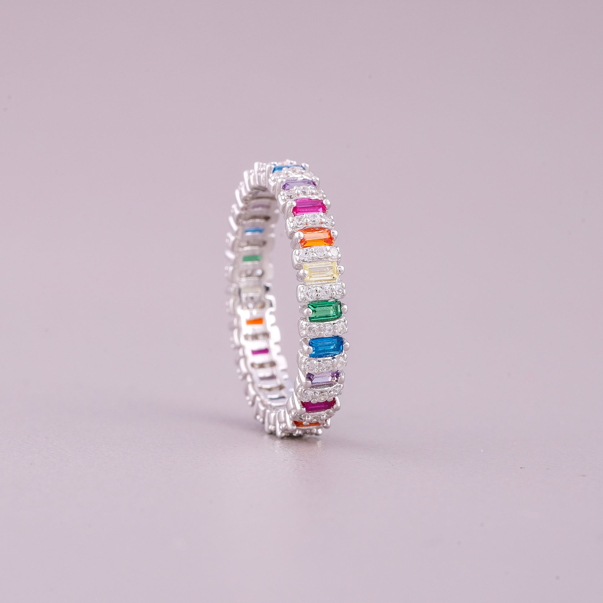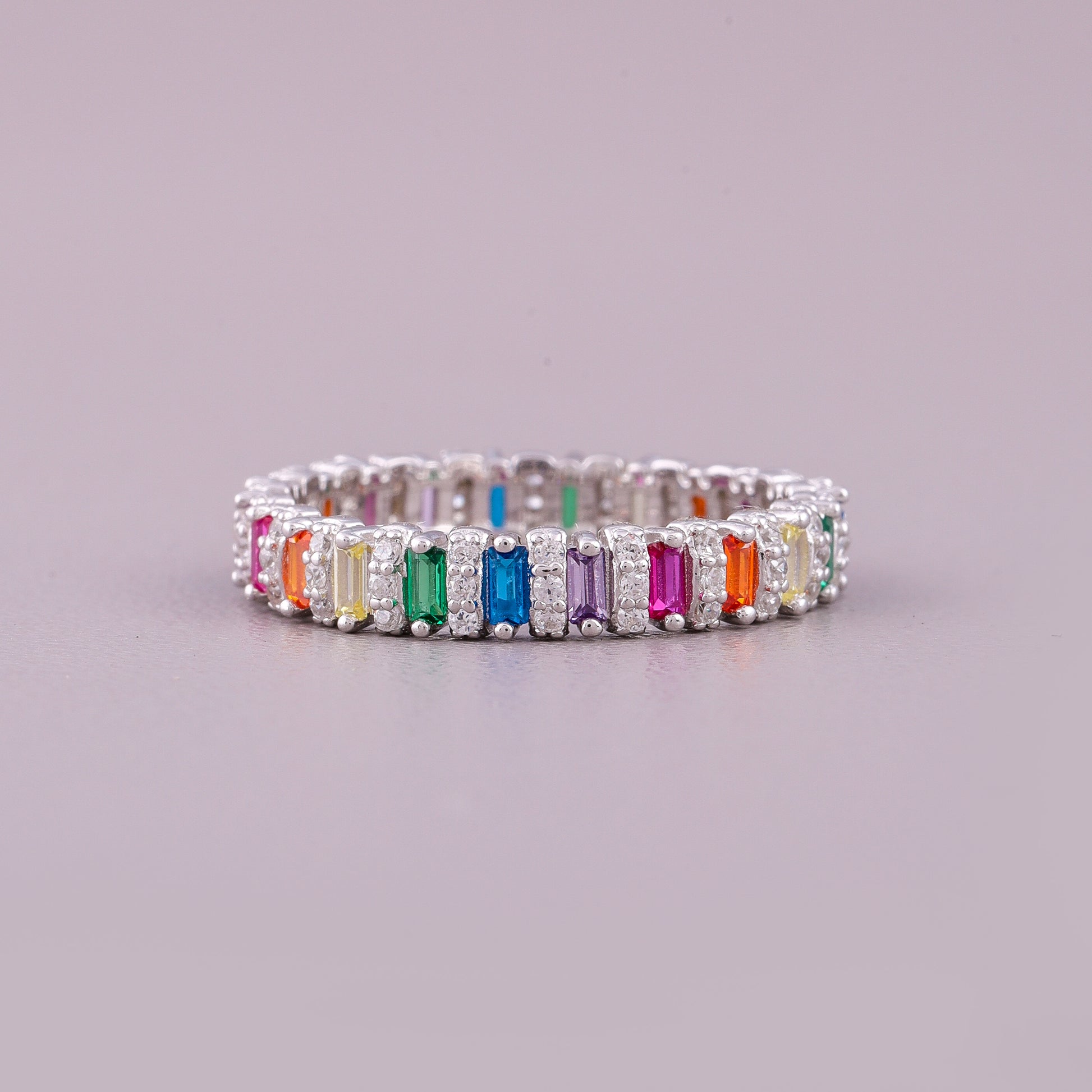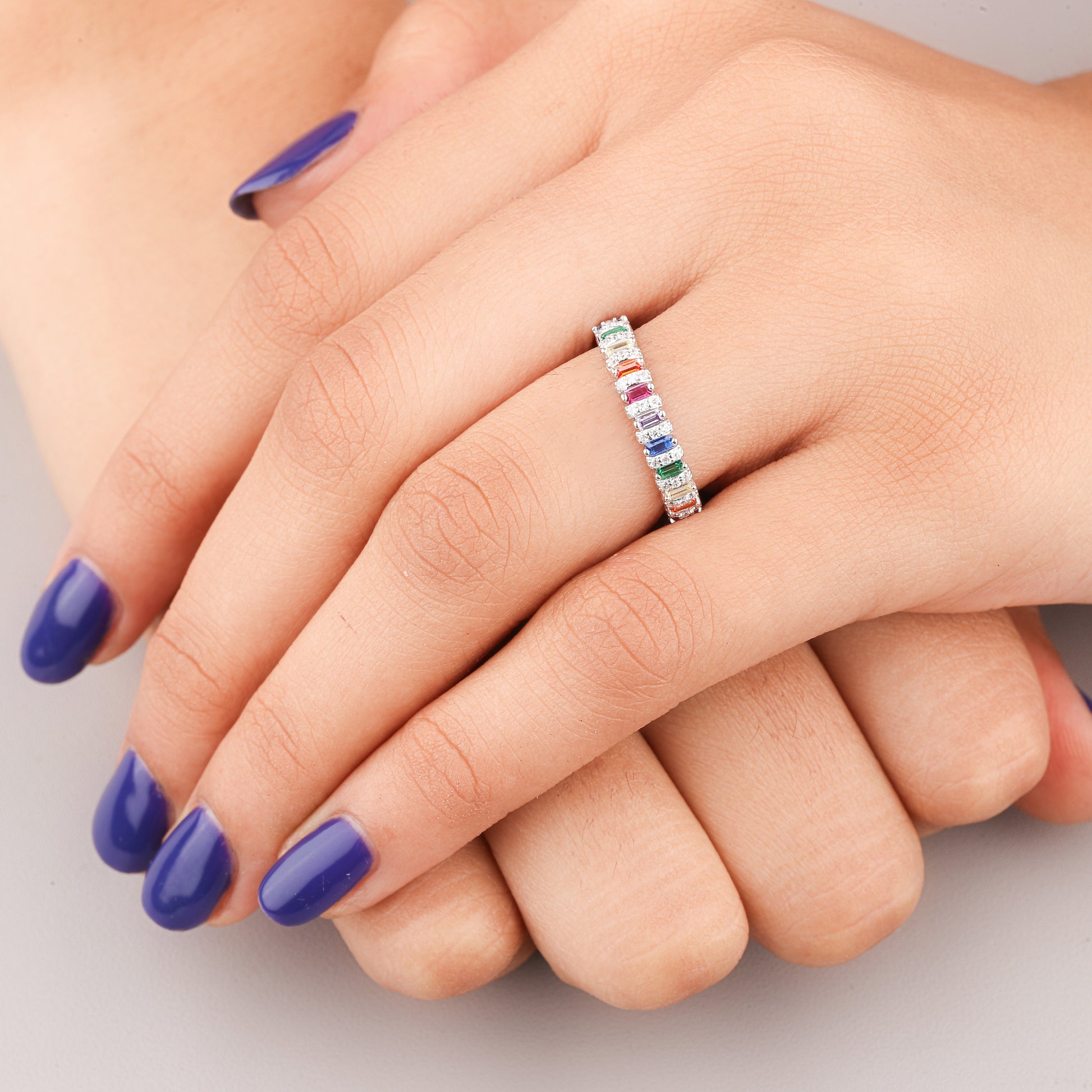 This elegant natural sapphire diamond ring features a row of beautifully aligned, baguette-cut colored sapphires that span the top of the band. The colors are deliberately arranged in a charming, pastel-like sequence, including delicate pink, orange, blue, and green hues. The colored sapphires are interspersed or bordered by small, glittering white diamonds, enhancing the brilliance and adding definition to the geometric setting. This style is a classic full-eternity band, offering a sophisticated and colorful look. It's an ideal choice for a subtle yet impactful everyday accessory or as a unique commitment ring.