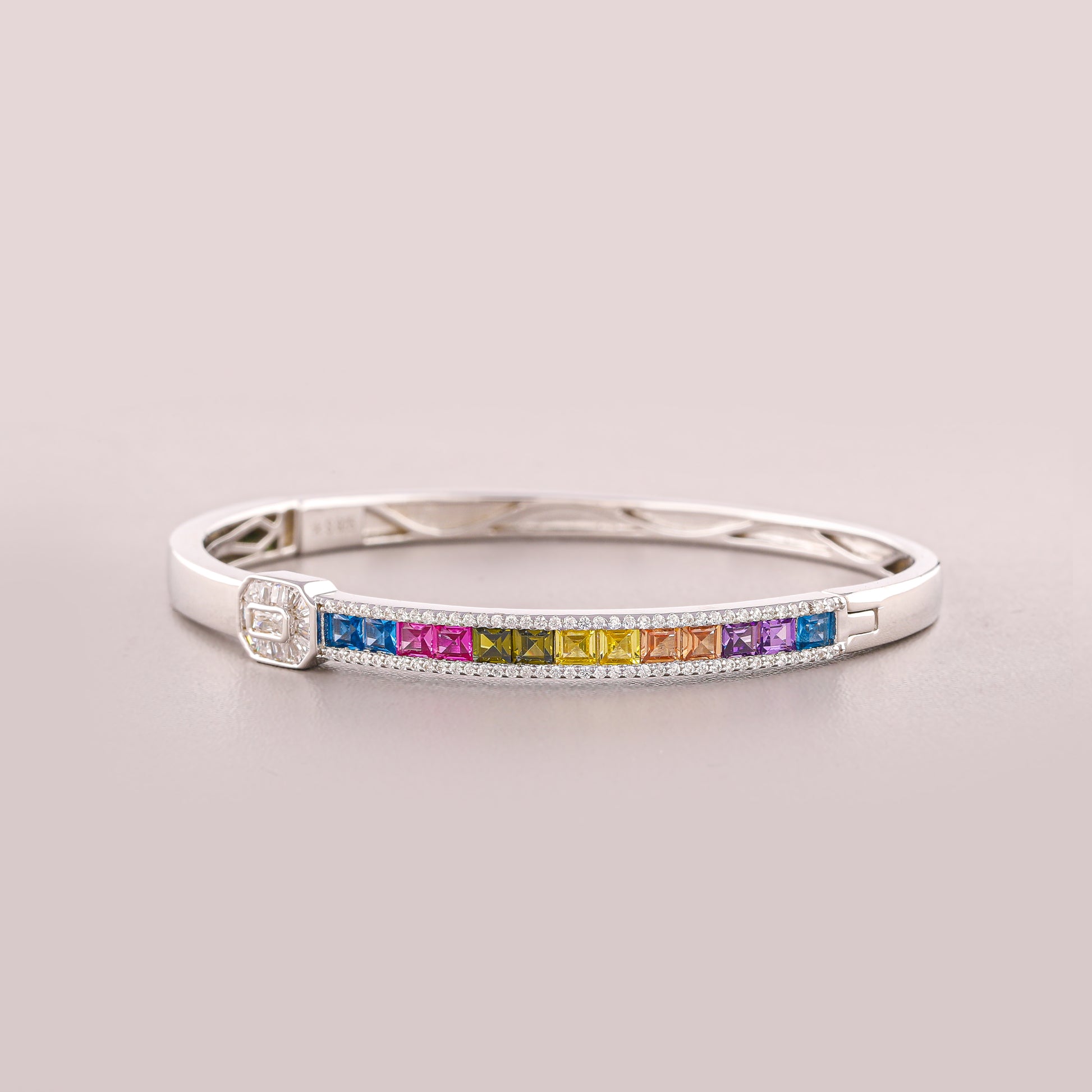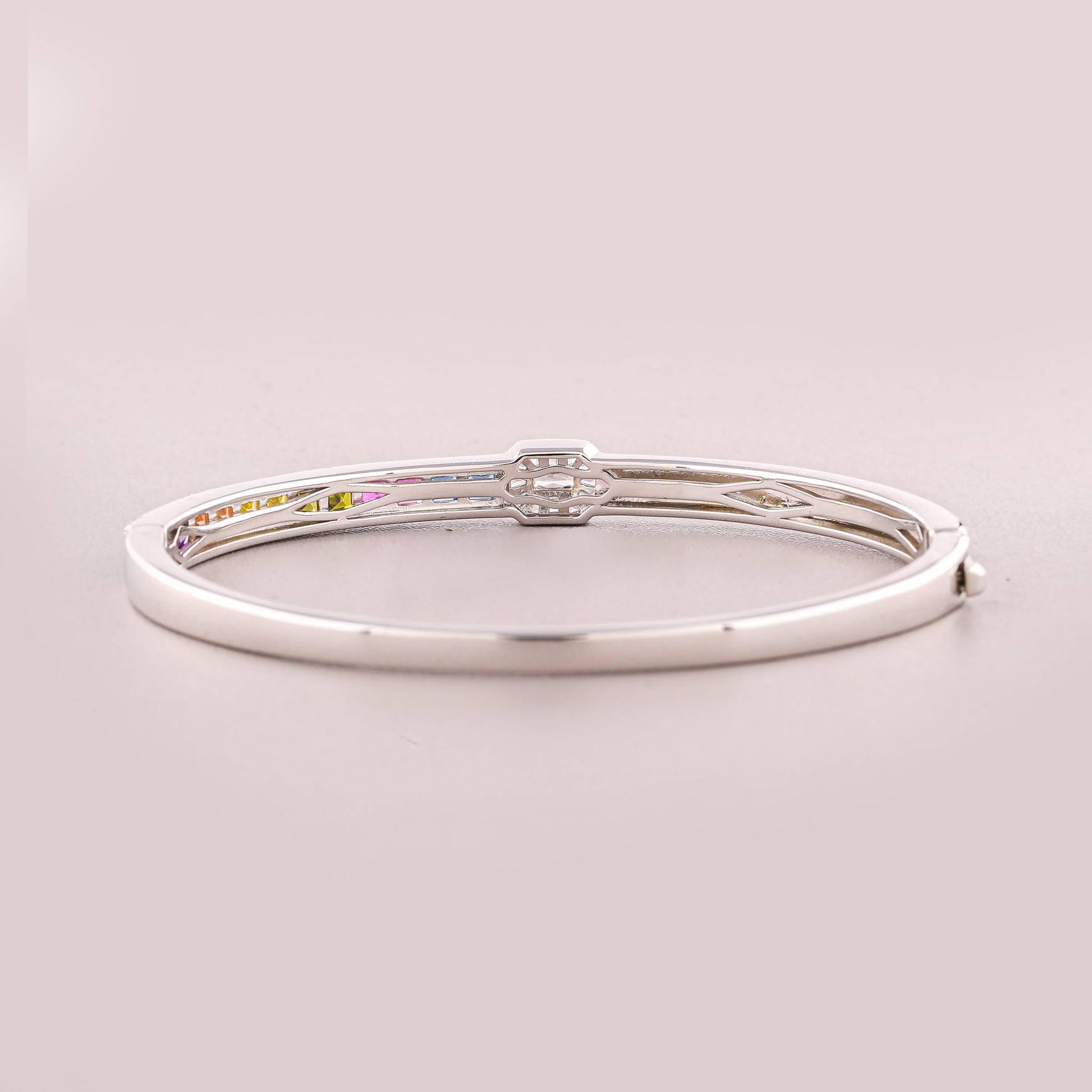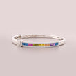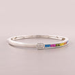 This image features a gorgeous Silver-Tone Rainbow and Clear Gemstone Bangle Bracelet with a stylish, contrasting design. The bangle has a substantial, modern silhouette with two distinct halves. The majority of the bangle is smooth, highly polished silver-tone metal. The opposite half features a captivating arrangement: a central row of uniformly sized, naguette-cut stones in a vibrant "natural rainbow" spectrum (including blue, pink, yellow, and green). This colorful row is framed by small, pave-set clear stones. The central baguette-cut clear diamond cluster acts as the visual transition point, providing a perfect blend of bold color and classic sparkle.