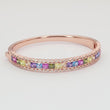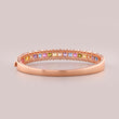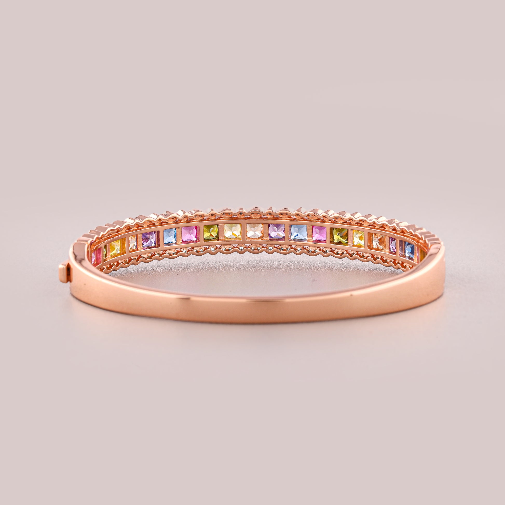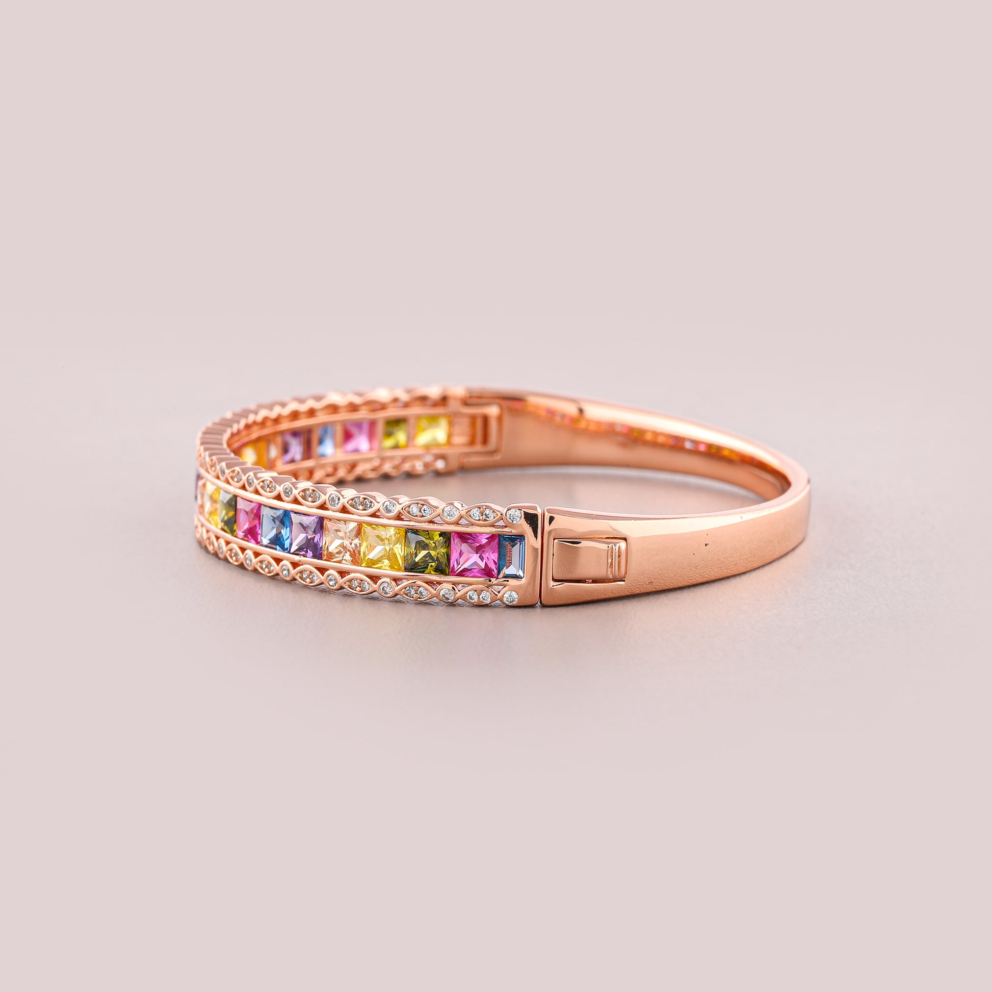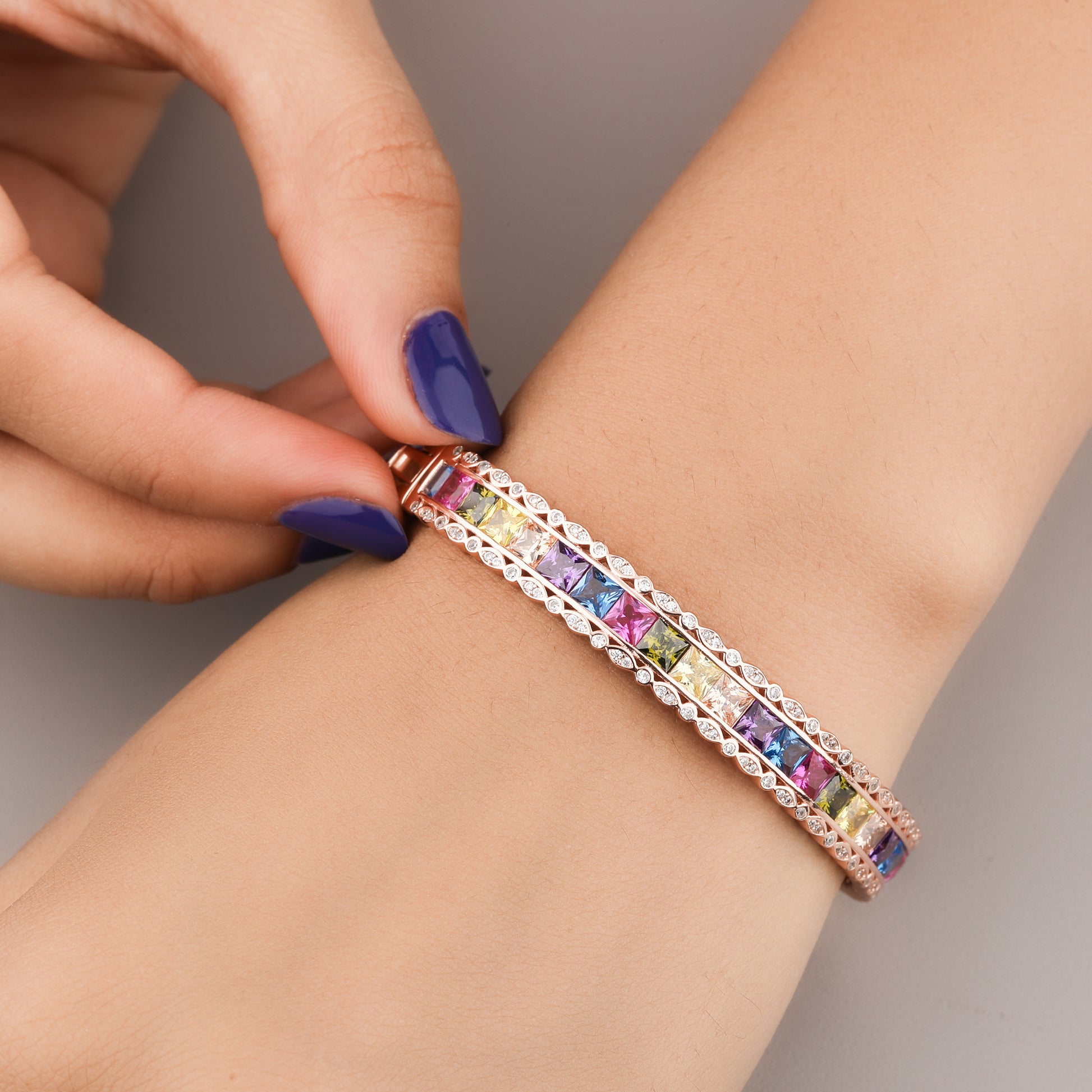 This vibrant bracelet is a true celebration of color and style! With its dazzling square-cut rainbow stones framed in a rose gold setting and delicate border of sparkling crystals, it makes a strong fashion statement. Perfect for those who love to stand out with elegance. 💖✨