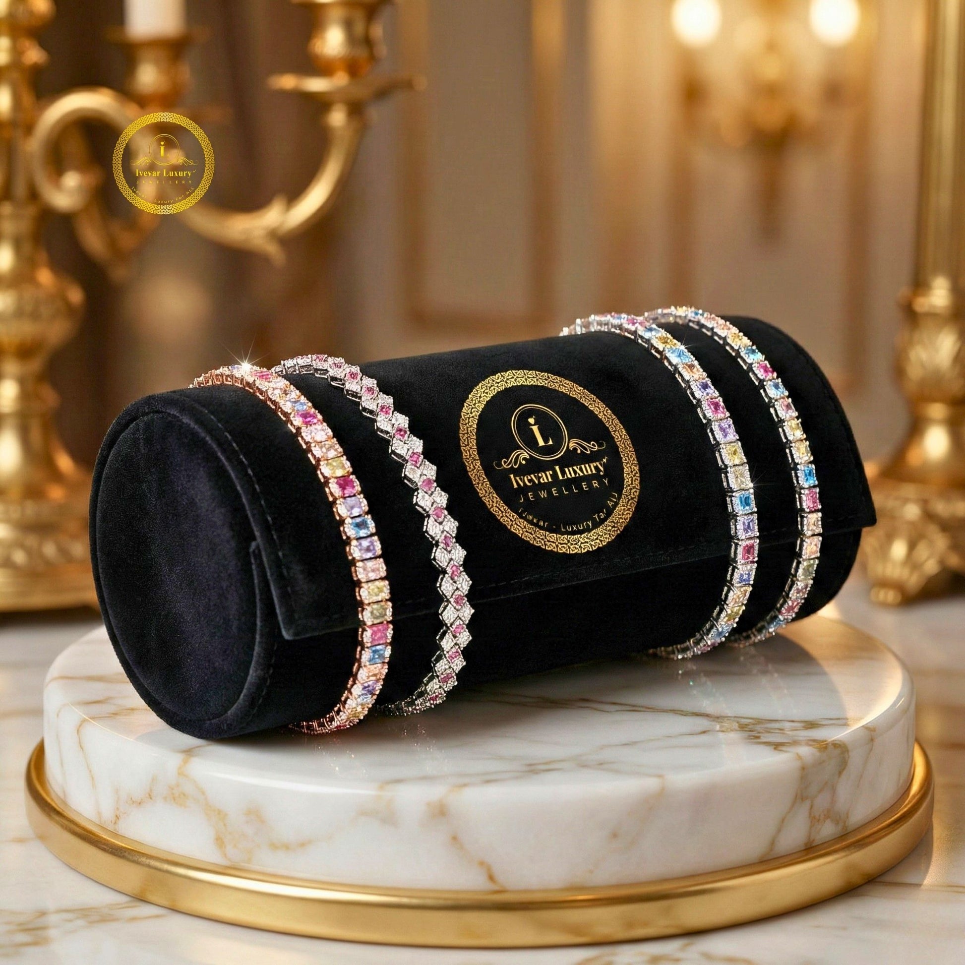 Set in what appears to be sterling silver or white gold, the vibrant array of colors creates a lively, eye-catching effect, making it a unique and versatile piece of fine jewelry. It's a contemporary twist on the classic tennis bracelet, symbolizing joy and individuality. This piece would be perfect for adding a pop of color to any outfit, from casual wear to formal attire.