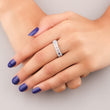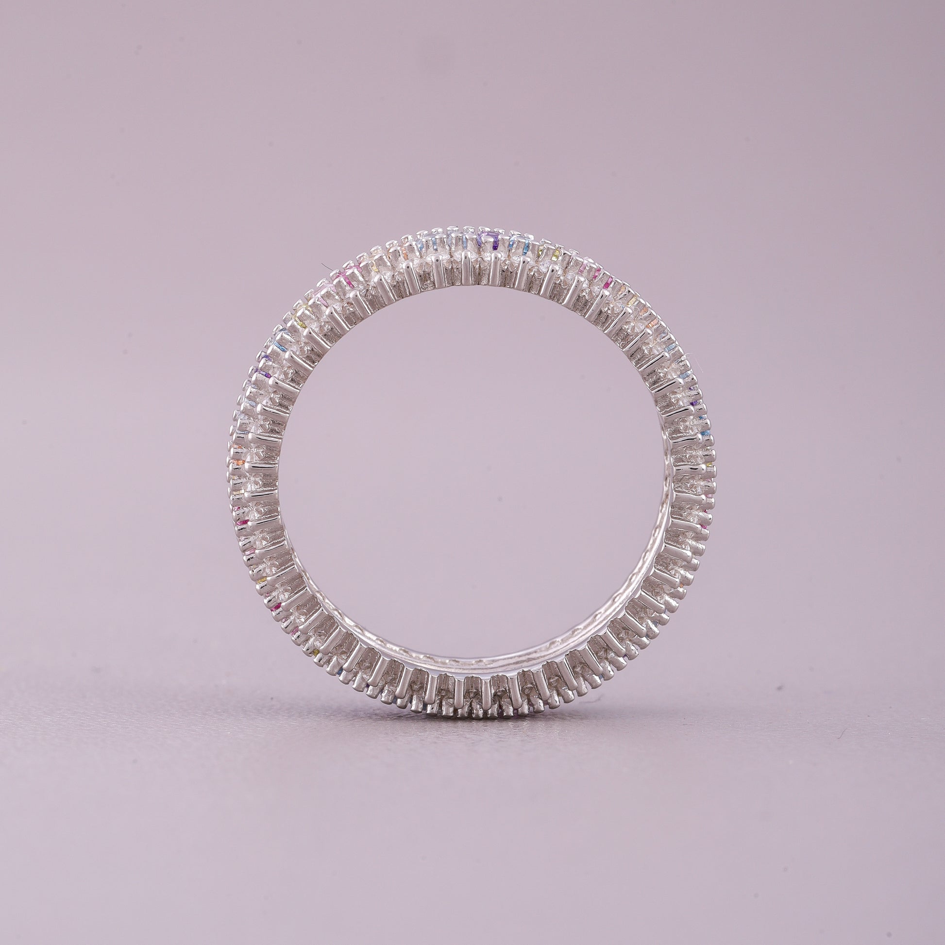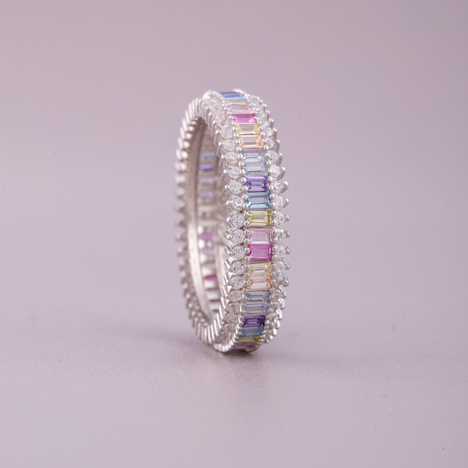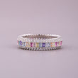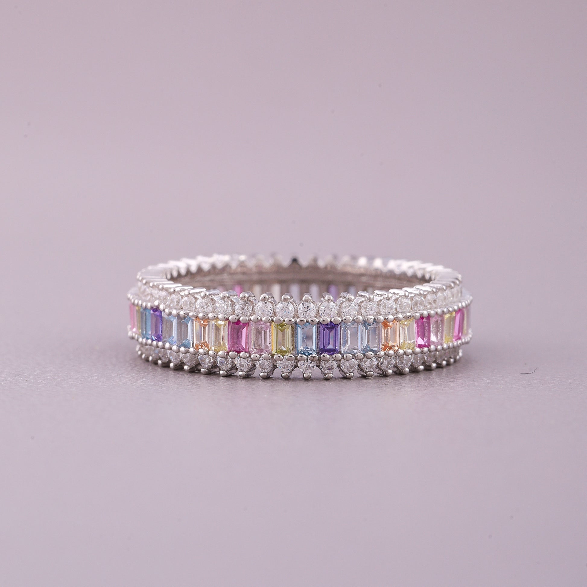 This elaborate and colorful eternity band features a continuous rainbow spectrum of natural baguette-cut sapphires, set in a brilliant white metal. Unlike bolder rainbow pieces, the sapphires here display softer, pastel hues, creating a delicate and whimsical look. This colorful central band is flawlessly framed by two continuous rows of brilliant, round-cut diamonds, which are meticulously prong or pavé-set along the upper and lower edges. The multi-row design and the subtle color gradation in the sapphires provide remarkable depth and sparkle. This ring is a glamorous, contemporary statement piece, perfect for celebrating joy and color while maintaining luxurious elegance.