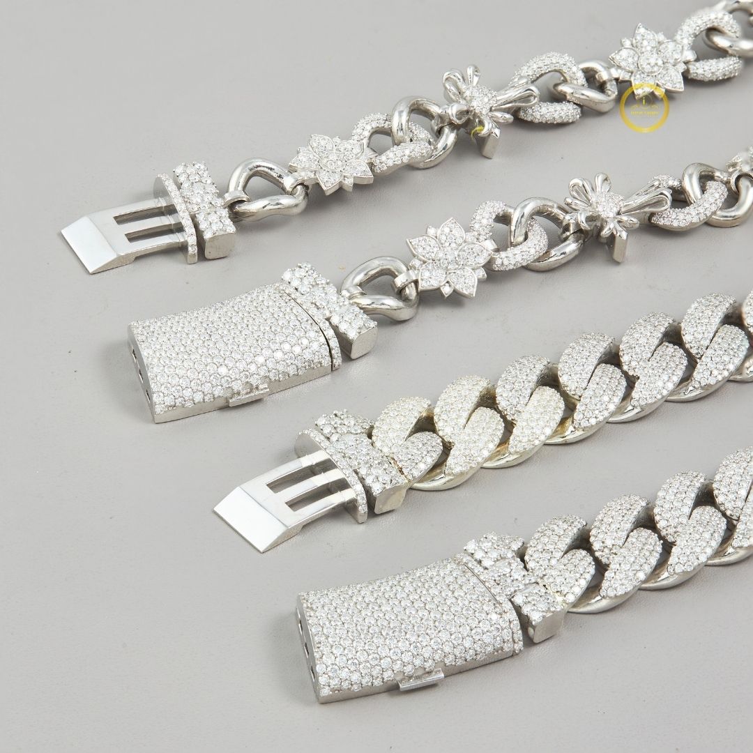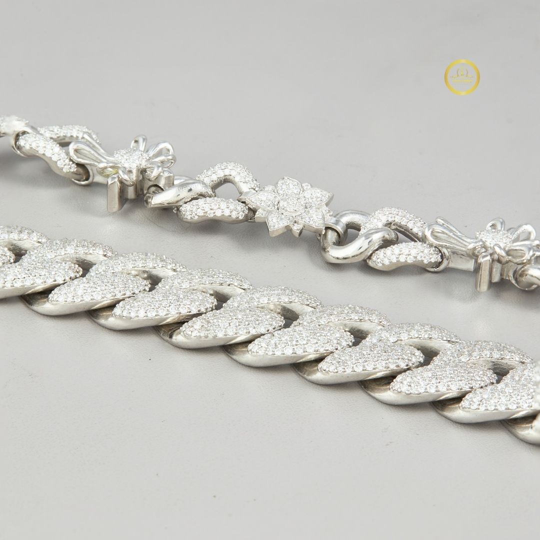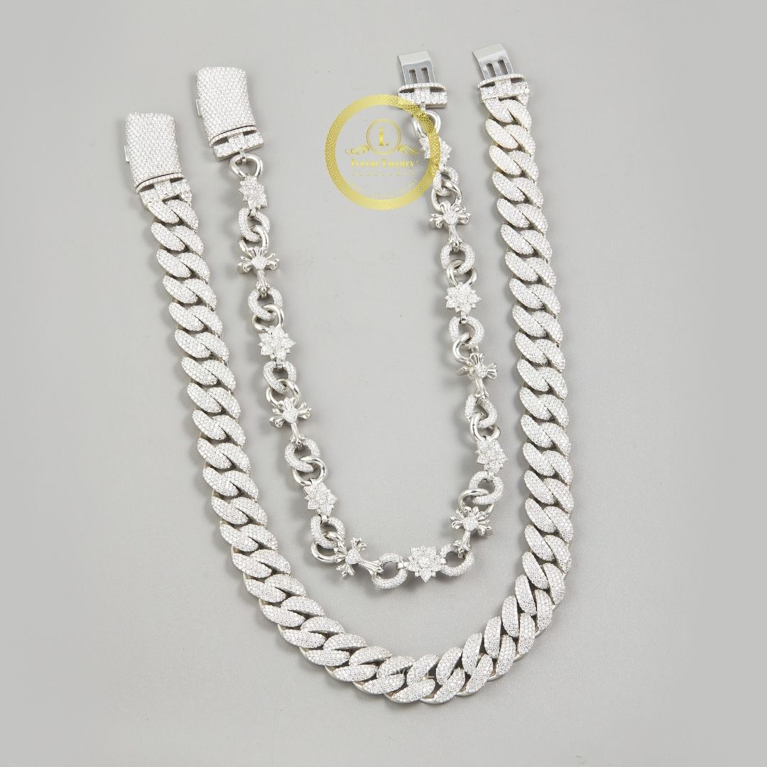 This image displays a stunning set of custom jewelry, likely a chain and a bracelet, featuring lab-grown diamonds set in a silver or white gold-tone metal. The longer piece showcases the popular Cuban link style, fully iced out with pave-set lab diamonds for maximum brilliance and a luxurious, heavy look. The second, thinner piece offers a more delicate, decorative link design, alternating between oval links and floral or cross-like motifs, also accented with sparkling lab diamonds. Both pieces feature secure, box-style clasps. This combination offers a versatile layering set that perfectly blends bold, contemporary hip-hop aesthetics (Cuban link) with unique, intricate detailing. Lab-grown diamonds provide an ethical and high-quality alternative to natural diamonds.