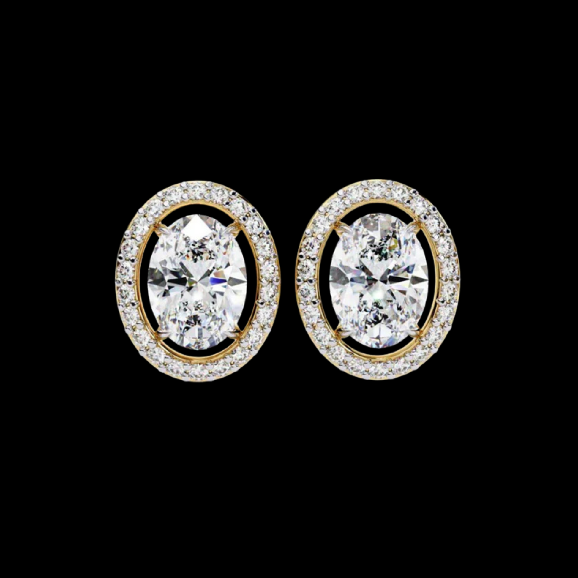 These exquisite stud earrings feature dazzling oval-cut center stones framed by a halo of smaller sparkling round diamonds, all set in a lustrous gold-toned setting that elevates their luxurious appeal. The intricate halo design enhances the brilliance of the central gems, creating a radiant, eye-catching shimmer from every angle. Their elegant oval silhouette and refined craftsmanship make them a timeless accessory—perfect for adding a touch of sophistication to formal attire or enhancing everyday elegance.