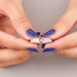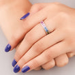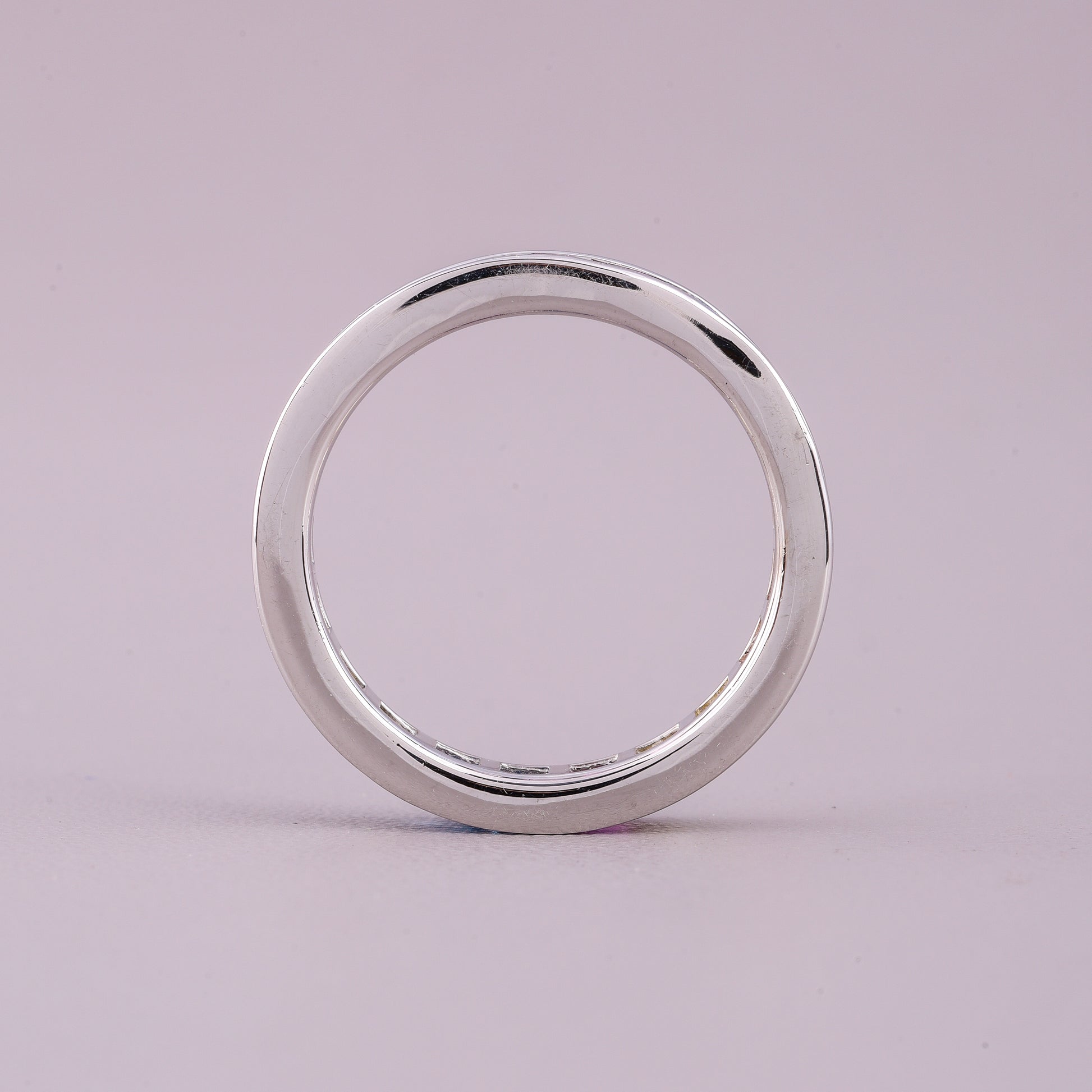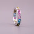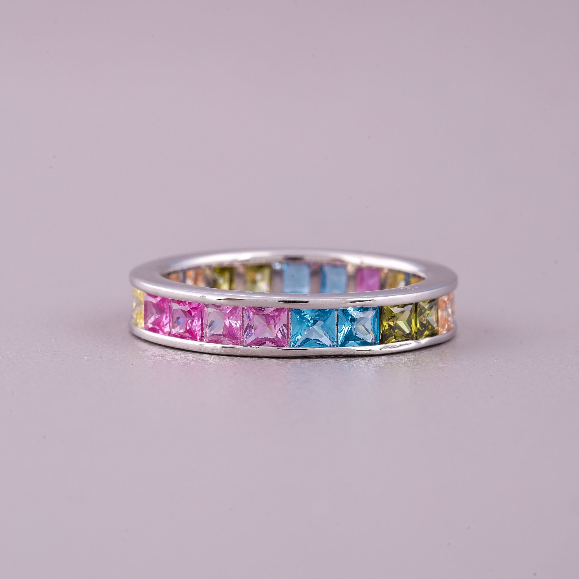 This appealing natural sapphire diamond ring showcases a continuous row of princess-cut colored sapphires that elegantly wrap around the band, suggesting a full eternity style. The sapphires display a subtle, light-toned gradient or mix, featuring delicate shades of yellow, pink, and light blue. These vibrantly colored gems are bordered by twin rows of delicate, sparkling white diamonds, significantly enhancing the overall brilliance and definition of the design. Set in white metal, this ring offers a charming yet sophisticated blend of color and sparkle, making it a distinctive and delightful statement piece.