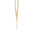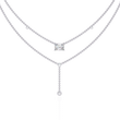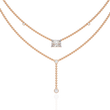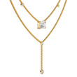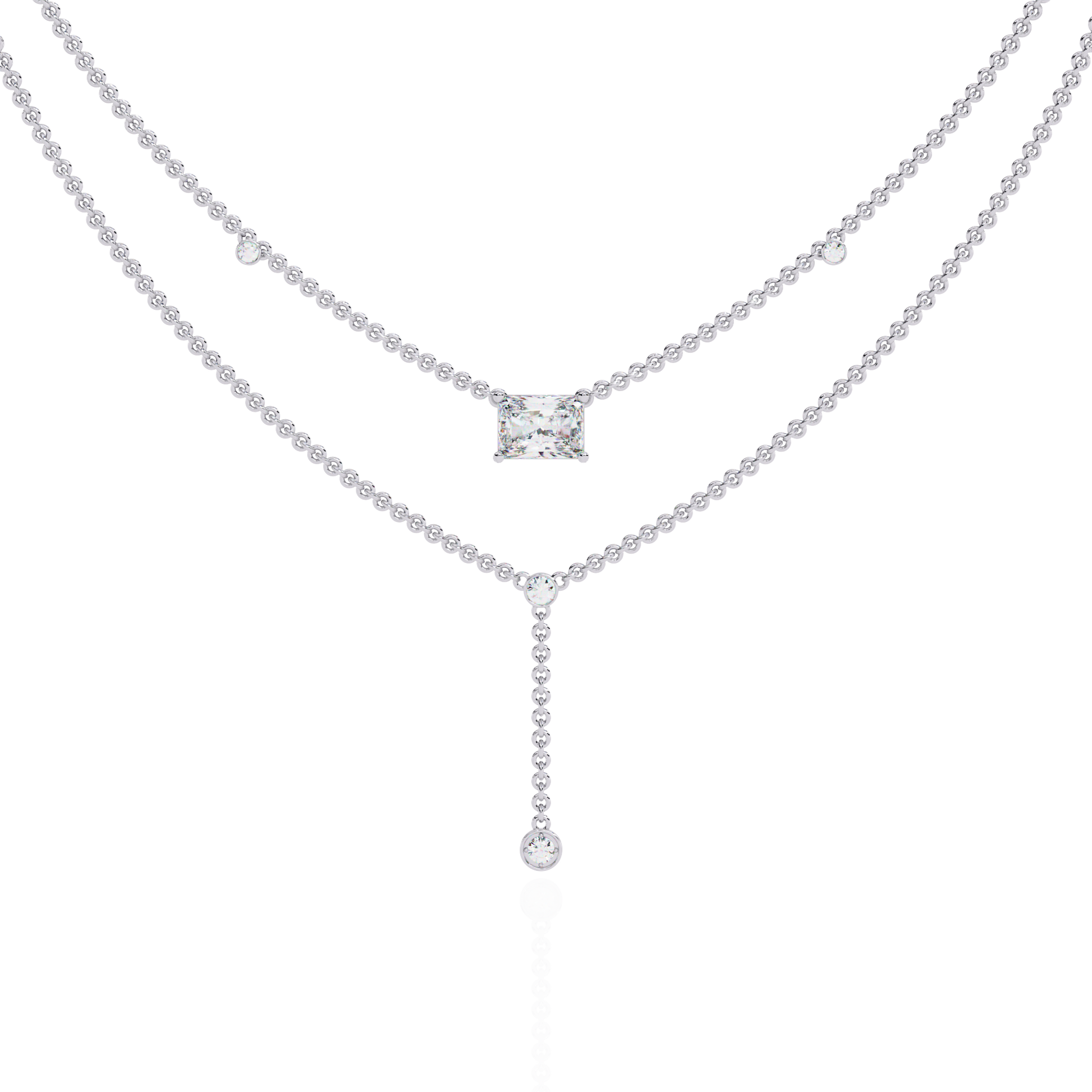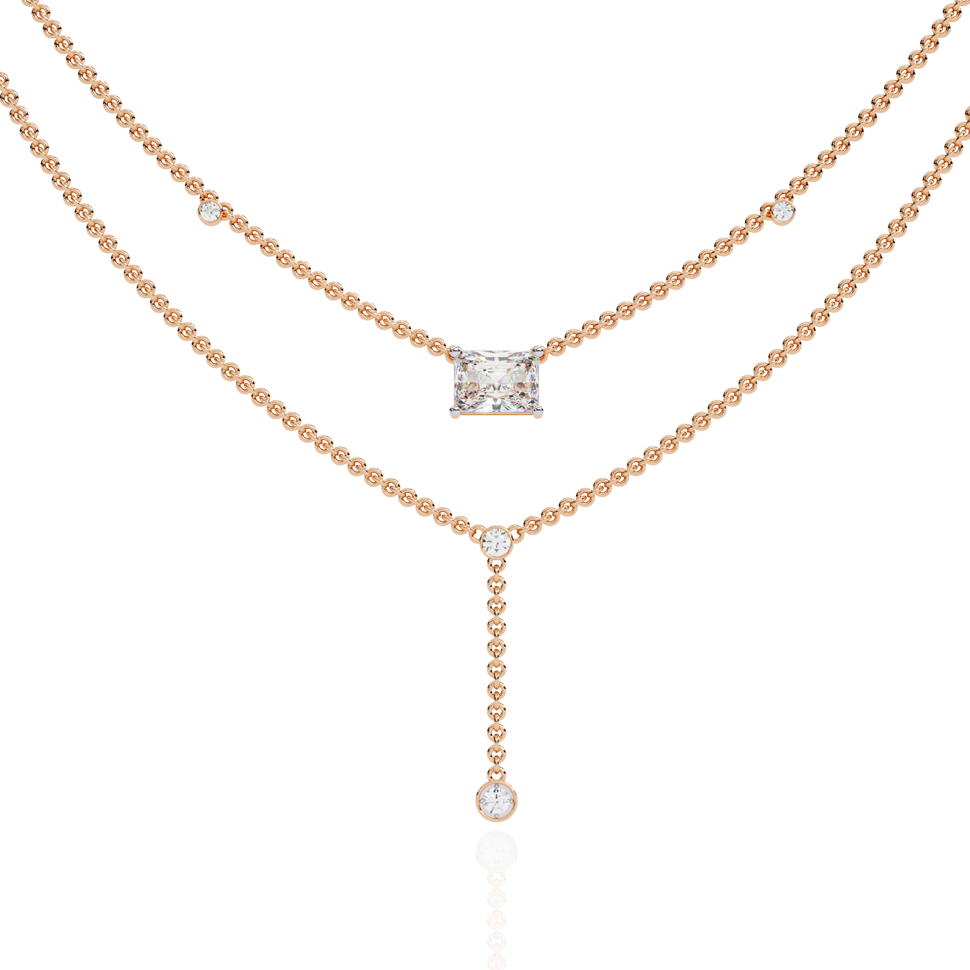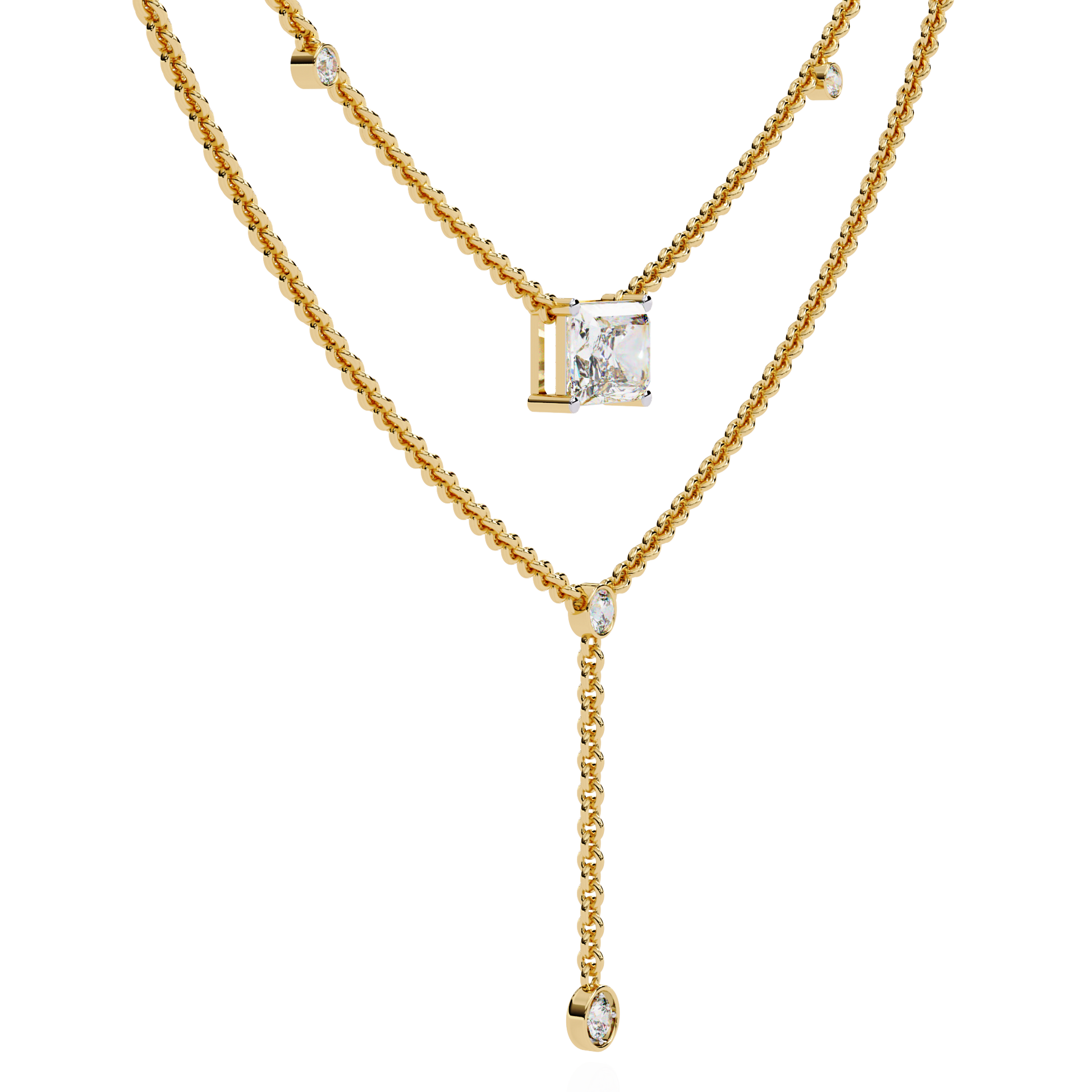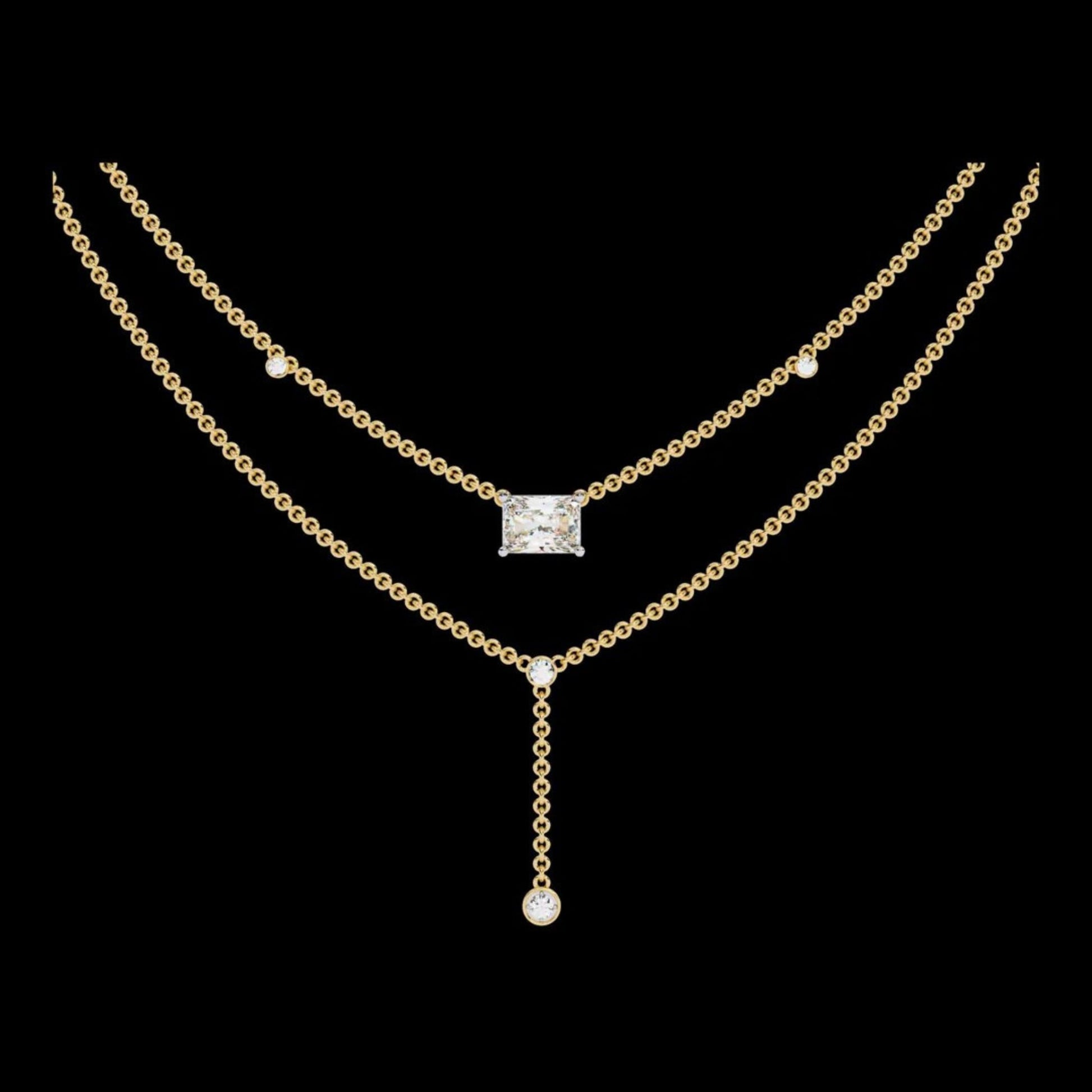 This exquisite layered necklace radiates modern sophistication, featuring two delicate gold chains adorned with shimmering diamonds. The upper layer showcases a Stunning Radiant Cut Centerpiece, while the lower chain elegantly drops into a single Round Diamond accent, creating a graceful Y-shaped silhouette. Perfectly balanced between elegance and allure, this design adds a touch of refined glamour to any outfit, making it ideal for both special occasions and everyday elegance by Ivevar.