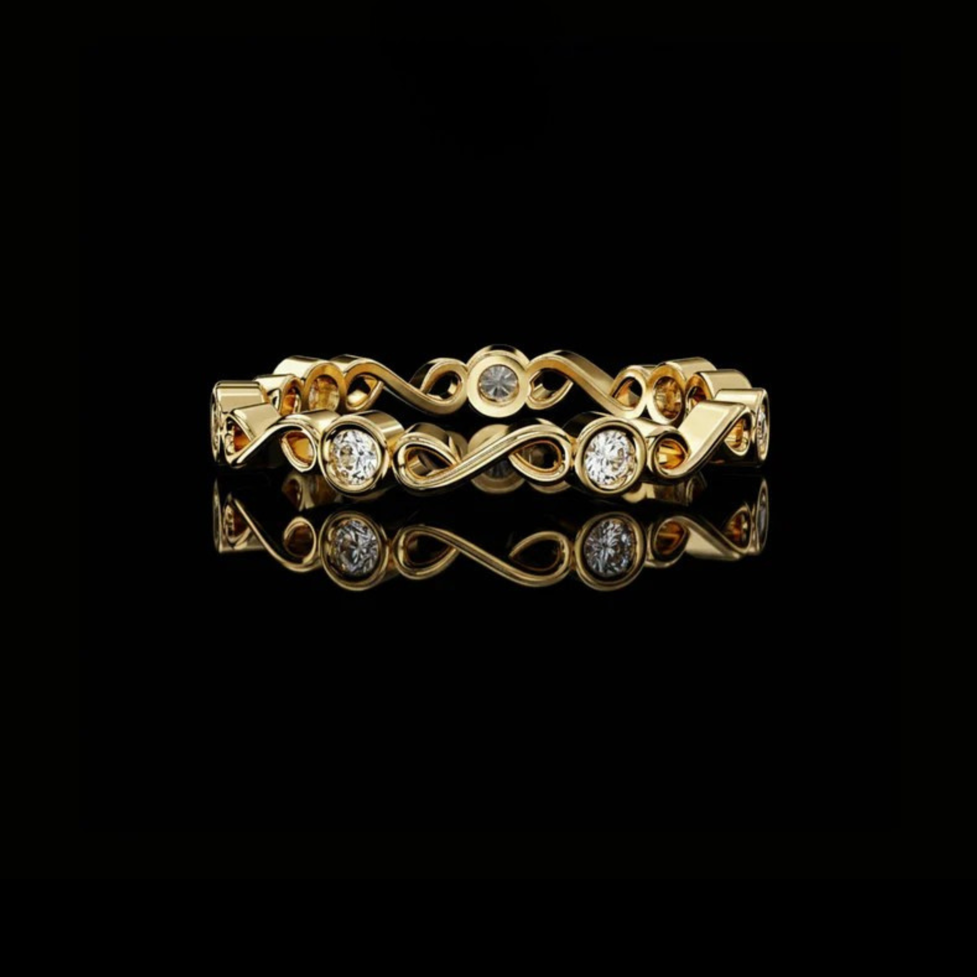 This exquisite ring features an unbroken infinity design crafted in Round gold, symbolizing everlasting love and timeless beauty. Each loop of the band is adorned with brilliant-cut diamonds set in smooth bezel settings, adding a touch of sparkle from every angle. Perfect as a promise ring, wedding band, or a meaningful anniversary gift, this piece blends delicate artistry with luxurious shine. Its intricate pattern and continuous diamond arrangement make it a truly unique and eye-catching accessory for any jewelry collection.