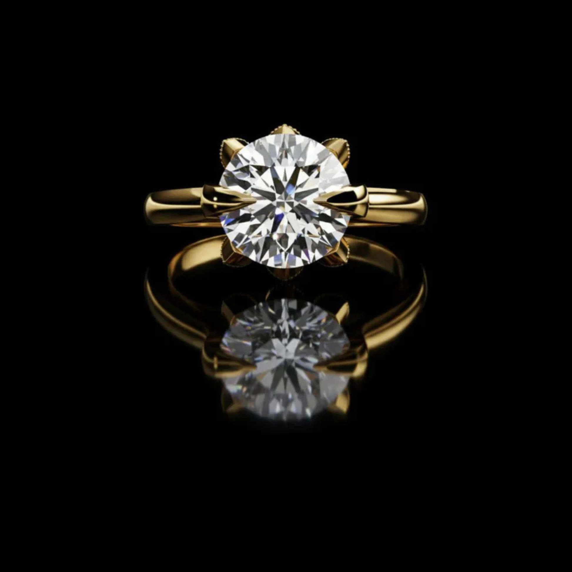 This stunning ring showcases a dazzling round-cut diamond secured in a refined eight-prong gold setting, blending classic elegance with modern sophistication. Its polished gold band gently tapers toward the center stone, drawing the eye to the diamond’s exceptional brilliance and fire. Set against a deep black background with a flawless mirrored reflection, the ring’s craftsmanship and luxurious materials are emphasized, giving it an aura of timeless beauty and enduring significance.