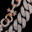 This image displays a magnificent, layered set of custom chains crafted with lab-grown diamonds and featuring a rich rose gold plating or setting. The dominant pieces are thick, fully iced-out Cuban links, where the surface is completely covered in pave-set lab-grown diamonds for maximum shine and a bold, luxurious statement. The set also includes a complementary, thinner chain with intricate decorative links—alternating between rose gold ovals and diamond-studded floral or cross-like motifs, providing an elegant contrast. The pieces showcase premium, robust clasps, also encrusted with diamonds. This combination is a fashionable example of bespoke, high-end jewelry, leveraging the ethical and brilliant nature of lab-grown diamonds for a striking, custom look.