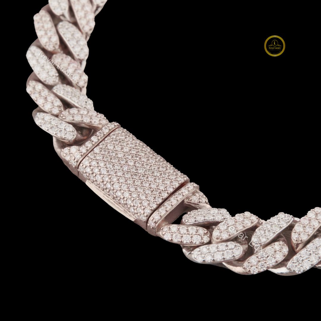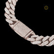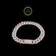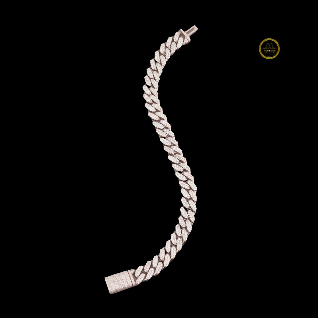 This heavy, luxurious bracelet features the timeless Cuban link design, crafted in a rose gold-tone metal. The entire surface is meticulously covered in small, brilliant-cut lab-grown diamonds using a dense pave setting, ensuring exceptional sparkle from every angle. This style, popularized in hip-hop and urban luxury, is a definitive statement piece. It features a substantial, integrated box clasp that is also fully paved with diamonds, creating a seamless and secure look. The use of lab-grown diamonds provides an ethical and high-quality alternative to mined diamonds for this iconic, high-end design.