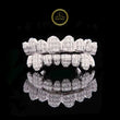 This stunning accessory is a complete set of custom grillz, covering the upper and lower teeth. Crafted from a high-polish white metal, the pieces are completely "iced out" using numerous baguette-cut lab-grown diamonds. This cut is stacked both vertically and horizontally across the teeth to create a brilliant, wall-to-wall shimmer. Unlike traditional pave settings, the baguette stones provide a sleek, stepped, and modern look. As custom-made dental jewelry, these grillz are precision-fitted to the wearer's mold for maximum comfort and an eye-catching, luxurious statement.