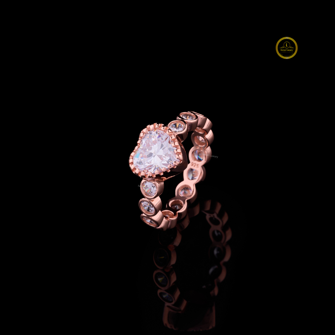 This stunning heart-cut diamond ring from Ivevar Luxury is designed for those who adore romance and brilliance in every detail. The center stone features bold heart-shaped sparkle, beautifully complemented by full bezel-set round diamonds that wrap around the band in a radiant eternity style. Crafted in warm rose gold, the ring combines elegance, sentiment, and modern artistry. Each stone is set to maximize fire, shine, and symmetry, creating a piece that feels both luxurious and meaningful. Whether chosen for love, gifting, or celebration, this Ivevar Luxury creation stands as a timeless expression of beauty.