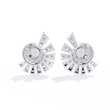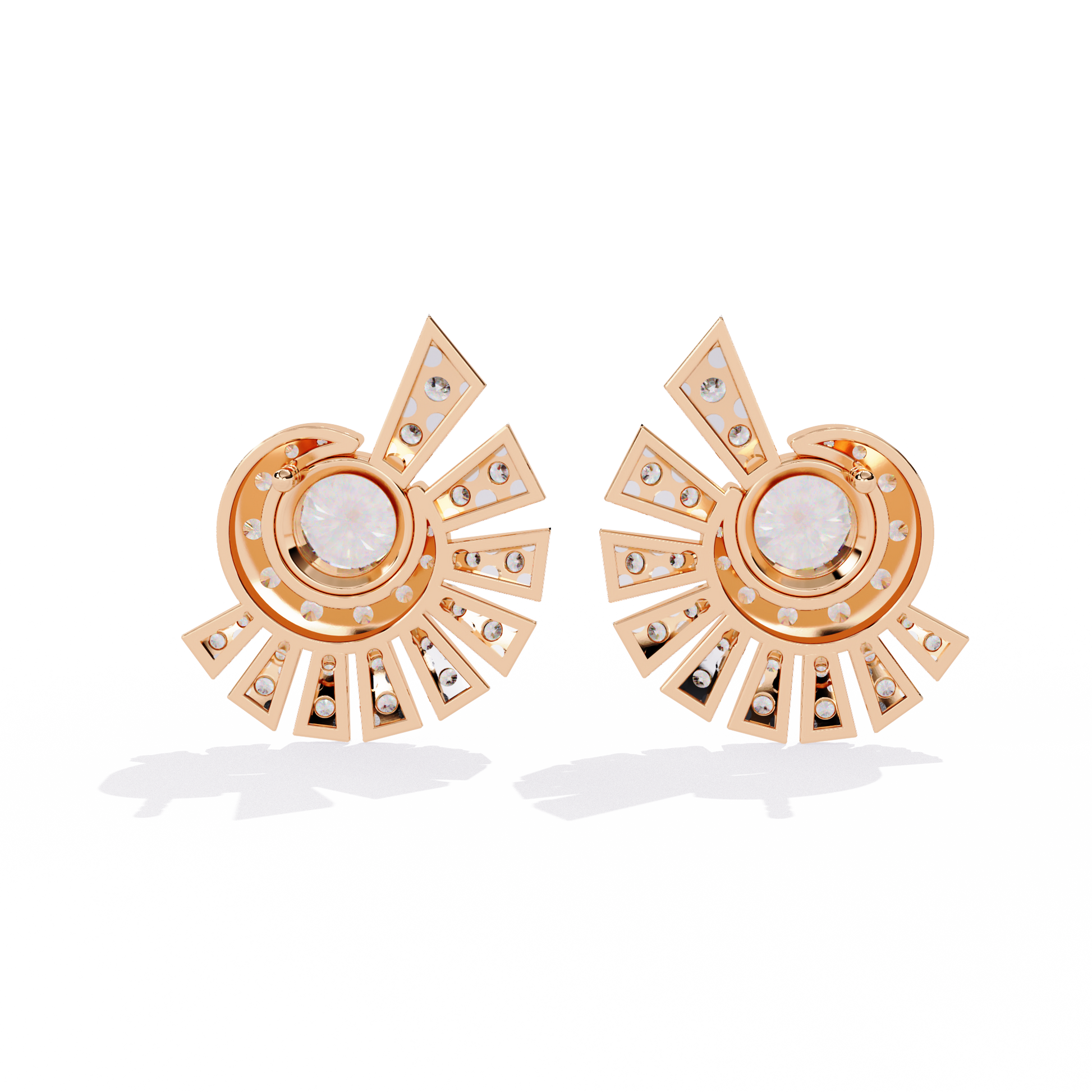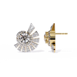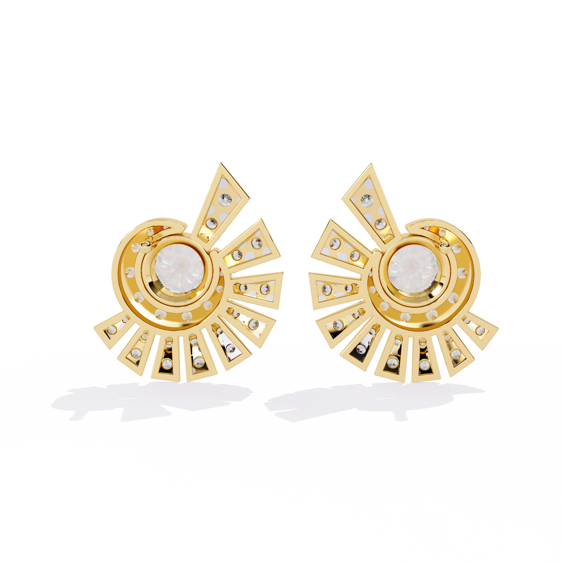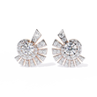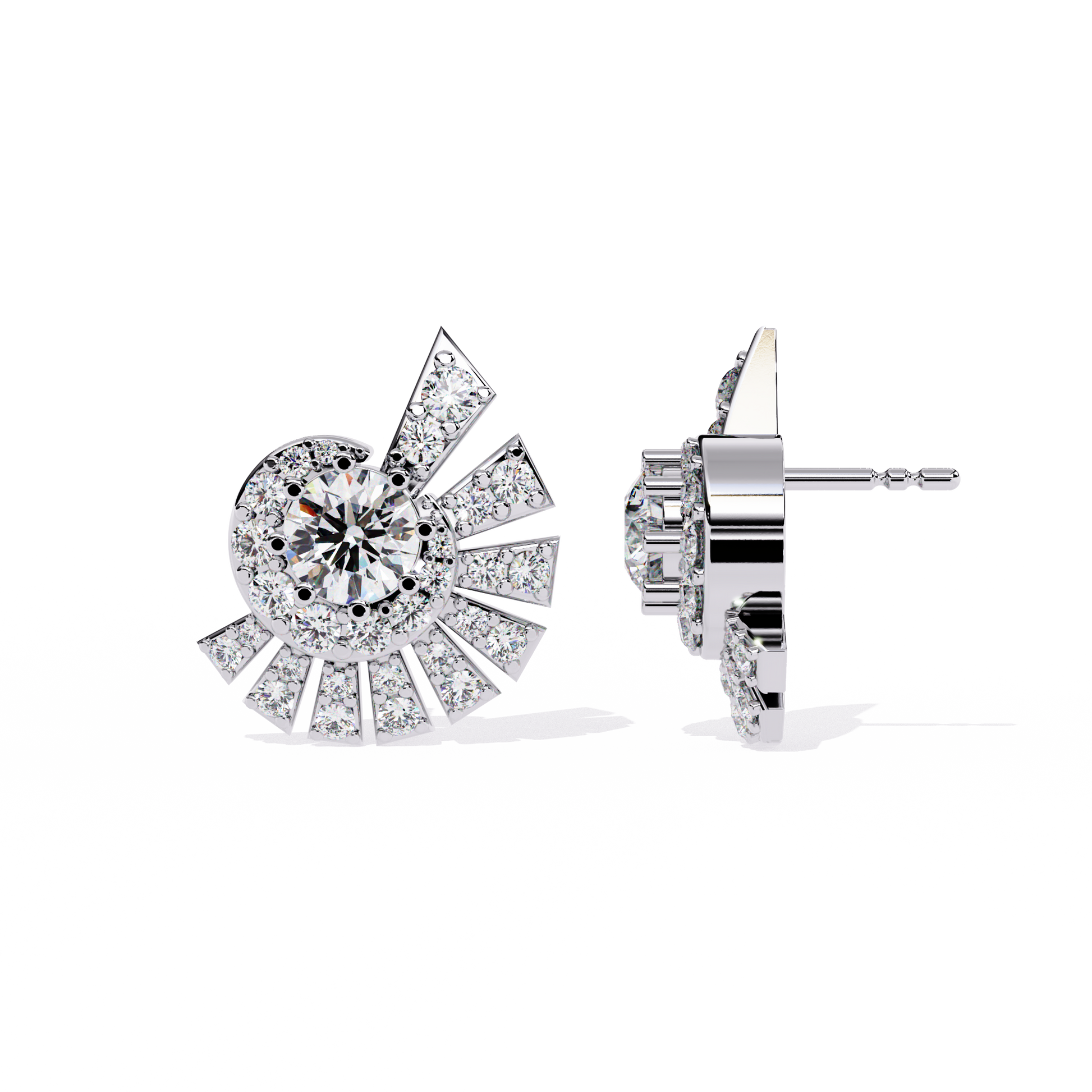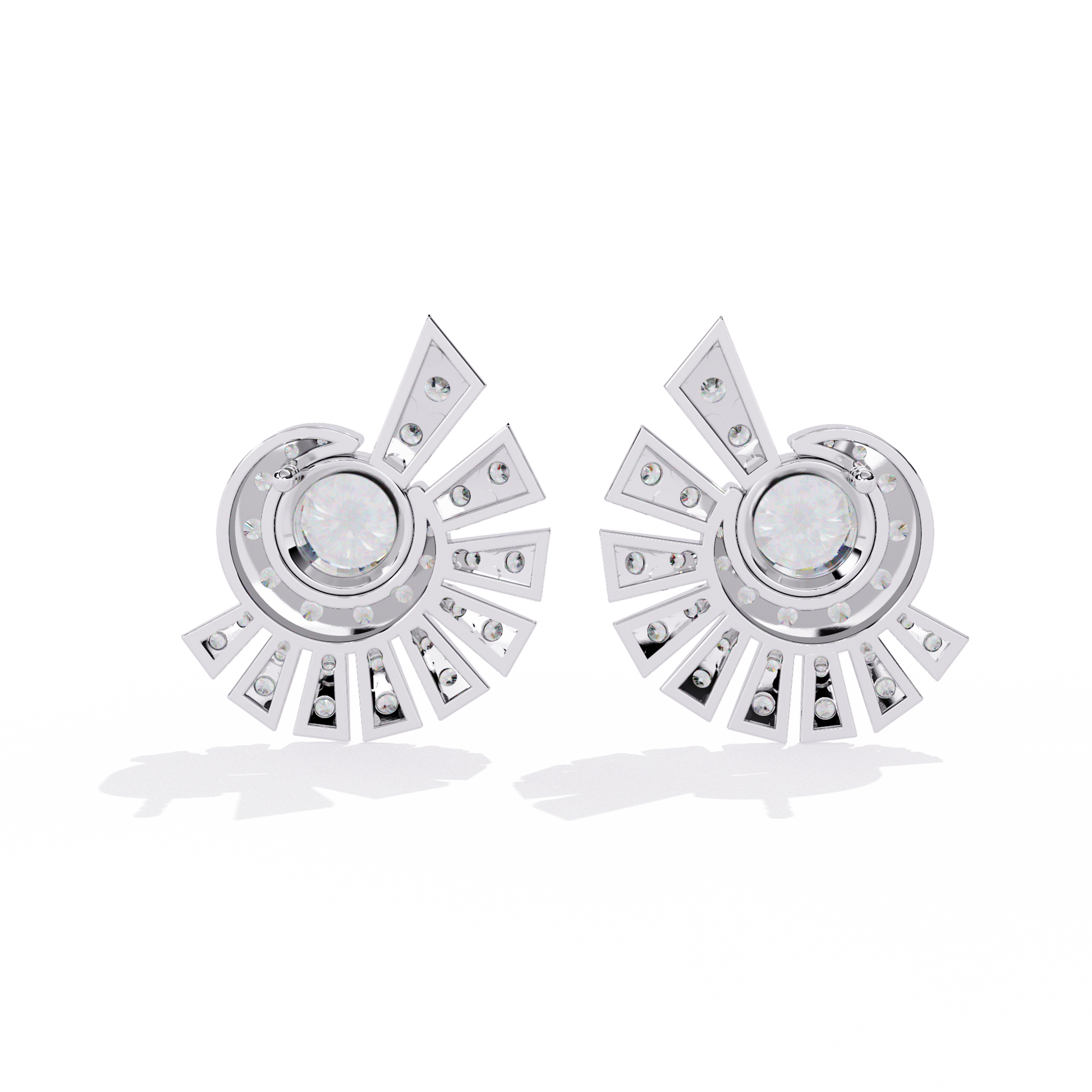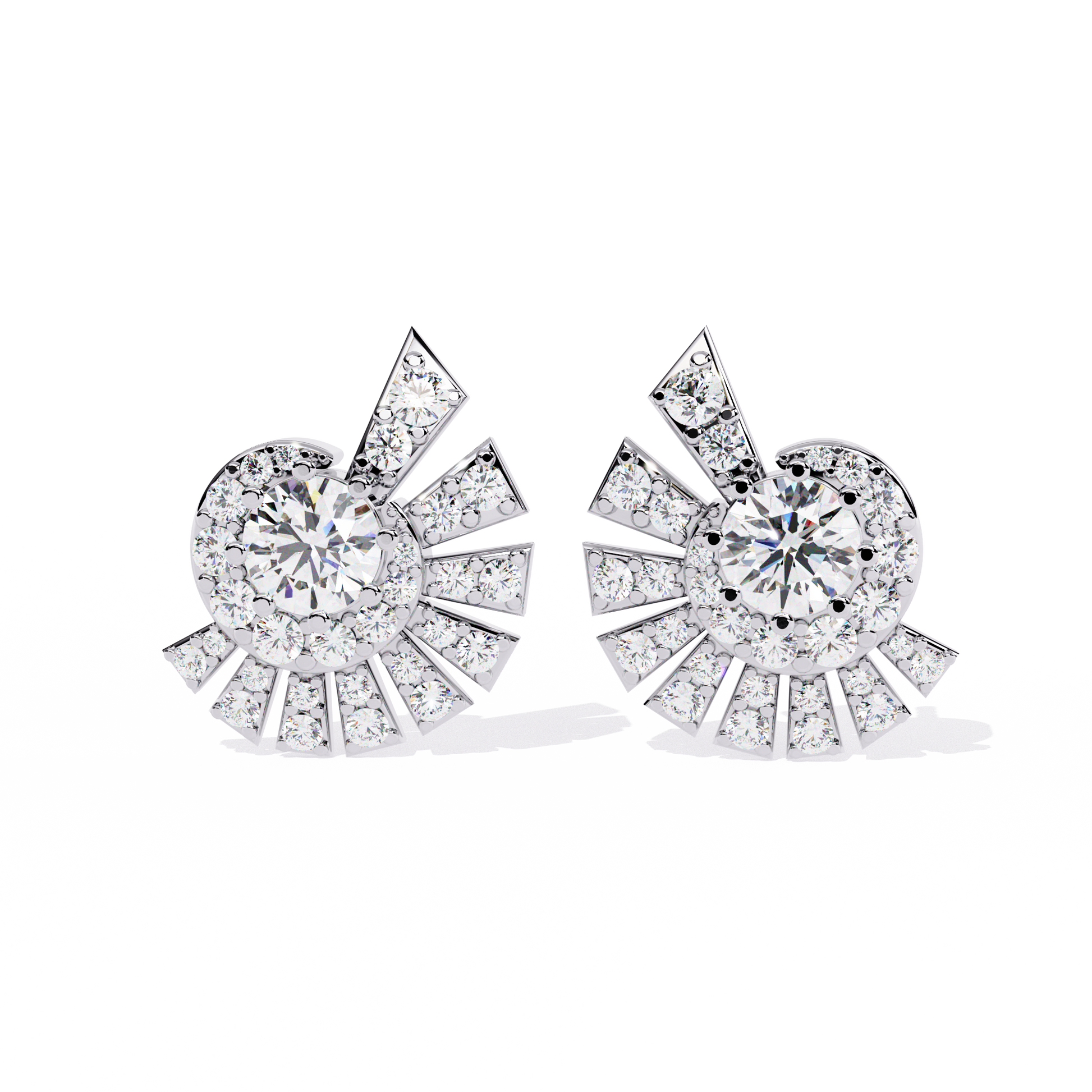Brilliant and bold, the Radiant Sunburst Round Diamond Statement Earrings in gold and silver capture the essence of celestial beauty and modern grandeur. Each earring centers around a magnificent round-cut diamond, encircled by a delicate pavé halo that magnifies its luminous fire. Extending outward, an array of precision-cut triangular and diamonds radiate like sunrays, forming a striking geometric composition that celebrates light, power, and sophistication.