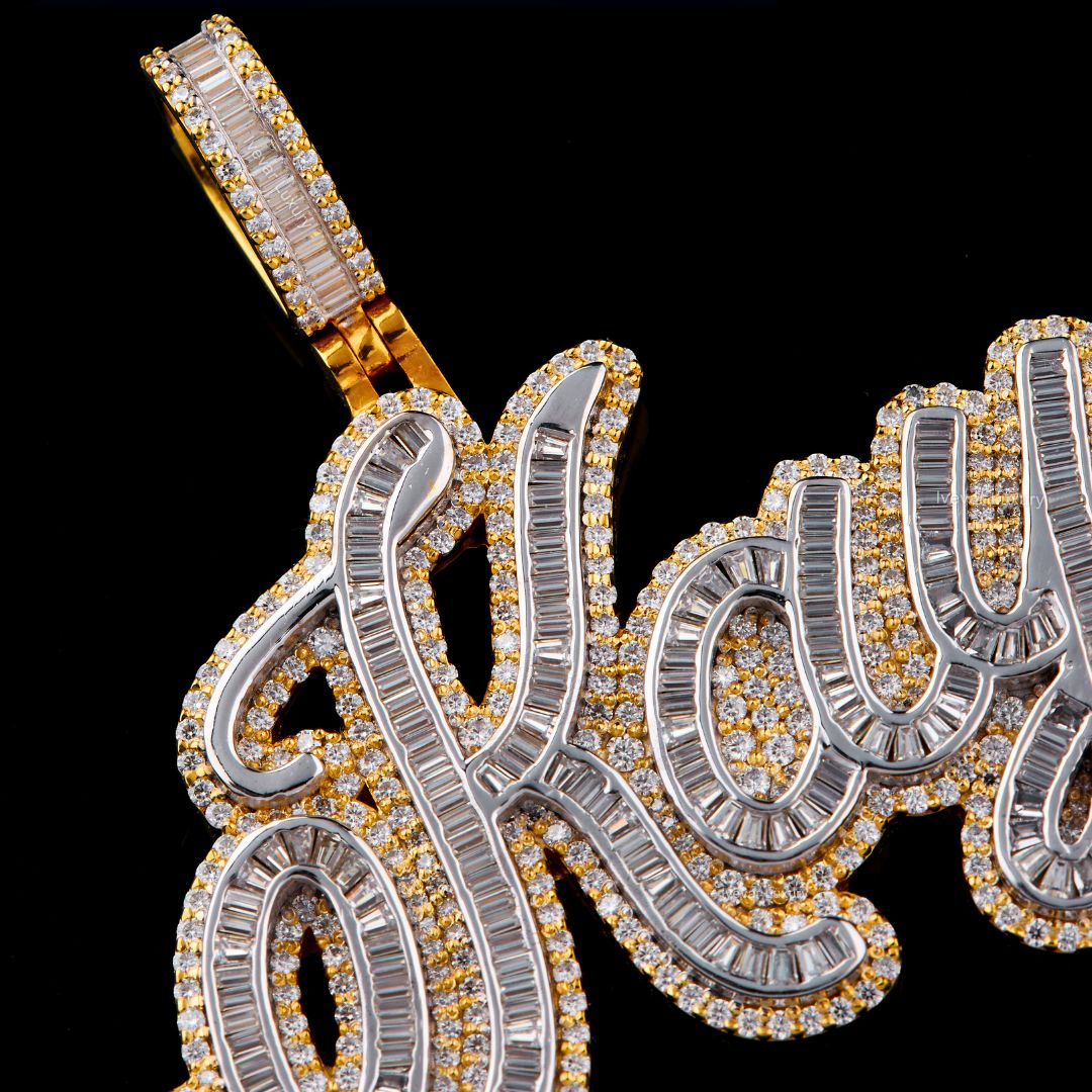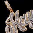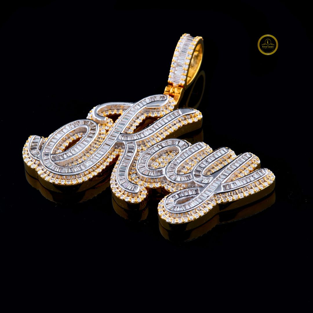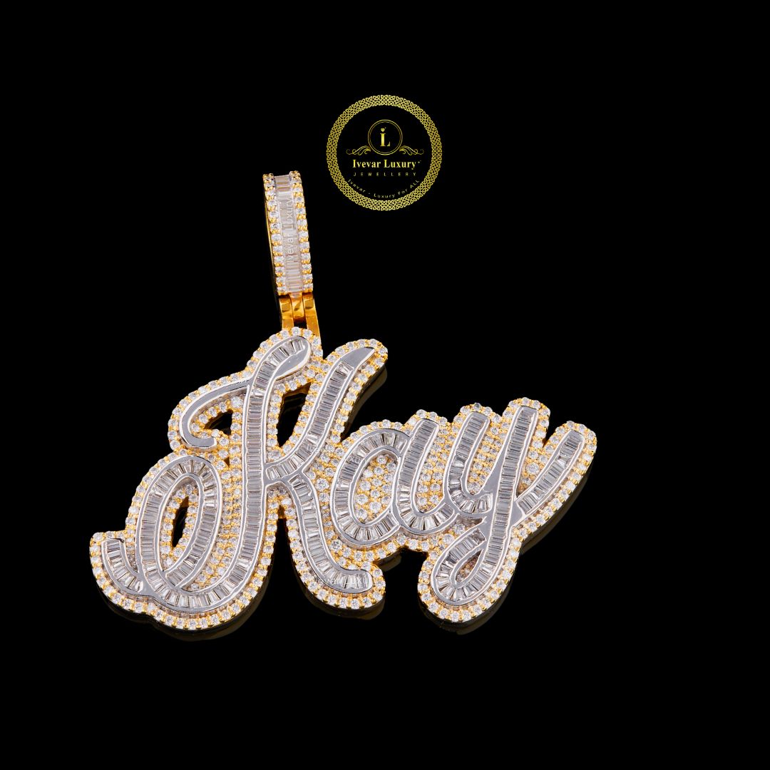 The piece, also branded "Ivevar Luxury," is a bold, personalized statement in the hip-hop or 'iced-out' jewelry style. It showcases a striking two-tone design, likely featuring a yellow gold base or plating for the outline and bail, contrasted with white gold or silver-toned metal for the diamond settings. The letters are intricately paved using a combination of baguette-cut lab-grown diamonds down the center of the script and smaller round-cut lab-grown diamonds to meticulously frame the edges. This mixed-cut setting maximizes the light reflection and offers an intense, high-end sparkle, making it a spectacular piece of personalized, ethical luxury.
