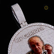 This is a custom-made, circular lab-grown diamond pendant featuring a personal photographic portrait. The image is of an elderly man, and the pendant is engraved with the memorial text "RIP GRANDPA" above the photo and the name "POPEYE" below it. The entire circular area, including the bezel and the bail, is heavily covered in pave-set, sparkling lab-grown diamonds, creating a brilliant, iced-out aesthetic. A small logo for "Ivevar Luxury" is visible at the top, suggesting the jeweler or brand. This piece serves as a distinctive and luxurious memorial jewelry item.