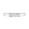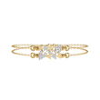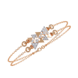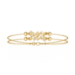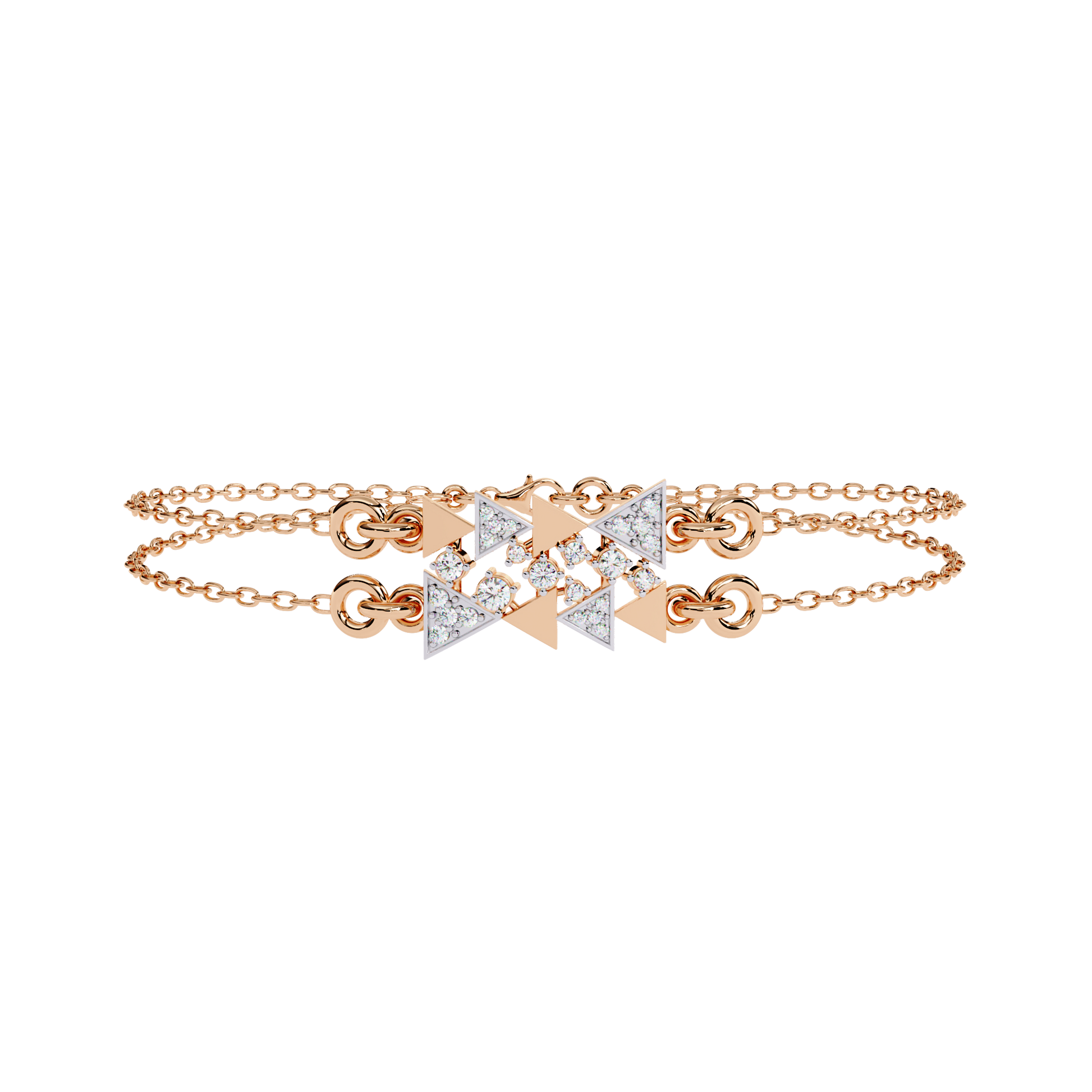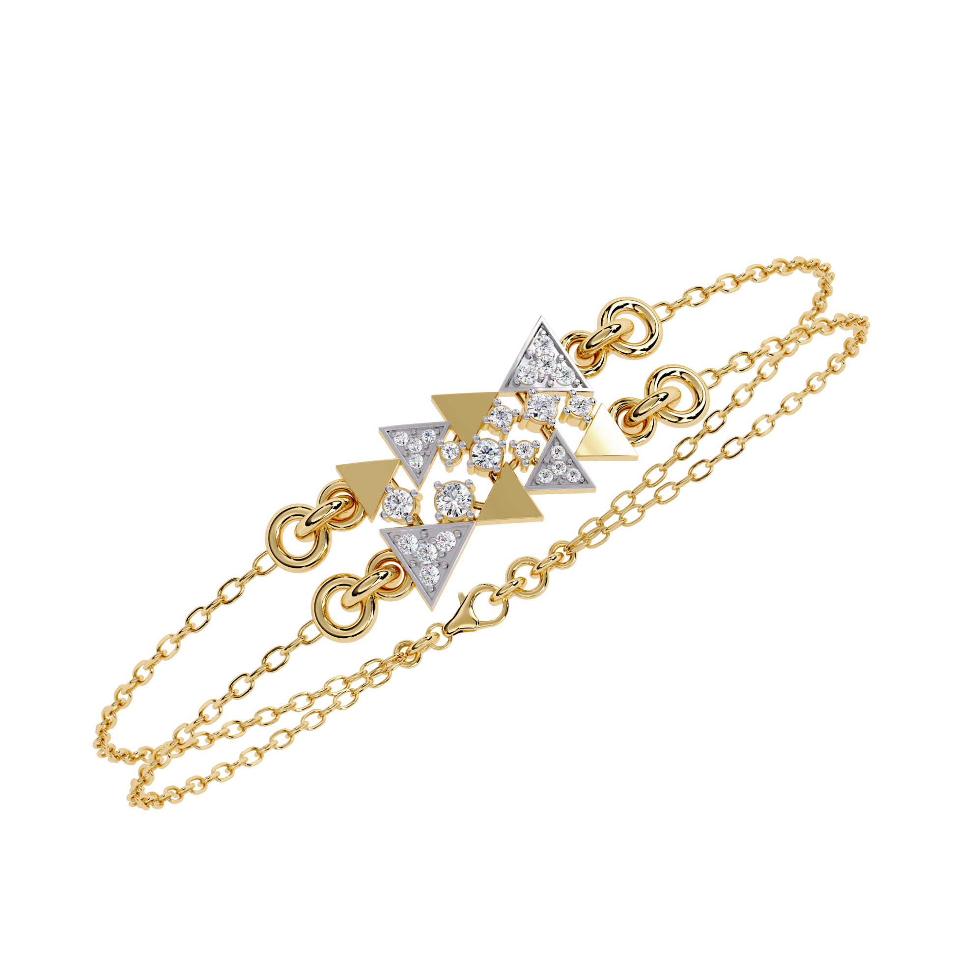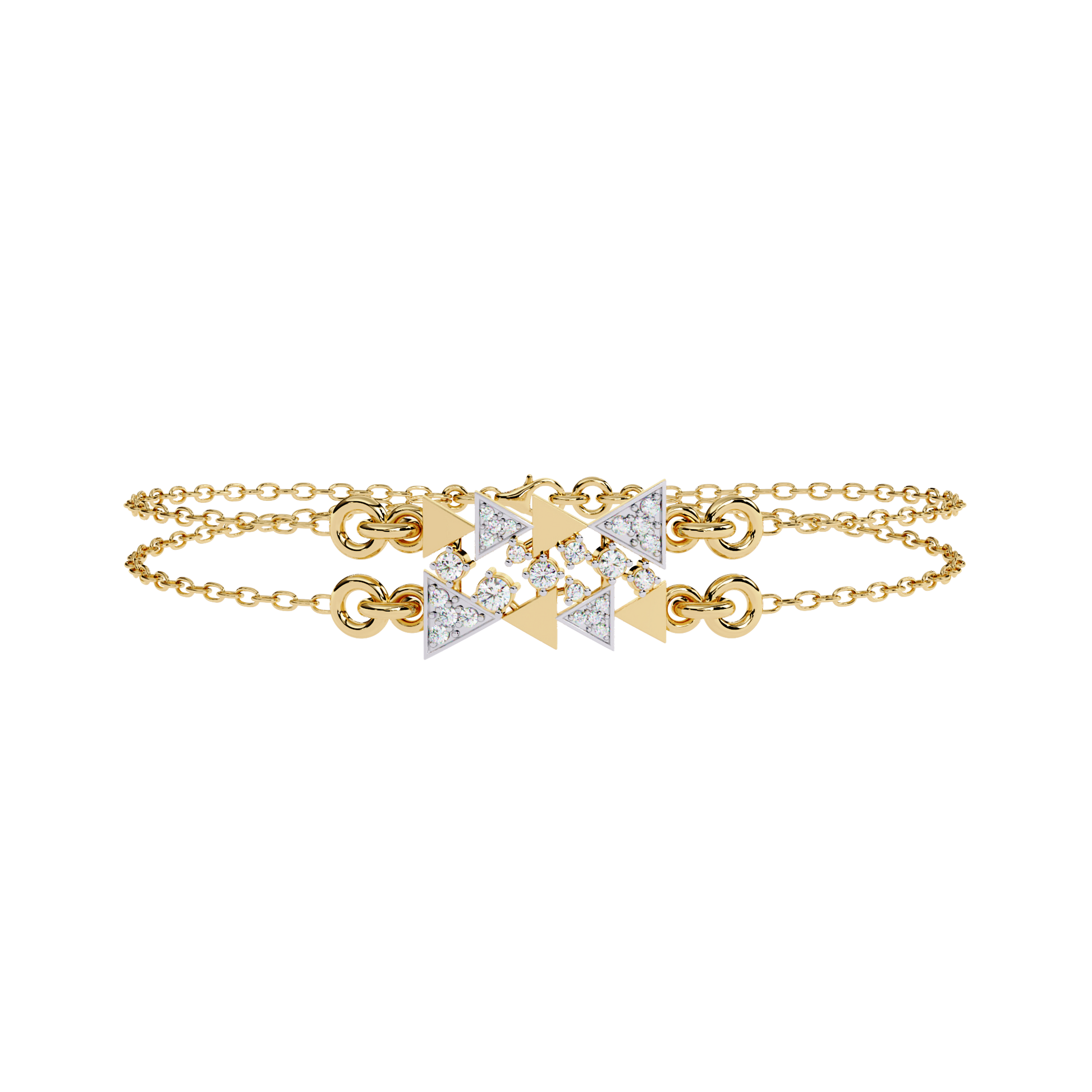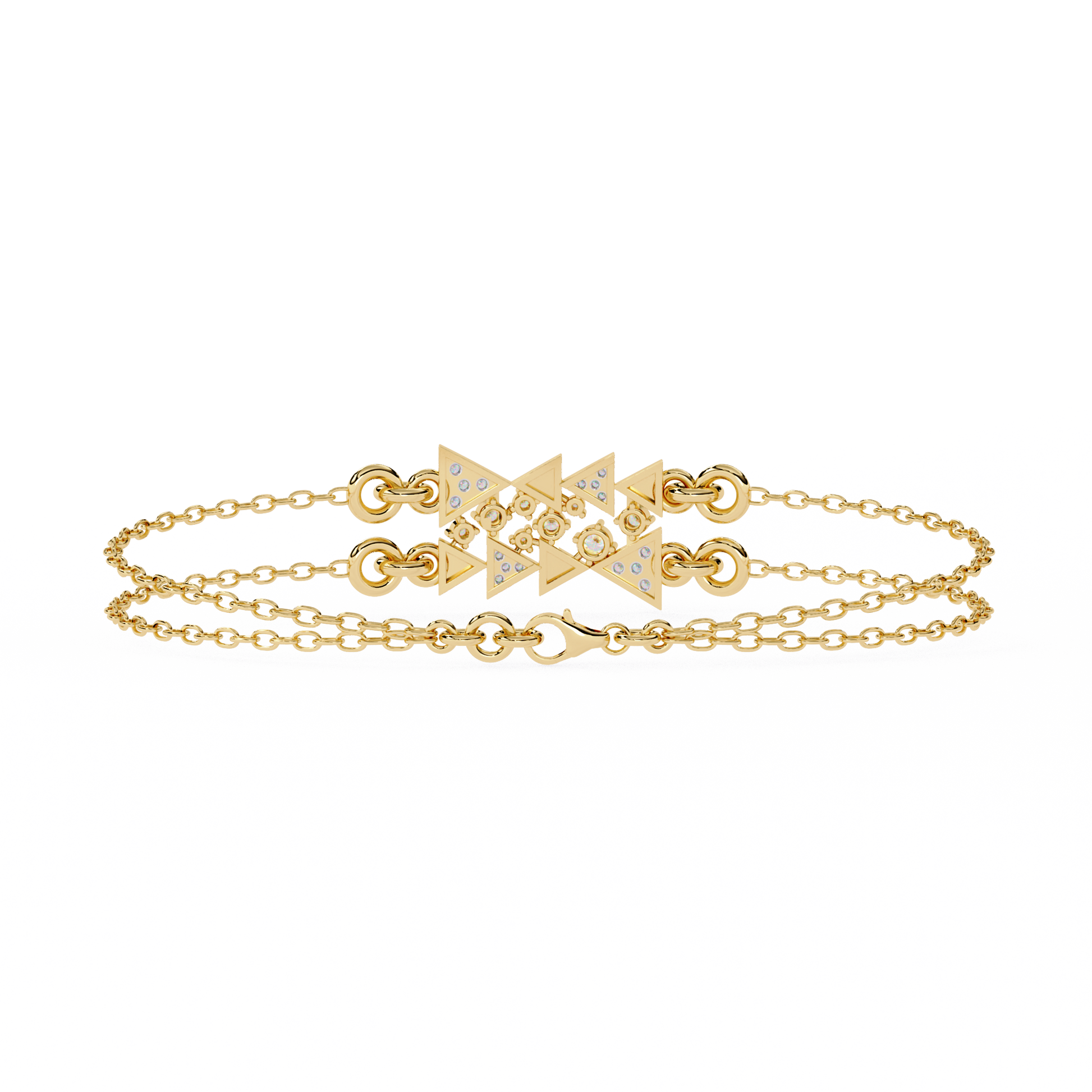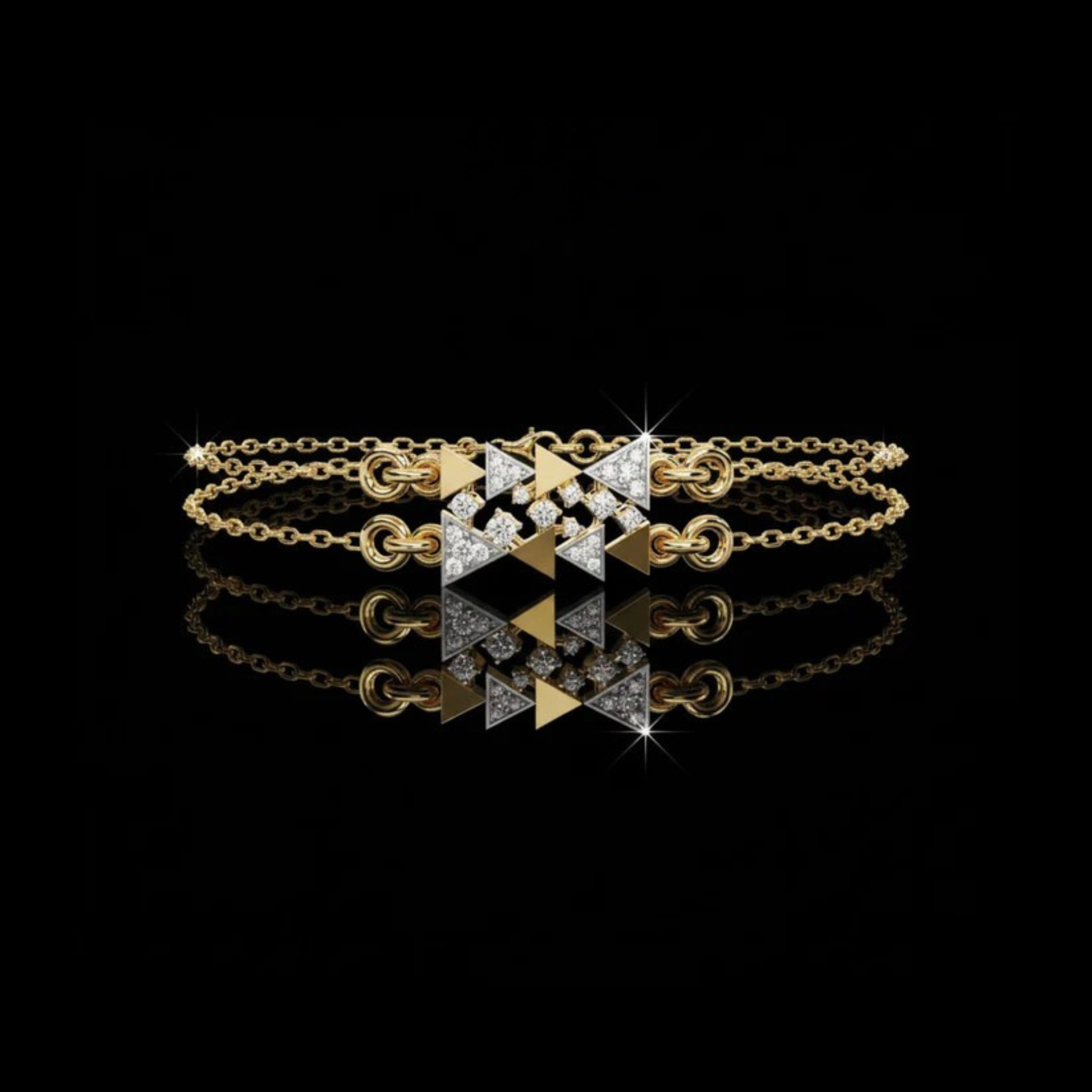 This sophisticated bracelet showcases a dual-layer gold chain that beautifully complements its geometric triangle motifs, each accented with dazzling round-cut diamonds. The intricate interlinked design adds a touch of modern artistry while maintaining a sense of timeless luxury. Perfect for formal occasions or to add a hint of elegance to everyday wear, this piece embodies refined craftsmanship and contemporary charm.