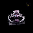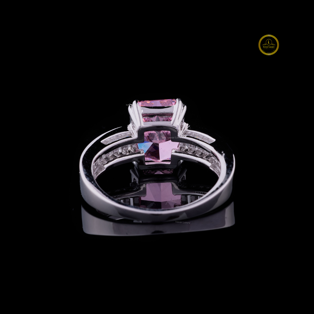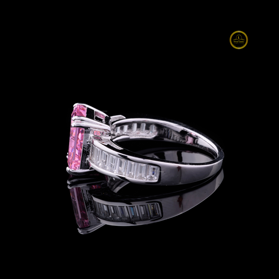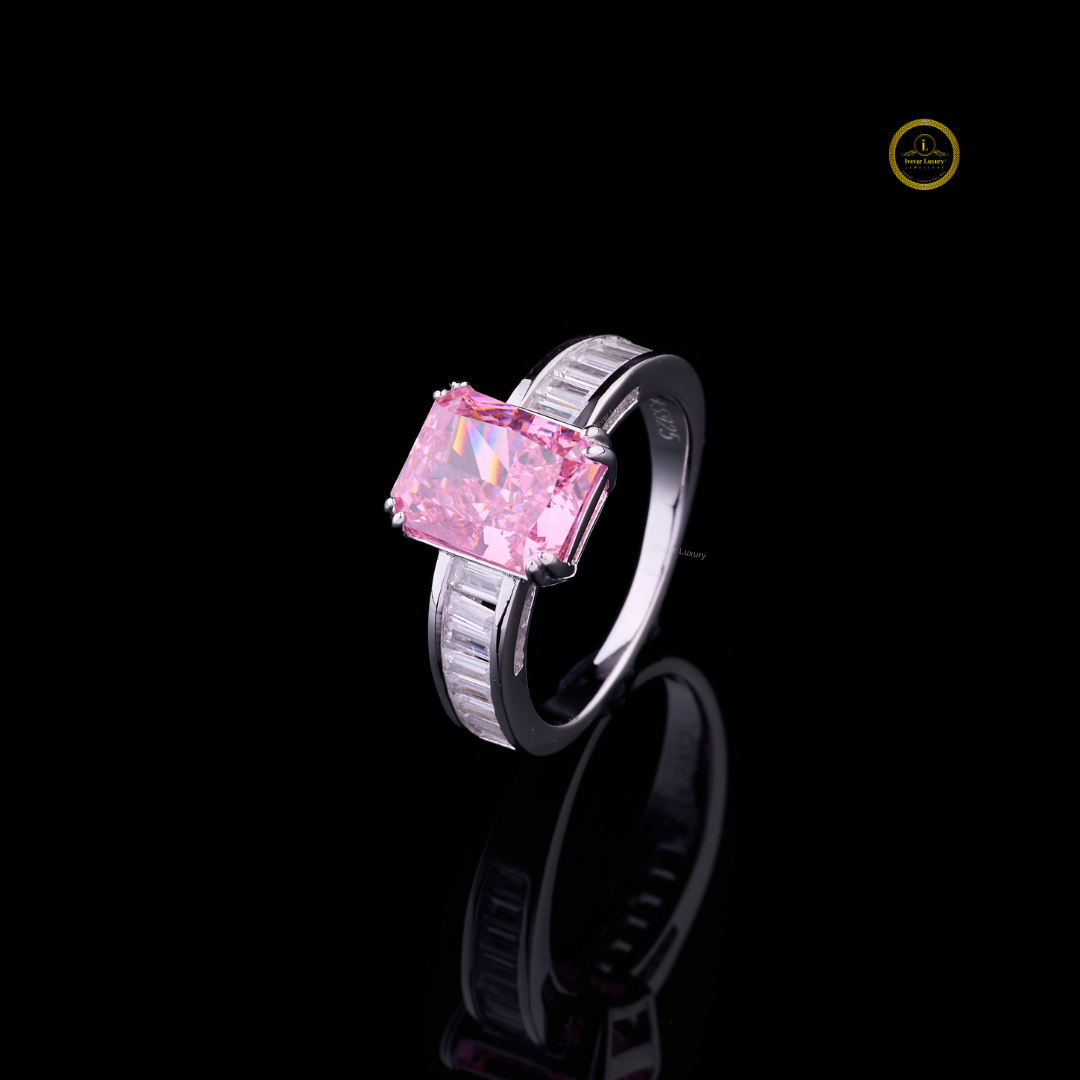 A delicate pink sparkle meets bold geometry in this radiant-cut creation. The Moissanite center diamond symbolizes love reborn ethical, pure, and everlasting. Surrounded by tapered baguettes, it captures the warmth of romance with a luxurious modern edge. The vivid pink stone showcases exceptional clarity and brilliance, with intricate faceting that catches light from every angle.
