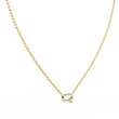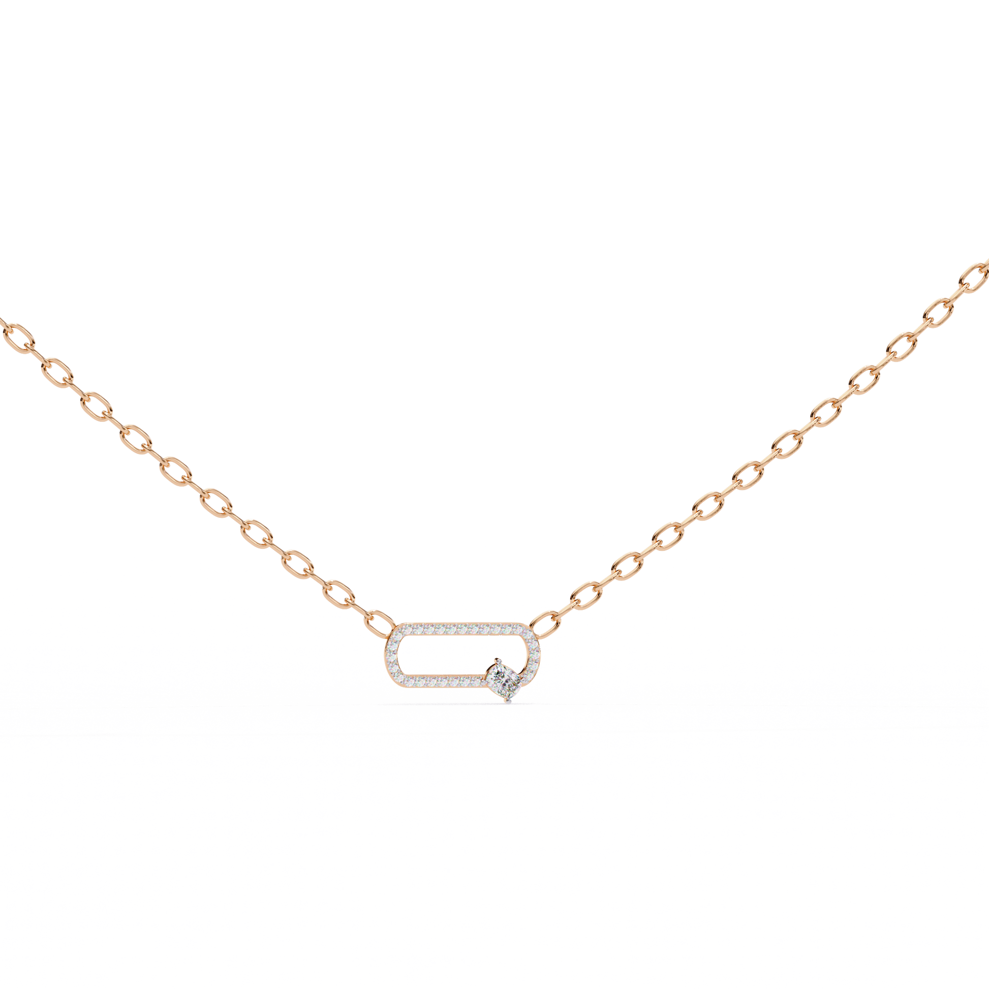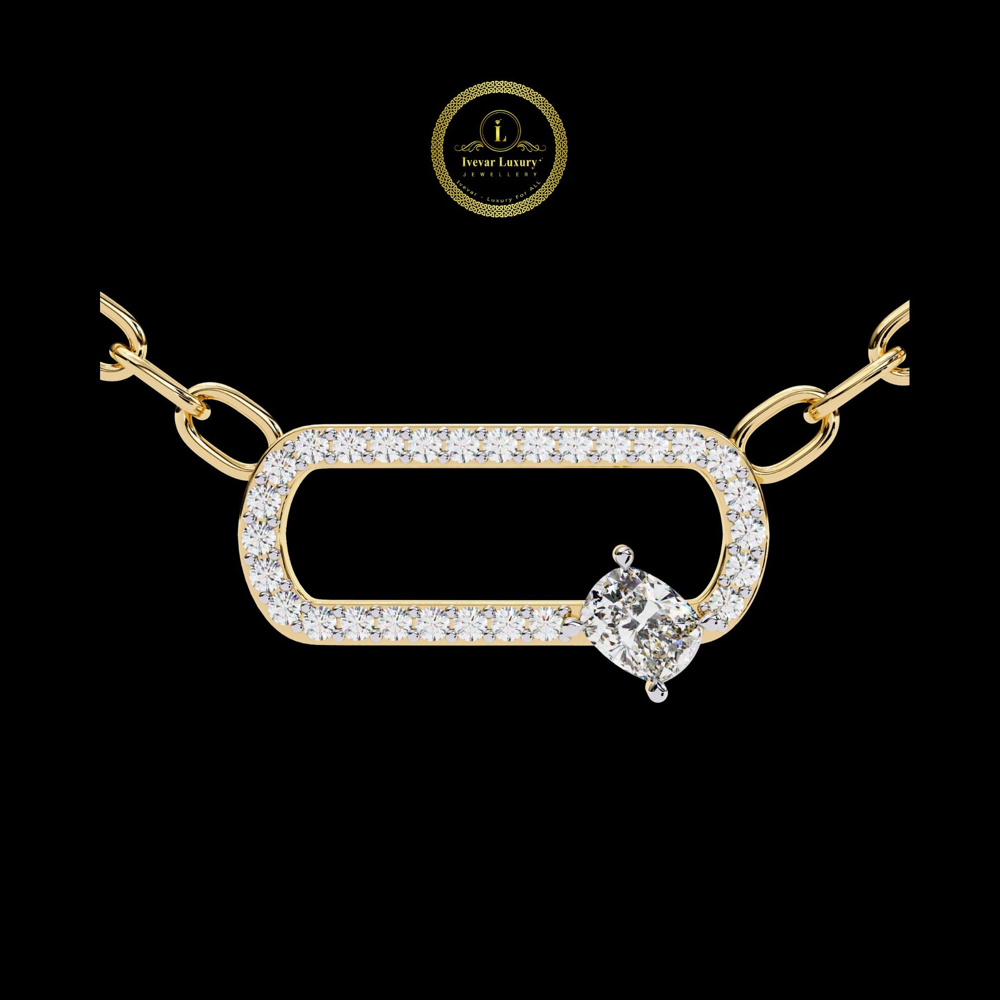 This exquisite pendant, crafted in luminous gold, features a contemporary open oval design encrusted with shimmering Round Cut pave-set diamonds that radiate brilliance from every angle. At the edge of the Cushion rests a captivating central diamond, artfully placed to symbolize elegance and balance. The intricate gold links enhance its modern sophistication, making it a perfect statement of refined luxury. Designed by Ivevar Luxury, this pendant embodies timeless charm and contemporary artistry—ideal for those who cherish beauty in every detail.