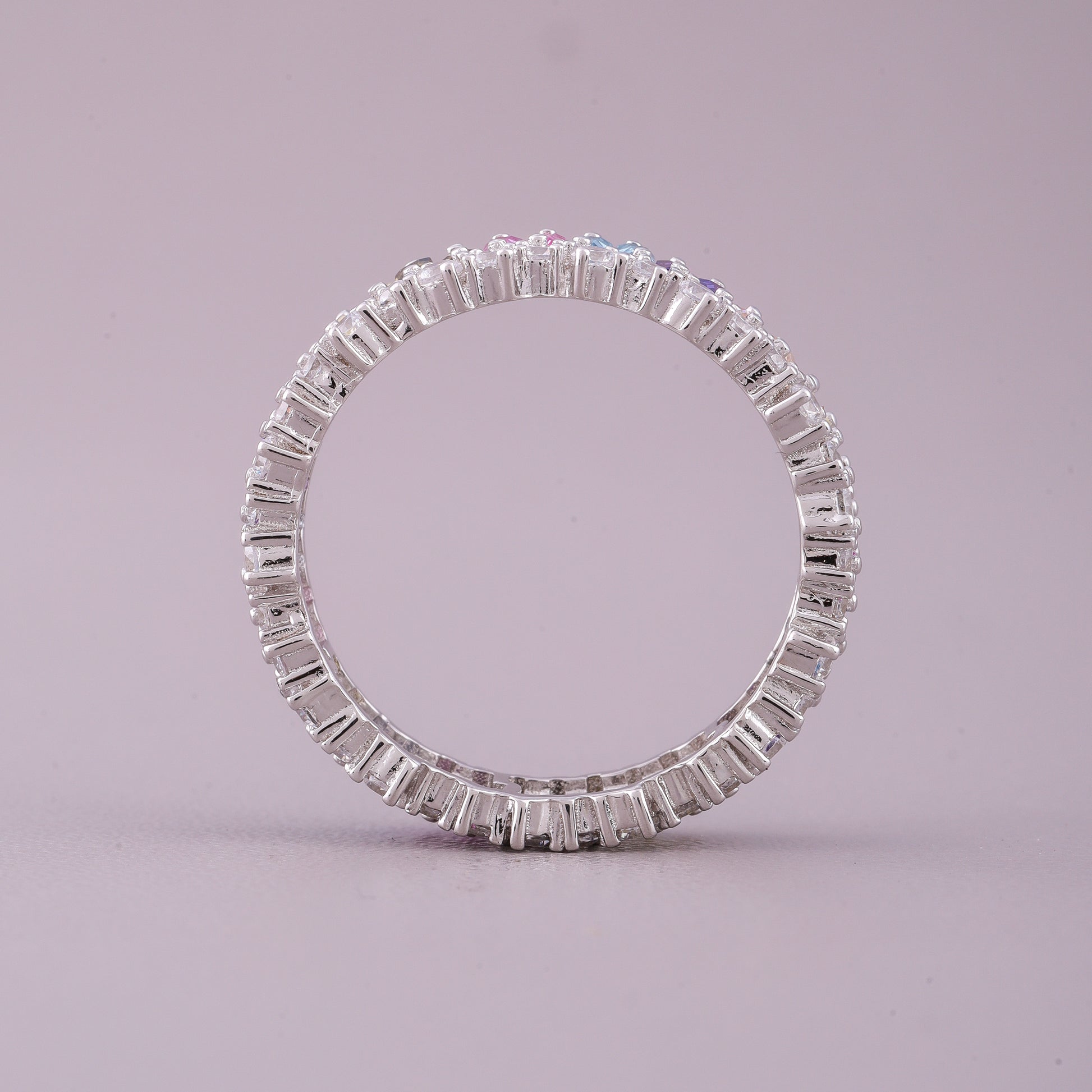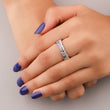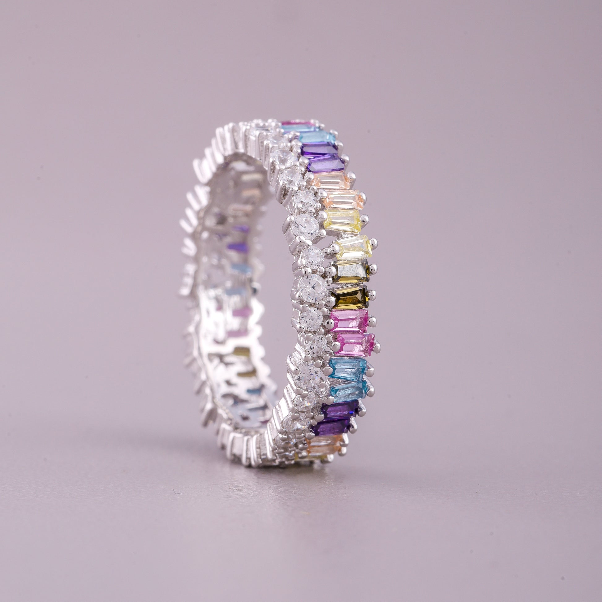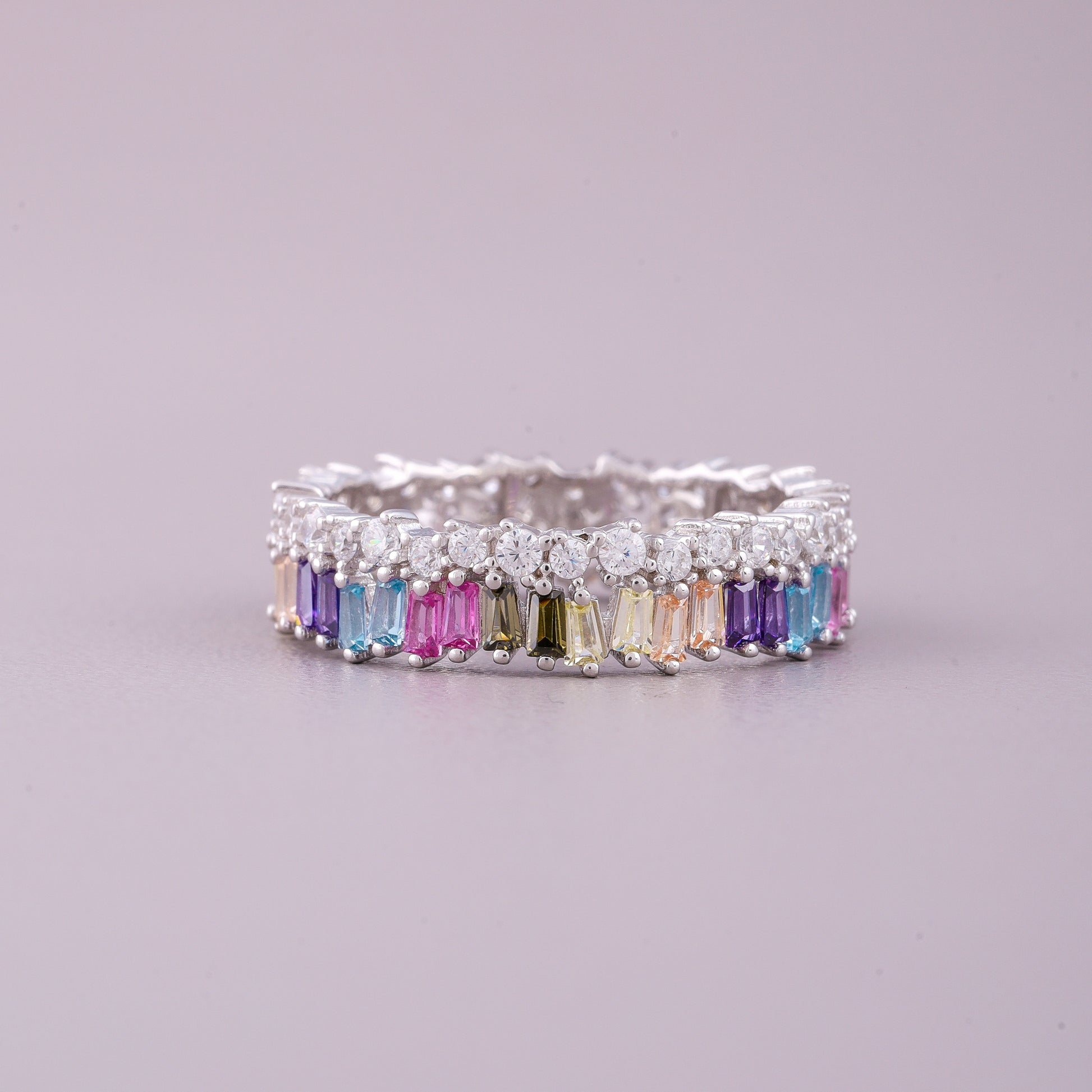 This eye-catching natural sapphire diamond ring features a prominent row of vertically-oriented baguette-cut colored sapphires, creating a striking linear design across the band. The sapphires display a subtle gradient, focusing on tones like soft pink, light blue, and olive green. These vibrant gems are beautifully framed by rows of dazzling brilliant-cut diamonds along the top and bottom edges, maximizing the ring's overall sparkle. This substantial band offers a modern take on the eternity style, combining geometric cuts with brilliant accents for a luxurious and colorful effect.