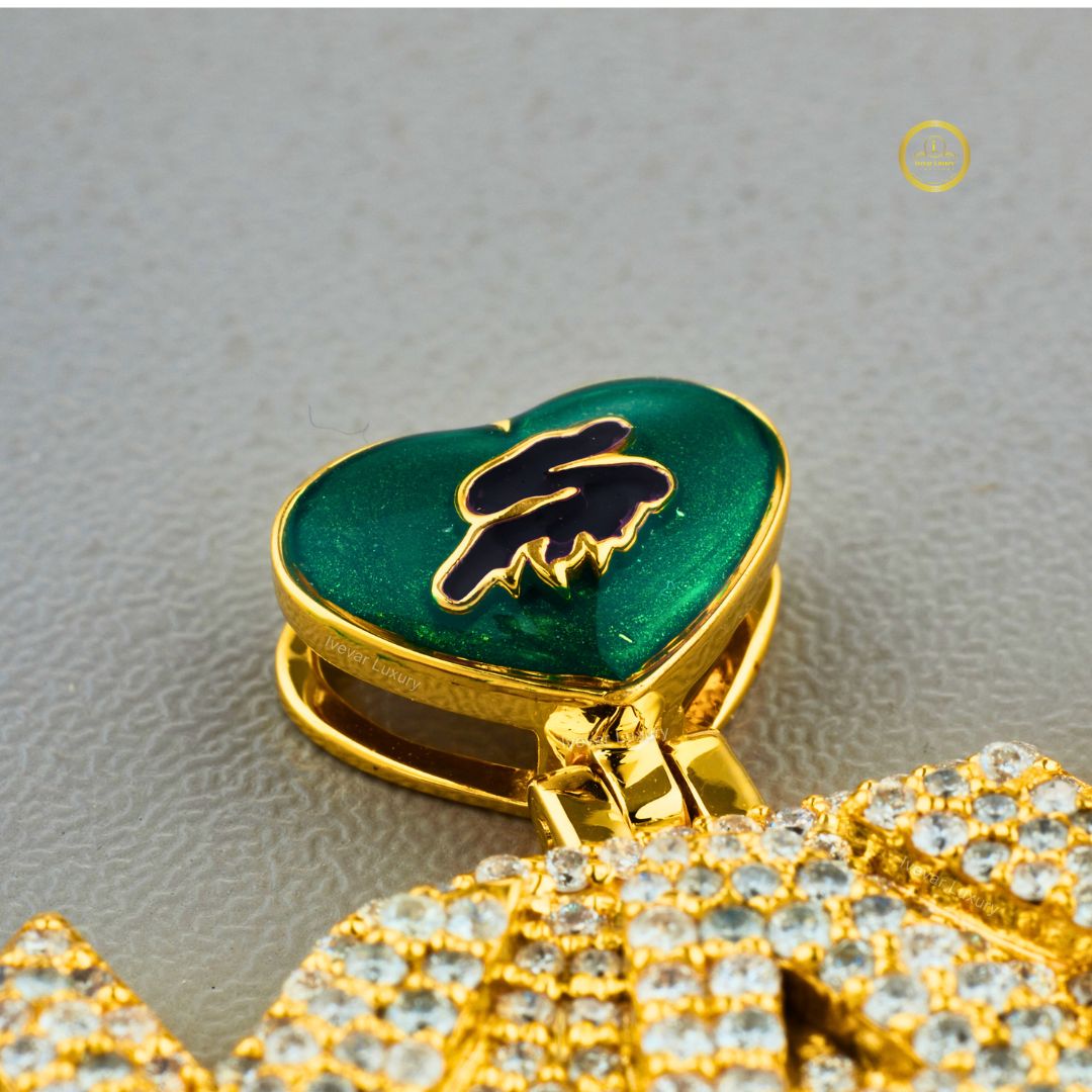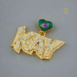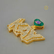 This custom name pendant spells "KAY" in a thick, rounded font, entirely covered in numerous small round brilliant-cut moissanite diamonds for maximum sparkle (pave setting). The body of the pendant is crafted in yellow gold, providing a warm contrast to the icy stones. A unique feature is the bail (the loop connecting the pendant to a chain), which is designed as a green enameled heart with a smaller, stylized purple emblem or letter on it. This heart detail adds a personalized touch of color and distinct visual interest to the overall iced-out design. The jewelry is associated with the brand "Ivear Luxury."