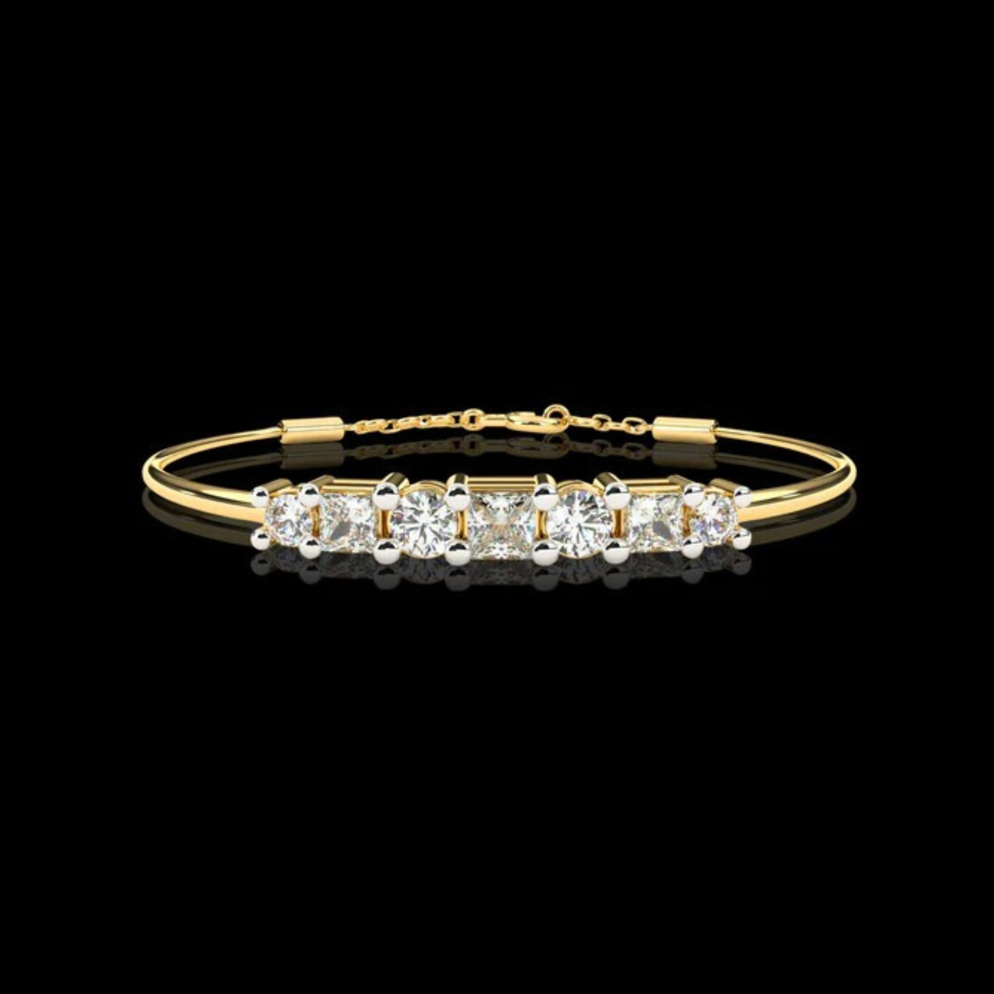 This exquisite bracelet features a sleek gold band adorned with a stunning row of alternating round and princess-cut sparkling diamonds, creating a captivating blend of classic and contemporary elegance. The precise arrangement of the diamonds highlights their brilliance and clarity, making the piece a dazzling statement of refined luxury. Perfect for adding a touch of sophistication to any outfit, this bracelet combines timeless design with modern flair for versatile, elegant wear.
