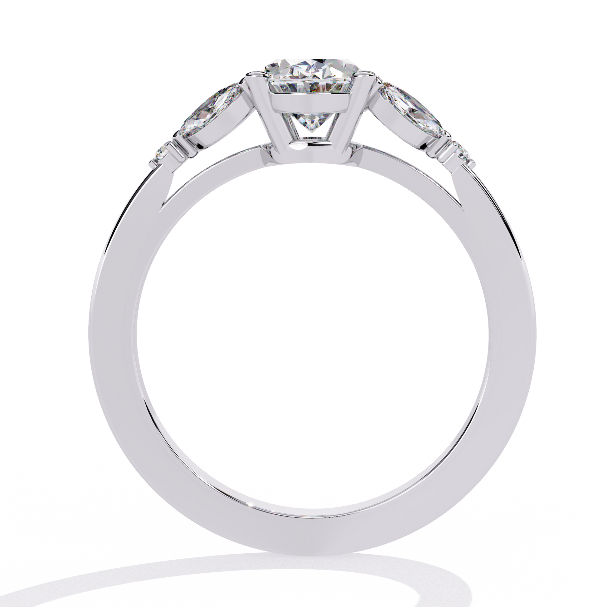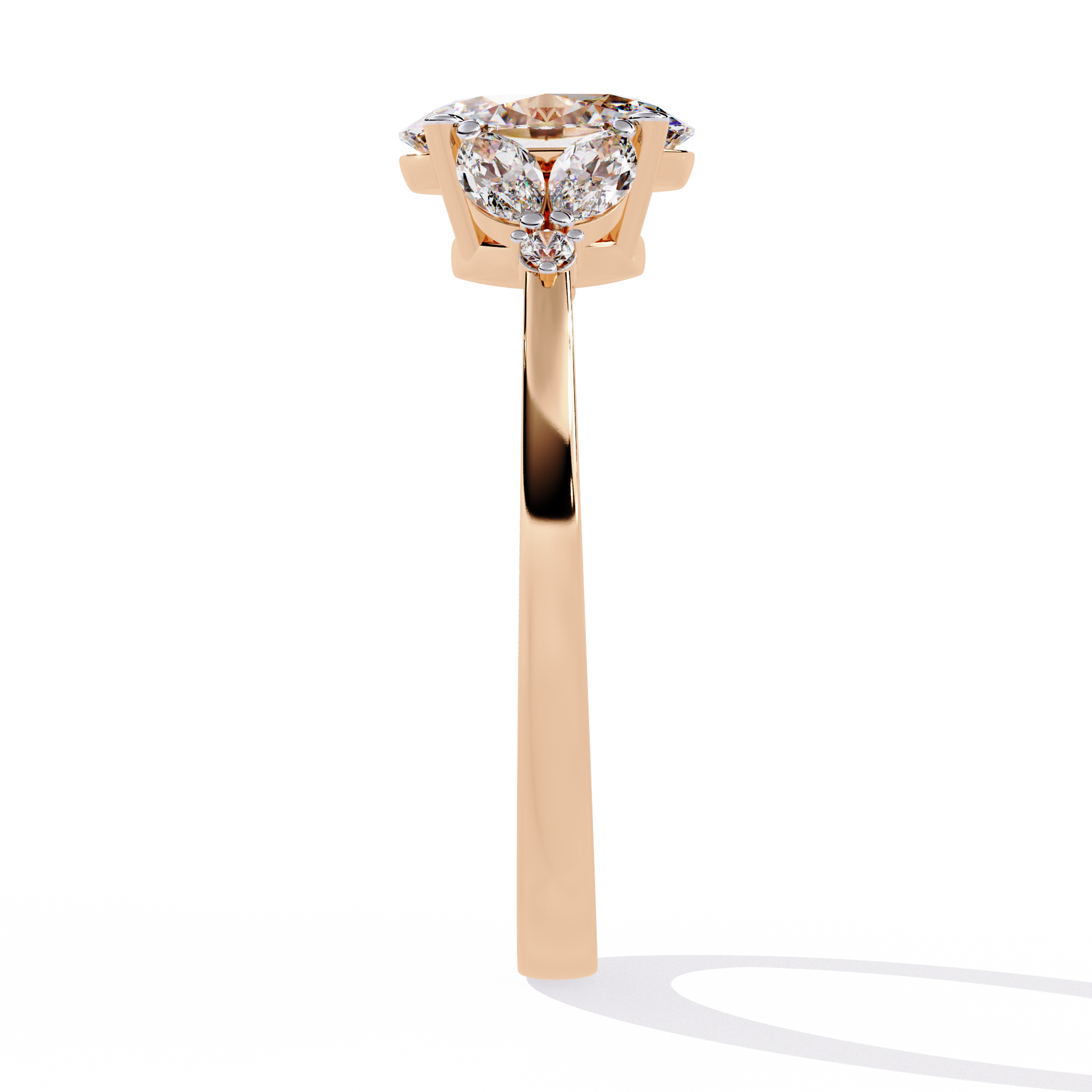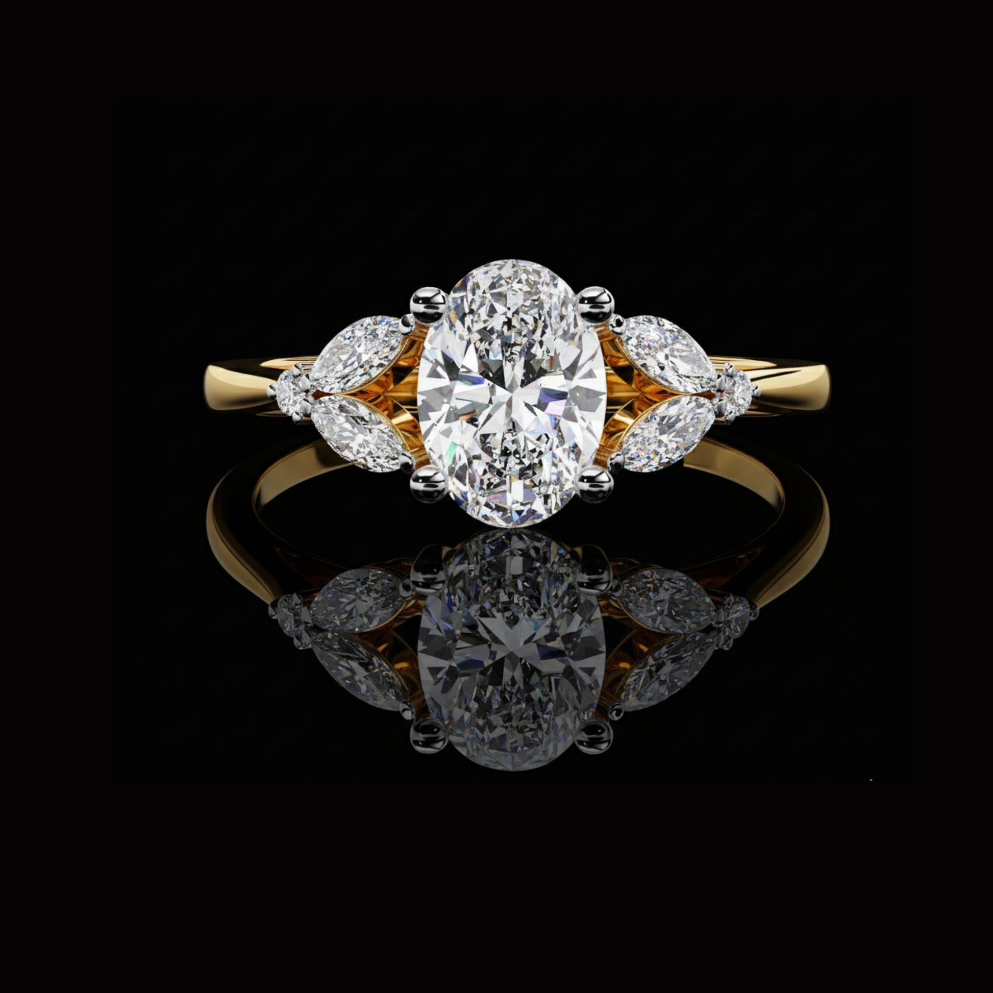 This elegant ring features a stunning oval-cut center diamond set in a warm gold band, flanked by two marquise-cut diamonds on each side that create a graceful, leaf-like silhouette. The combination of round brilliant stones and rich gold gives the piece a luxurious, timeless appeal, while the intricate setting enhances the sparkle and symmetry of the design. Perfect for someone who appreciates classic beauty with a refined, modern touch, this ring exudes sophistication and radiant elegance by Ivevar Luxury.