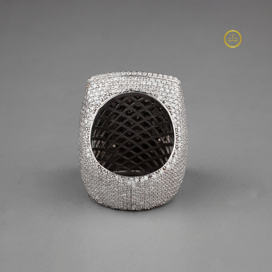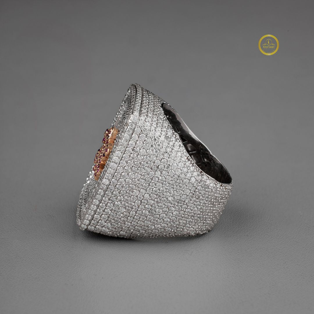 This exquisite ring showcases a bold rectangular design fully encrusted with shimmering white stones, creating a luxurious, high-impact sparkle from every angle. At its center, a striking floral motif crafted from rich pink gemstones adds a vibrant touch of color and elegance, standing out beautifully against the brilliant round pavé background. The combination of geometric structure and delicate artistry gives the piece a refined yet eye-catching presence, making it a perfect statement accessory for those who appreciate intricate detail and sophisticated glamour.