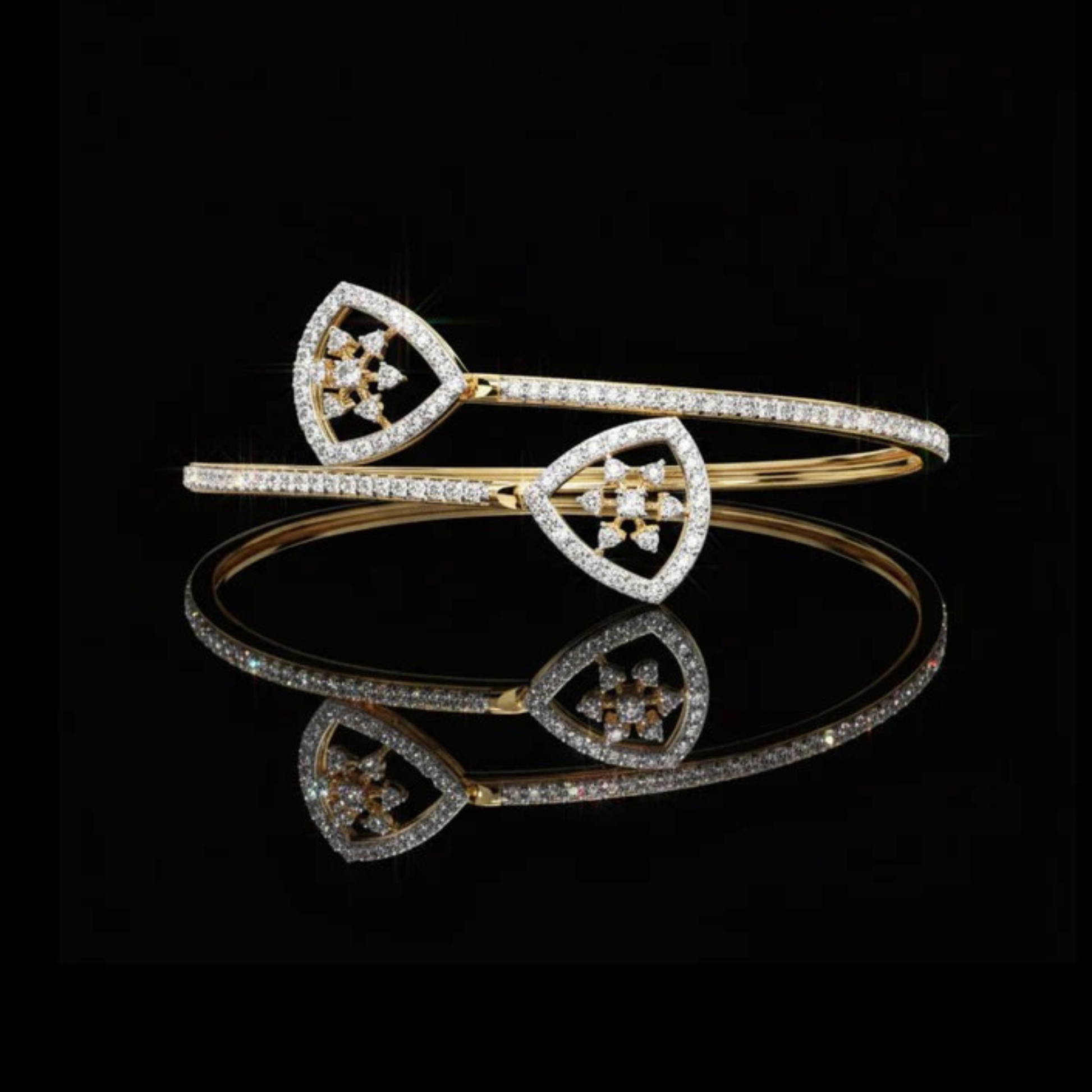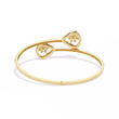 This exquisite bangle features a stunning fusion of timeless elegance and modern artistry. Crafted from radiant yellow gold, it is adorned with shimmering diamonds that delicately trace its sleek contours. The design showcases two teardrop-shaped motifs at the open ends, each highlighted by a sparkling cluster of diamonds encased in a halo of brilliance. Perfect for both formal occasions and refined everyday wear, this bangle embodies sophistication, grace, and enduring beauty.
