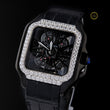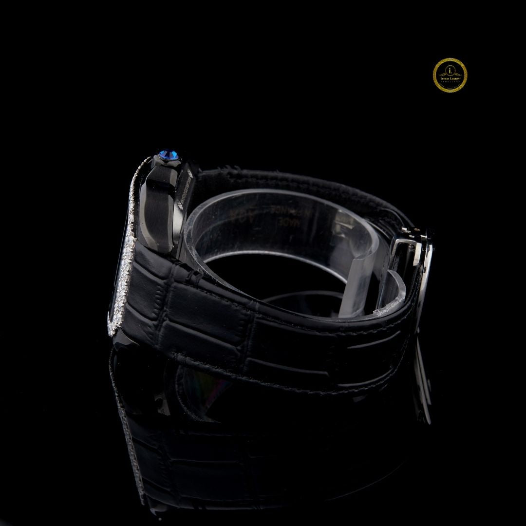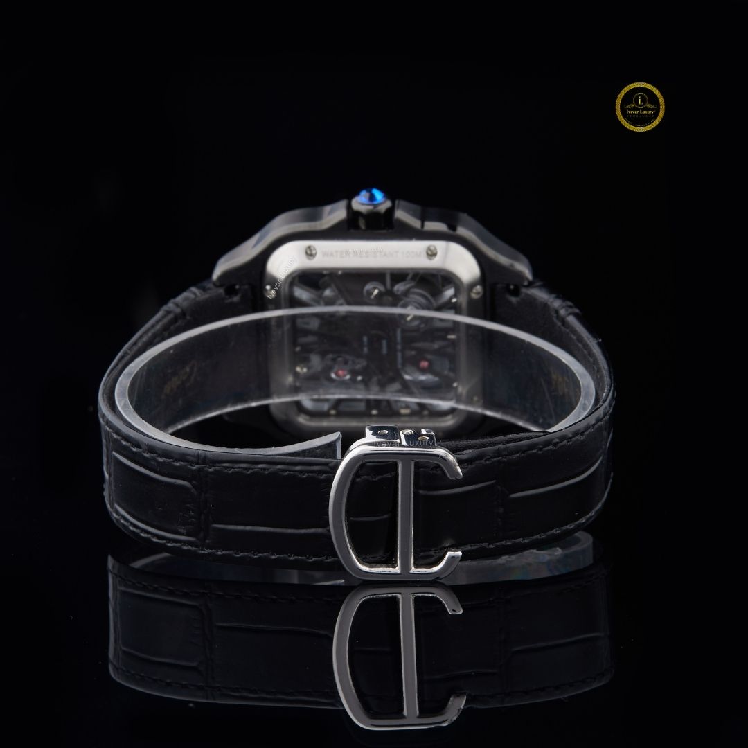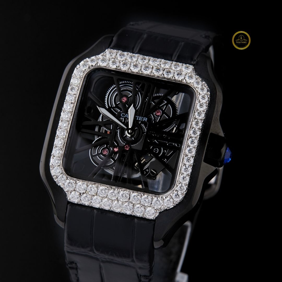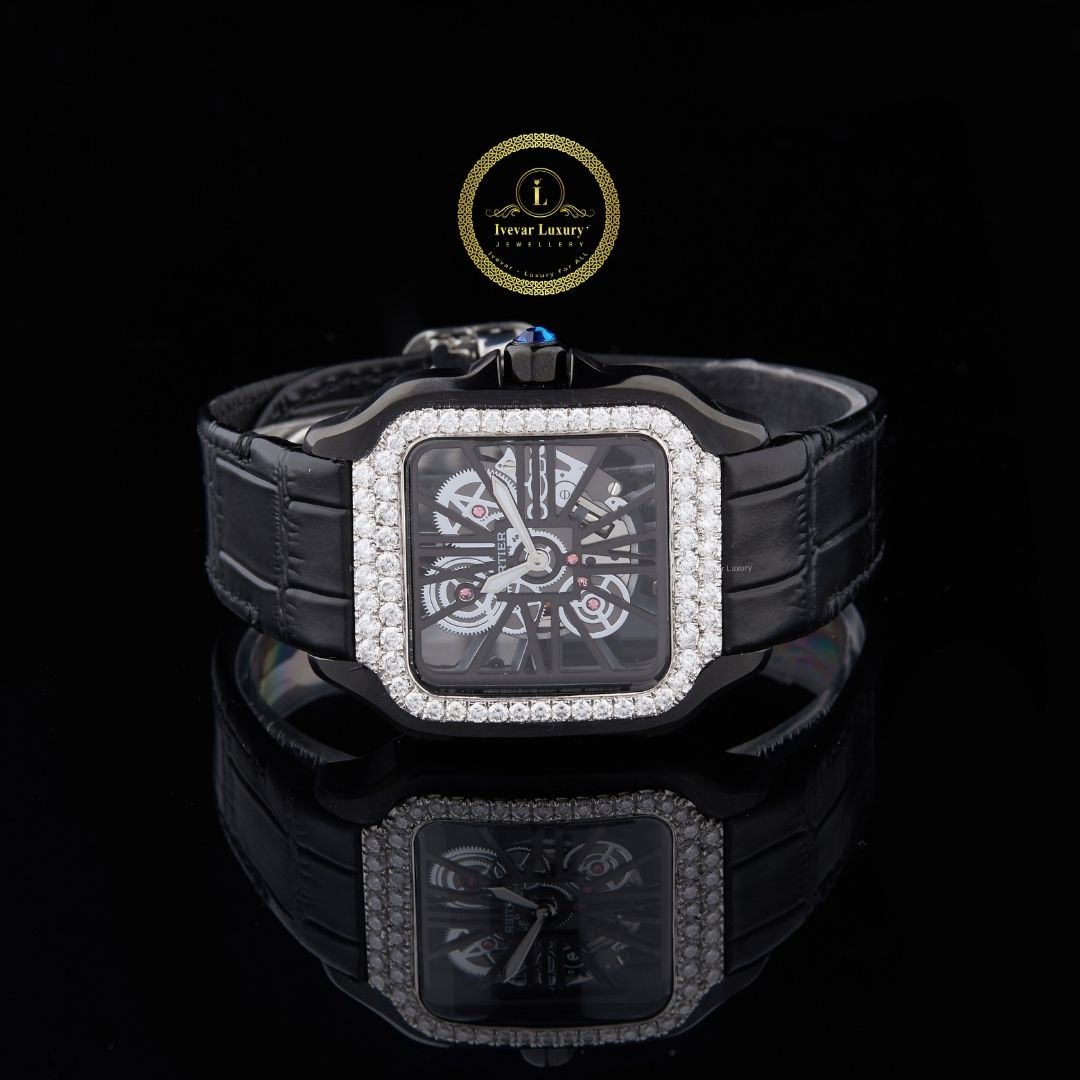 This watch is a true statement piece — the square case outlined with dazzling stones adds a luxurious edge, while the skeleton dial showcases intricate mechanics for a modern, powerful look. The black leather strap enhances its bold aesthetic, making it perfect for someone who loves to stand out with elegance and confidence. A showstopper on any wrist! ✨🖤🕰️
