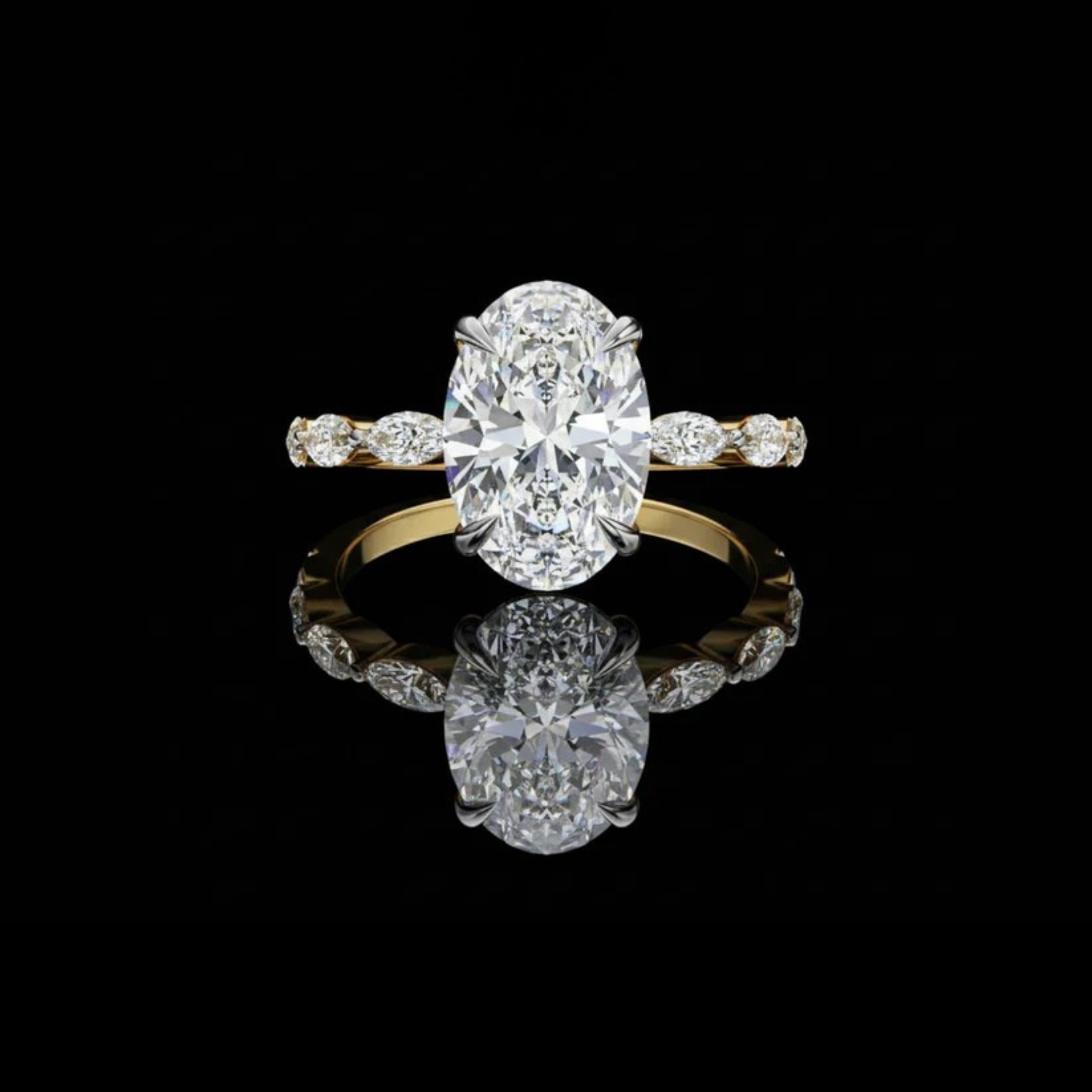 This exquisite ring features a dazzling oval-cut diamond as its centerpiece, radiating brilliance through its beautifully elongated shape. The warm gold band enhances the stone’s luminosity and is adorned with sparkling marquise diamonds along the shoulders, adding depth and elegance. With its graceful silhouette and luxurious detailing, this ring embodies timeless sophistication and modern refinement, making it a truly captivating piece by Ivevar.