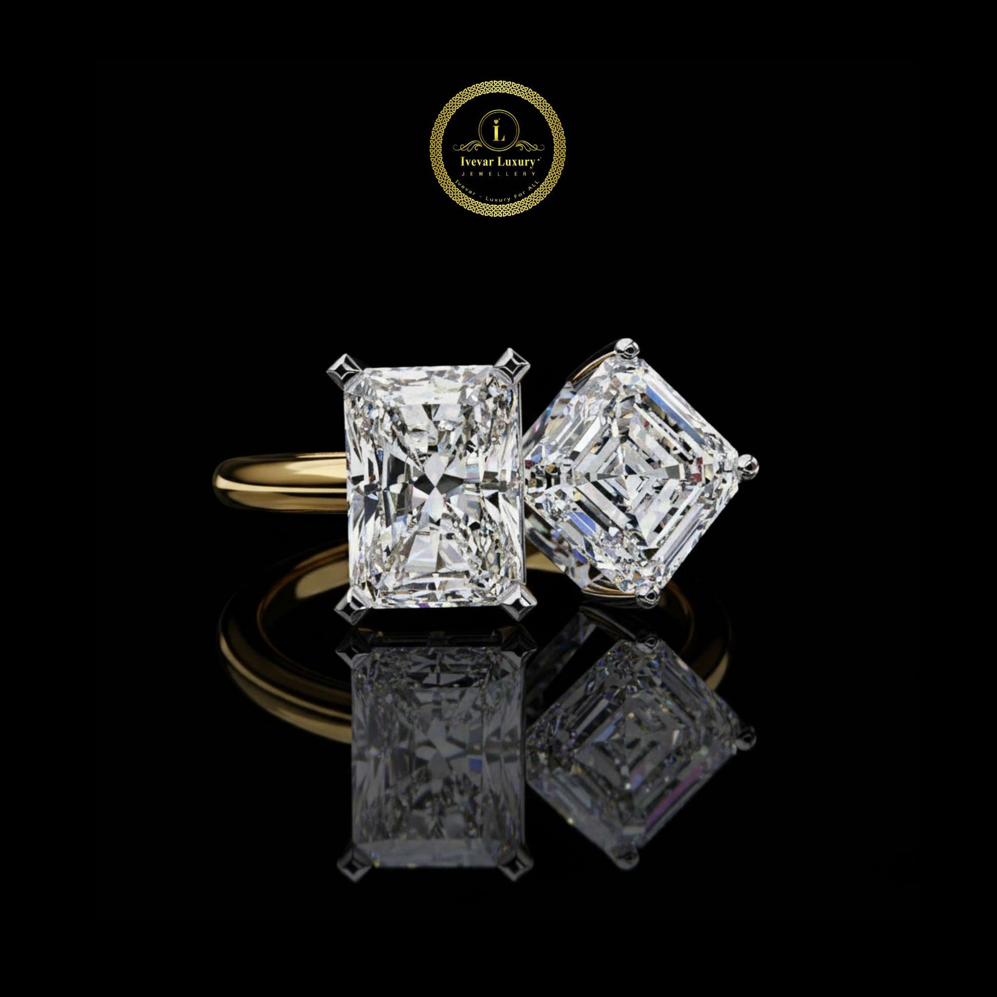 Make a bold and sophisticated statement with this stunning Toi Moi ring, featuring two dazzling radiant-cut clear gemstones set side by side. Each stone captures light with exceptional brilliance, creating a luxurious sparkle from every angle. The sleek band adds a touch of modern refinement, while the unique dual-stone design symbolizes connection, balance, and timeless elegance. Perfect for special occasions or elevated everyday wear, this ring offers a harmonious blend of contemporary style and classic glamour.