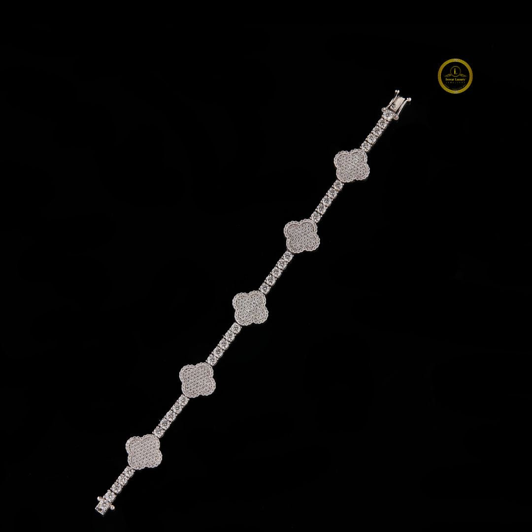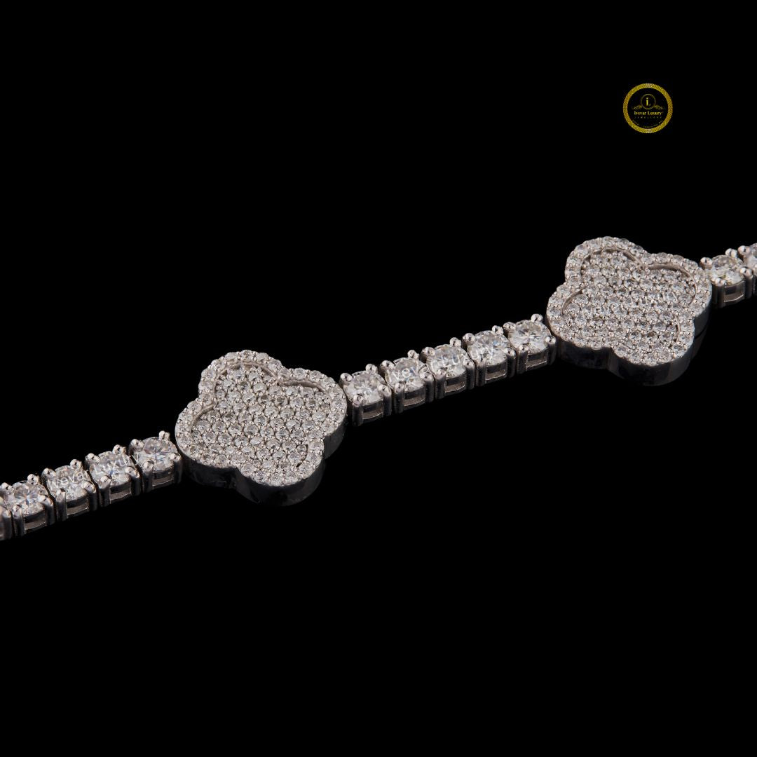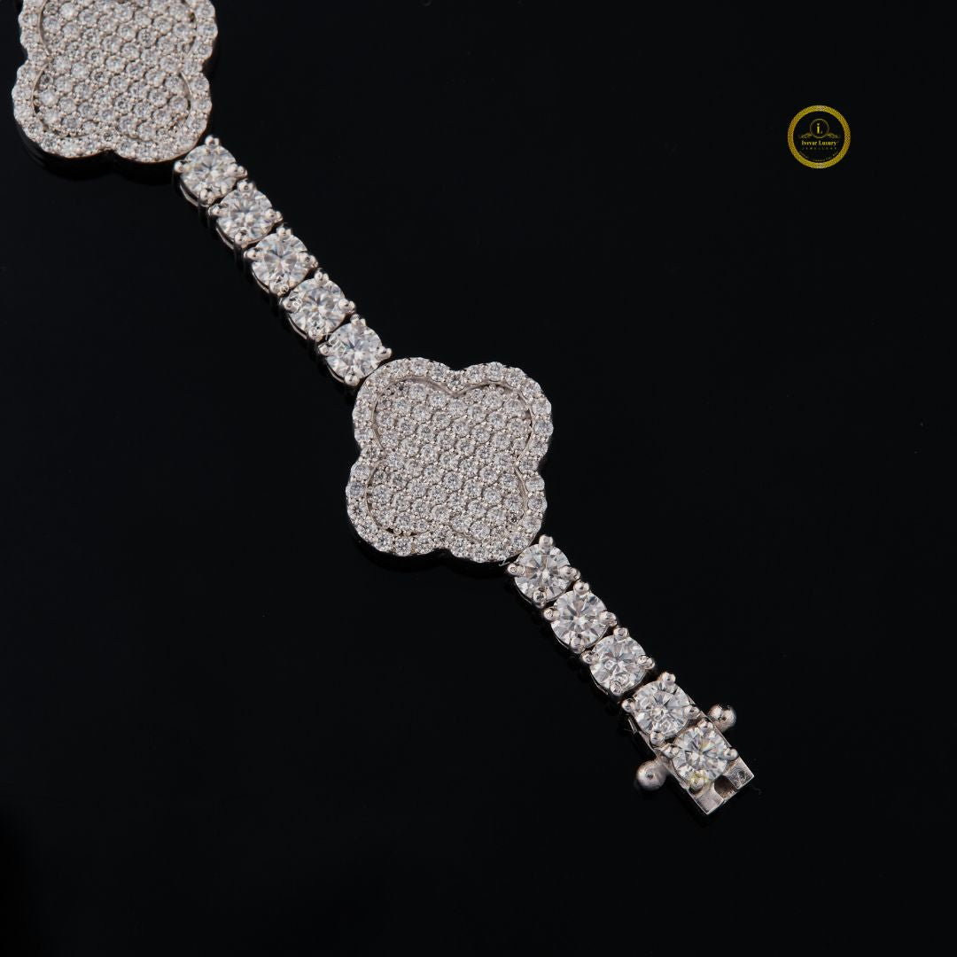 It has a silver-toned finish and offers brilliant light return due to the extensive use of paved stones. The main chain is a flexible line of closely set, round moissanite diamonds. At the center, there is a larger, prominent clover motif completely covered in pave-set stones, with two more partial motifs visible on either side. This design elegantly combines the classic look of a diamond tennis bracelet with a fashionable, eye-catching emblem. It fastens with a secure box clasp. This piece is a sophisticated and dazzling accessory, perfect for adding luxury to any outfit.
