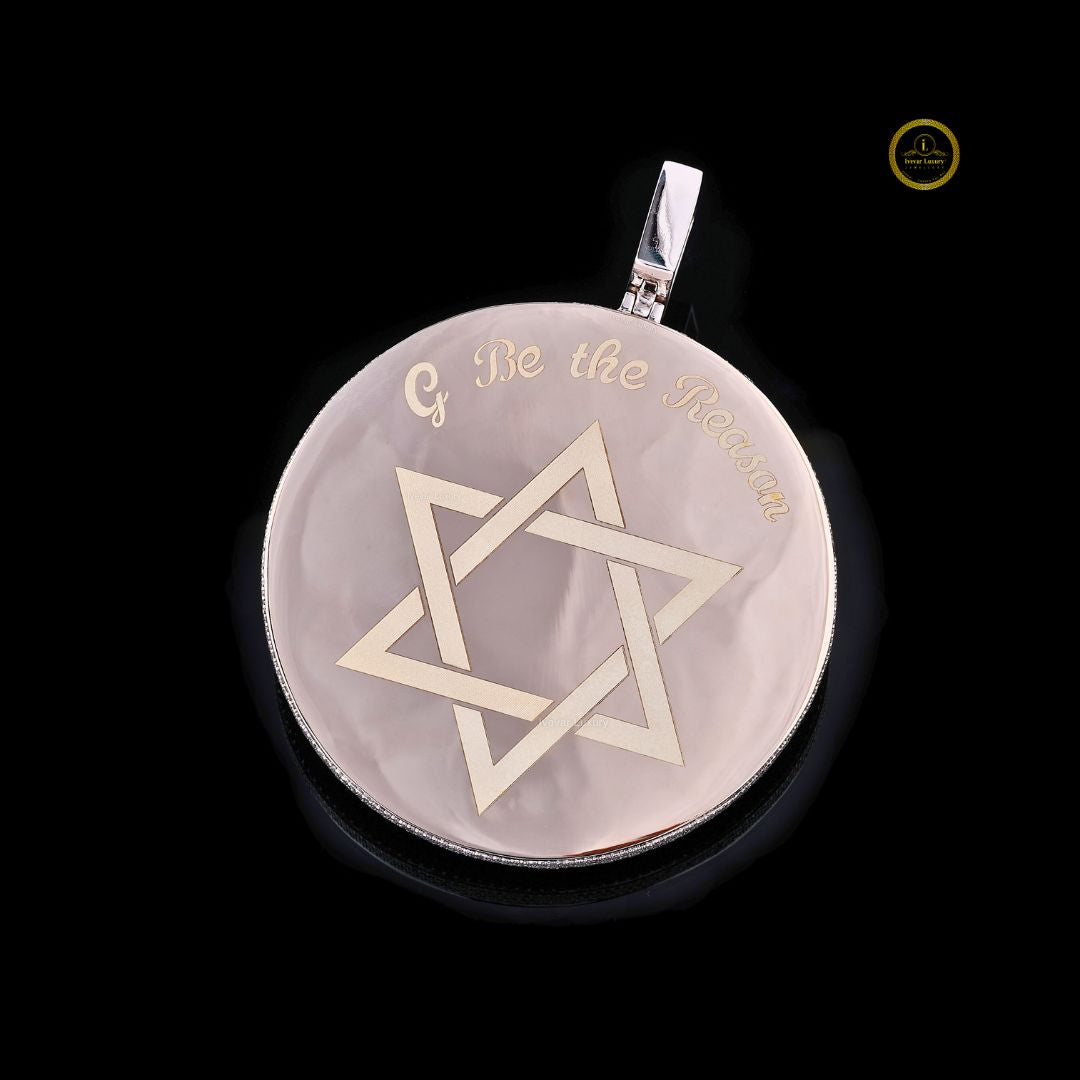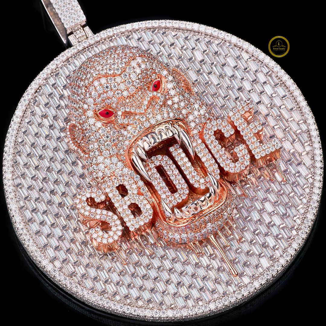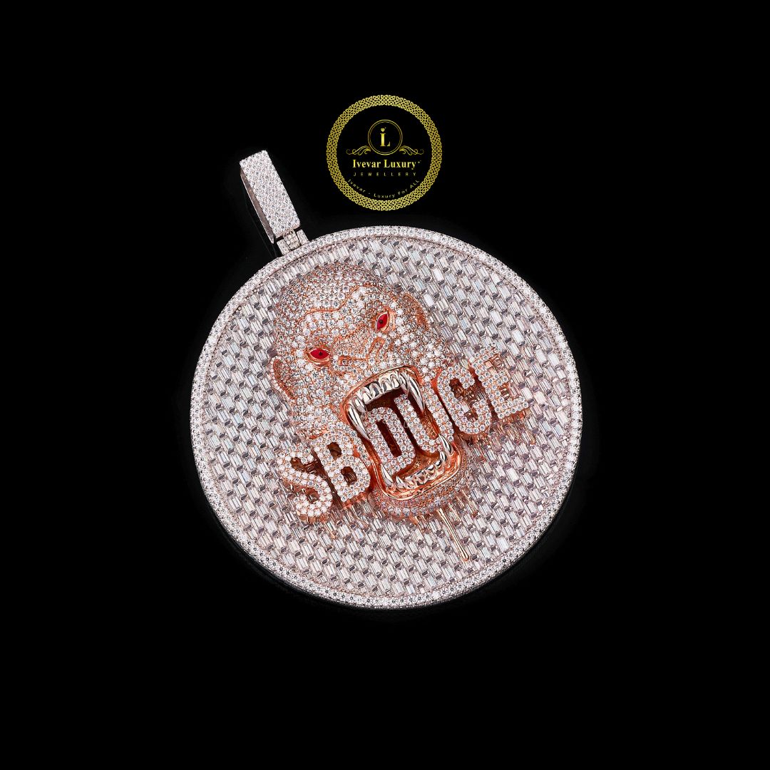 This oversized circular pendant is fully iced out with Lab Grown diamonds. The background features a striking arrangement of baguette-cut stones, complemented by a border of round brilliant cuts. The focal point is a detailed, snarling gorilla head crafted in what appears to be rose gold or copper-toned metal, featuring detailed texture and striking red-colored stones for the eyes. Across the gorilla's mouth are the bold initials or name "SBDUGE" (or a similar combination) in the same rose-gold metal. The large, iced-out bail is seamlessly integrated into the top of the medallion. This piece is a bold, high-end example of custom statement jewelry, associated with the brand "Ivear Luxury."
