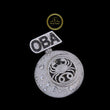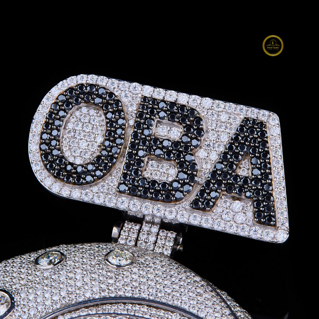 The large circular face is pavé-set with white diamonds, mimicking a starry or moonlit sky, with larger round diamonds scattered throughout. The piece is topped with a prominent bail featuring the initials "OBA" set in black and white diamonds. The pendant is branded by "Ivevar Luxury Jewels," indicating a bespoke, high-end design. It's a bold statement piece combining hip-hop jewelry aesthetics with personal meaning.
