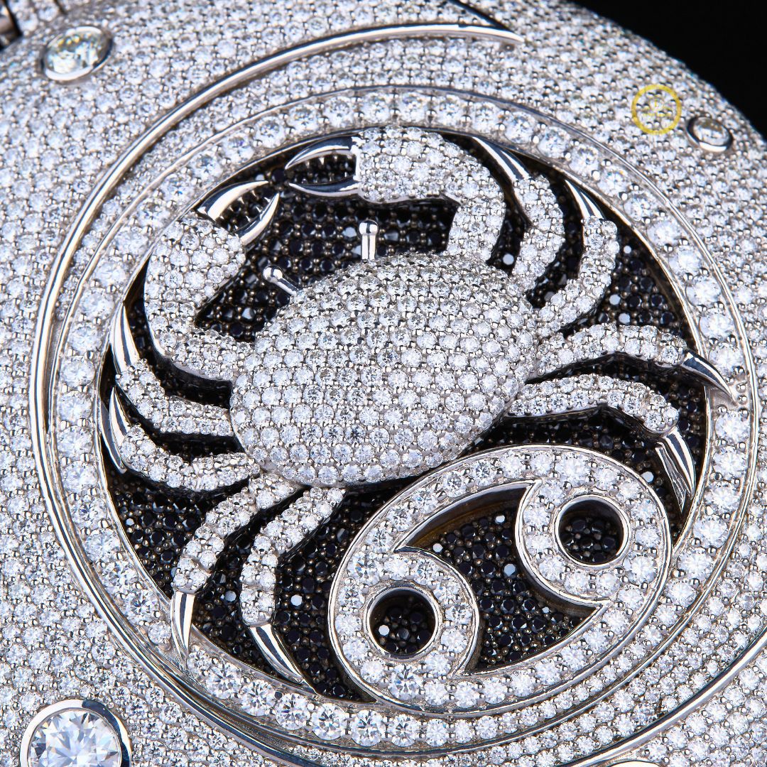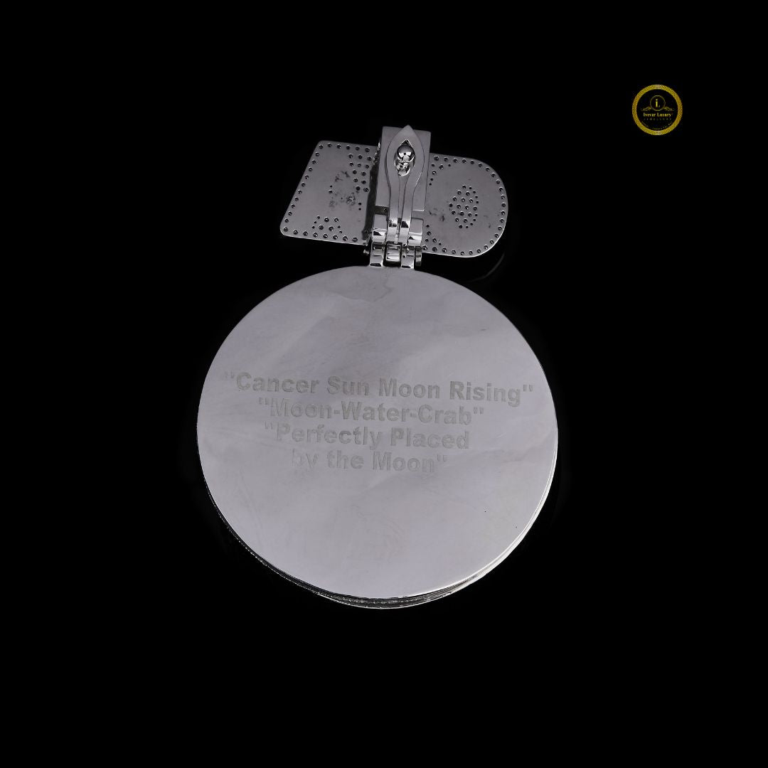 This is a luxurious and highly personalized custom pendant, likely crafted in white gold or platinum, featuring an extensive setting of lab-grown diamonds for maximum sparkle. The design is centered around the Cancer zodiac sign (a crab), rendered in contrasting black and white stones, which suggests a theme of astrological significance or personal identity.
