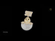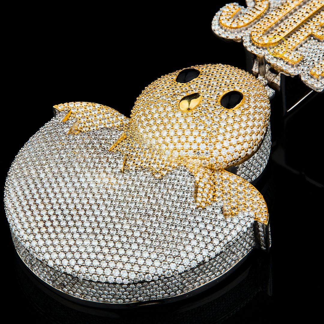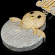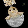 This statement piece combines an abstract figure with custom lettering. The main body depicts a baby chick hatching from a broken egg, entirely encrusted with lab grown diamonds. The chick's head is finished in yellow gold and covered in stones, contrasting with the lower half of the egg shell, which is set in white metal and covered in stones. Small black stones form the eyes and beak. Above the chick, the custom name "SUEY" is spelled out in bold, two-tone block letters, using both yellow-gold accents and white-metal backgrounds with mixed baguette and round brilliant lab grown cuts. The bail is positioned between the nameplate and the chick, linking the fun, custom design together. The jewelry is associated with the brand "Ivevar Luxury."