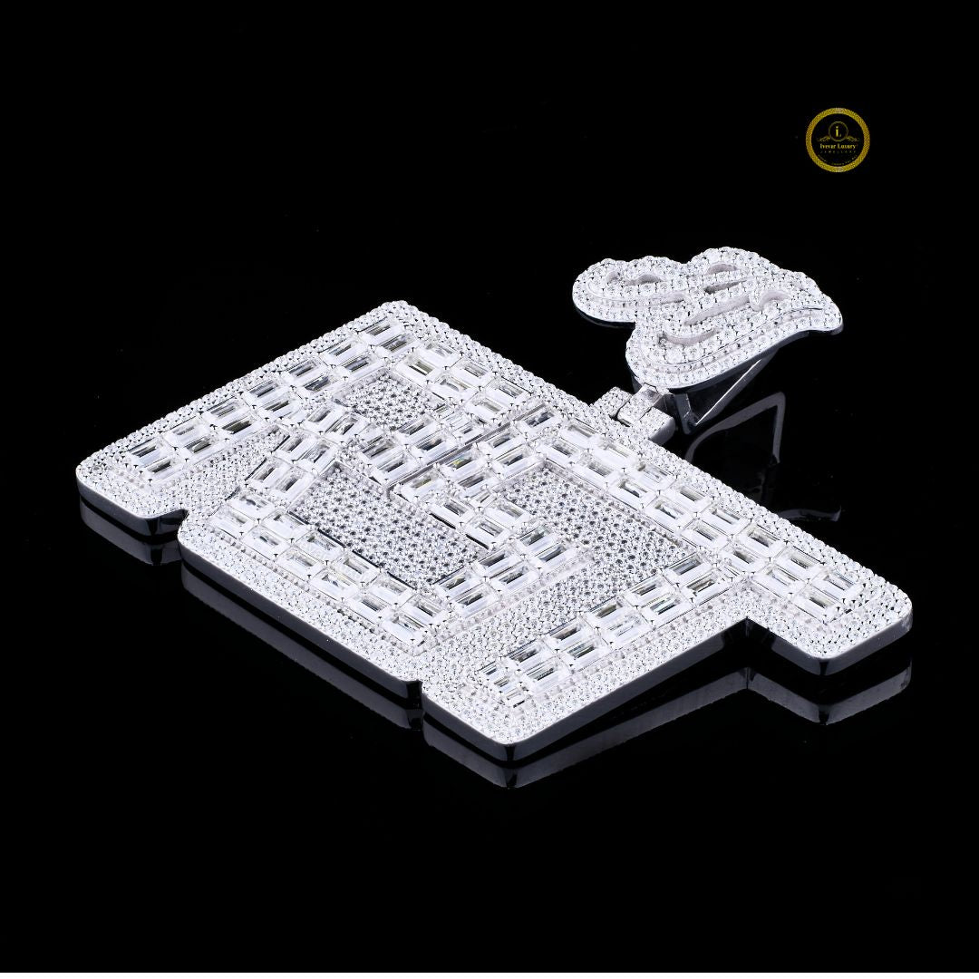 This image displays a luxurious custom pendant featuring a bold, rectangular design with a prominent, scripted initial "A" on top. The pendant is intricately set with numerous Moissanite "diamonds"—a popular and durable diamond alternative.