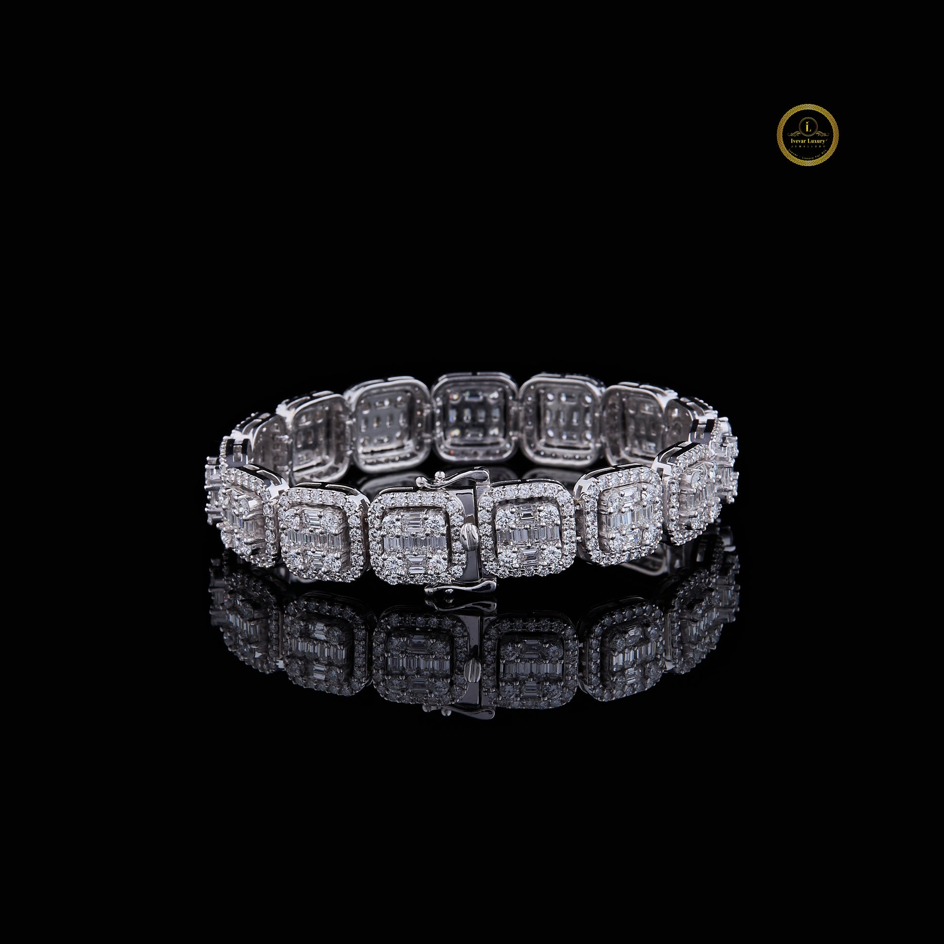 This stunning bracelet showcases a series of intricately designed square links, each encrusted with meticulously arranged baguette and round-cut diamonds that create a dazzling mosaic effect. The symmetrical pattern of the links, framed by delicate diamond halos, adds a sophisticated geometric elegance, making the piece both timeless and contemporary. Crafted in gleaming white gold, this bracelet exudes luxury and refinement, perfect for elevating formal attire or making a striking statement at special occasions.
