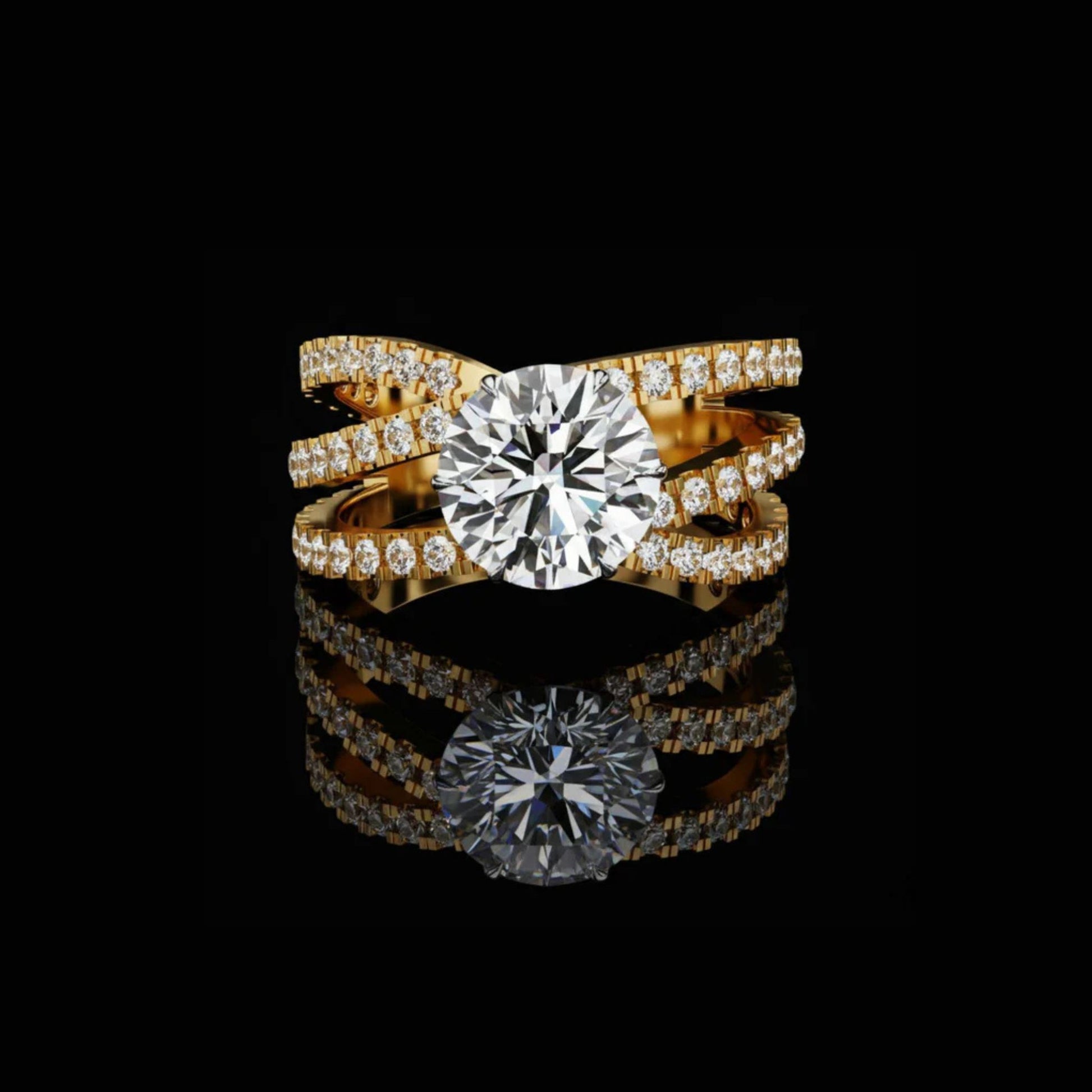 This breathtaking multi-row engagement ring from Ivevar Luxury features a brilliant round-cut center diamond set atop a bold, multi-Row structure that radiates sophistication. Each curved band is meticulously pavé-set with shimmering diamonds, creating a high-impact sparkle from every angle. The modern layered design gives the ring a sculptural elegance, while maintaining a timeless romantic feel. Crafted for someone who loves luxury, brilliance, and standout artistry, this piece is a perfect blend of craftsmanship and glamorous design.