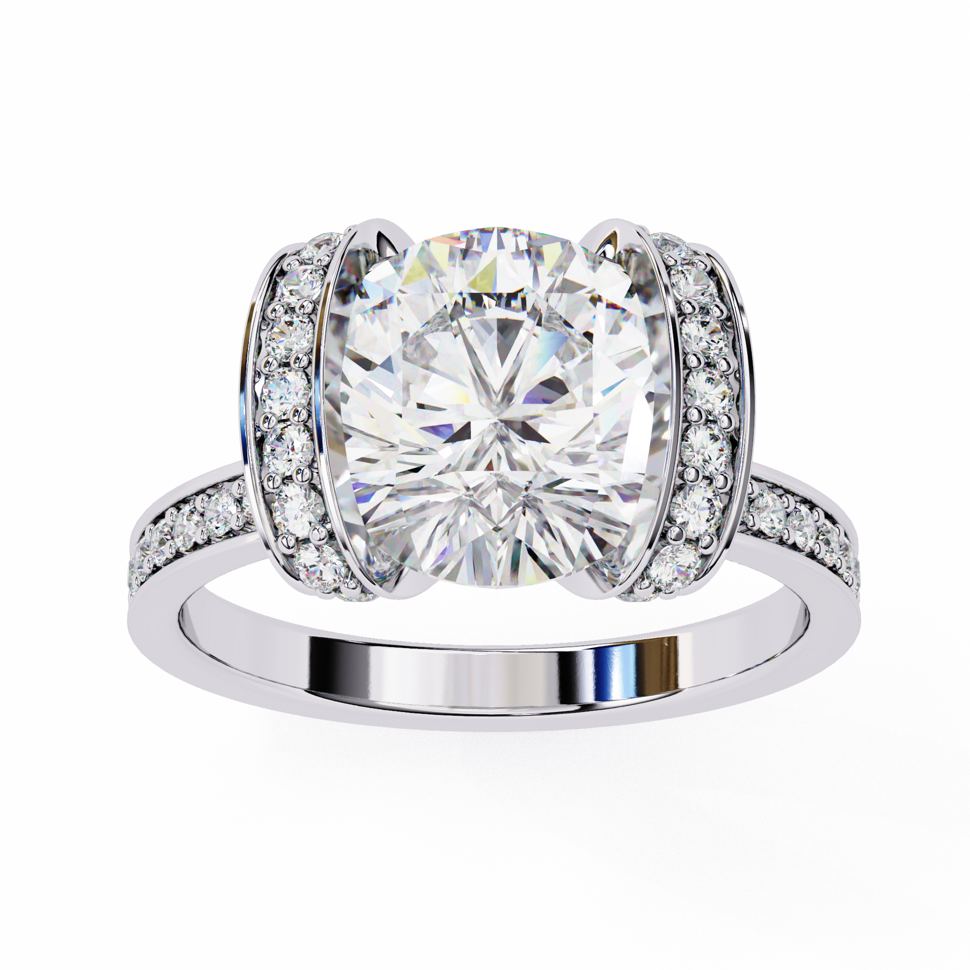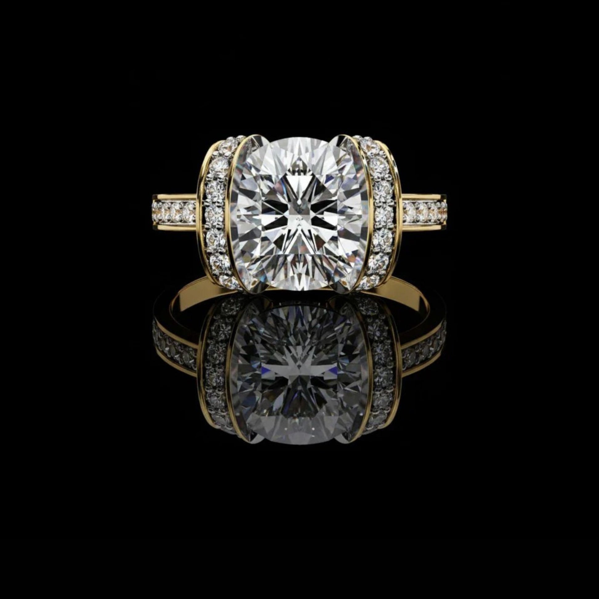 This breathtaking cushion-cut diamond ring from Ivevar Luxury is crafted for those who desire bold elegance in every detail. The center features a large cushion-cut brilliance set between dual pave-diamond panels, creating a regal and dimensional look from every angle. Its polished gold band adds warmth and luxury, while the shimmering side accents elevate the ring’s radiance. Designed for modern brides who want a statement engagement ring, this piece blends sophistication, craftsmanship, and an unmistakably powerful sparkle.