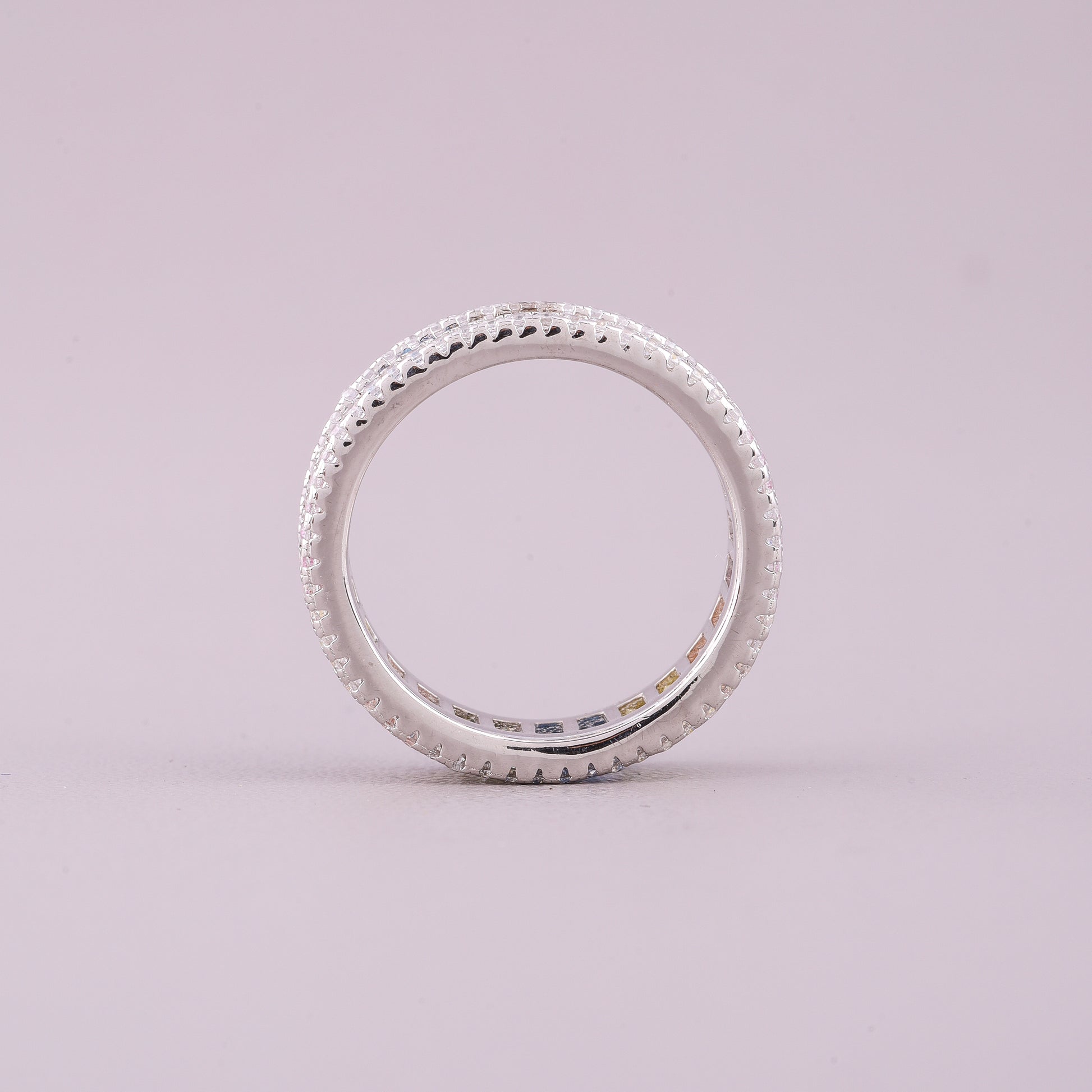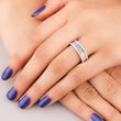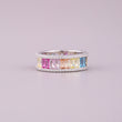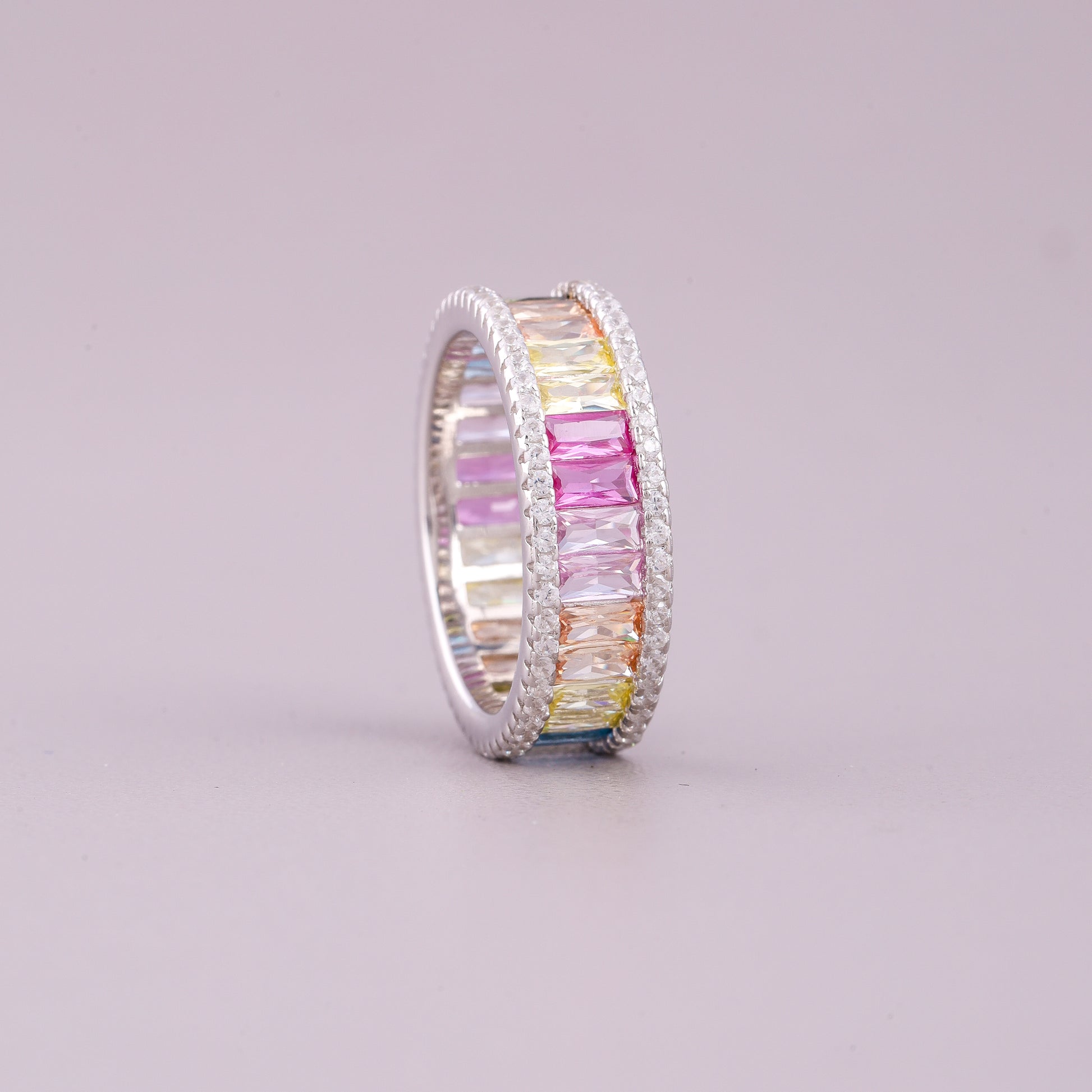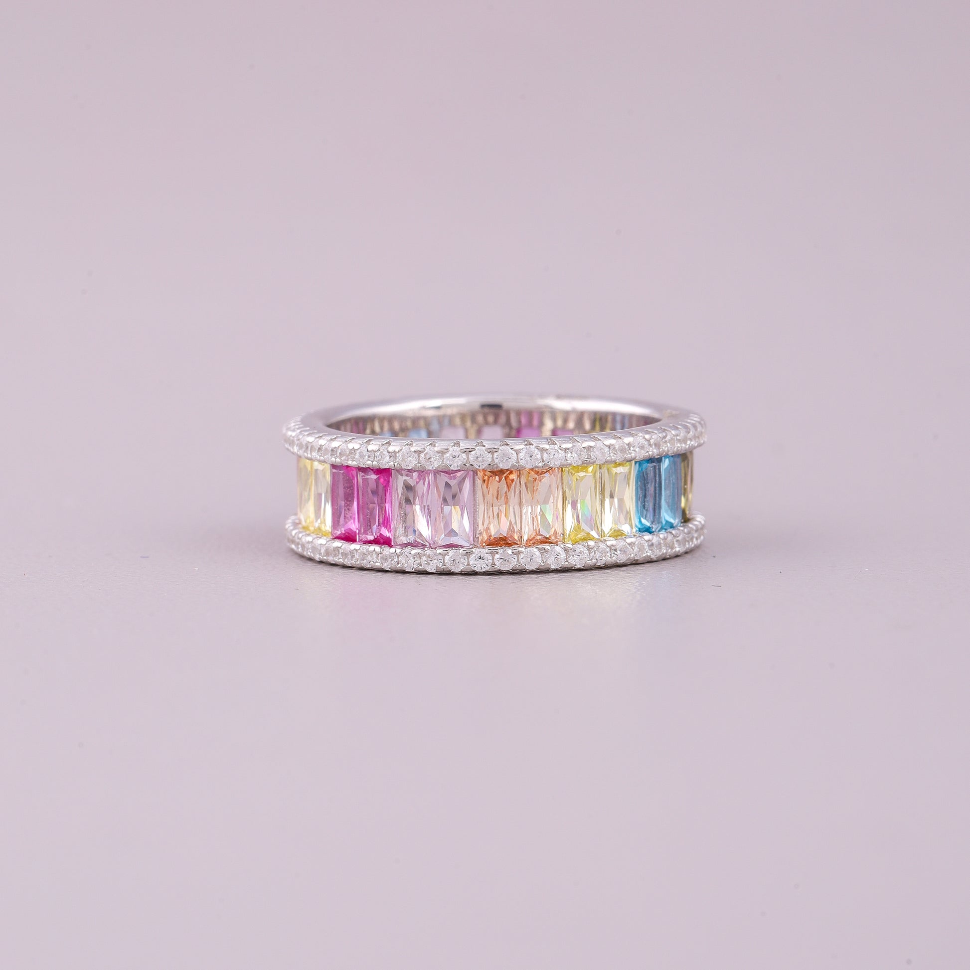 This striking eternity band combines vivid color with dazzling brilliance, likely set in polished white gold or platinum. The centerpiece is a continuous row of brightly hued, natural emerald-cut sapphires arranged in a lively rainbow pattern. These meticulously aligned, long-cut gems are predominantly set in a shared-prong style, maximizing light entry and color saturation. Framing this central color block are two continuous borders of smaller, brilliant round-cut diamonds, which are meticulously pavé-set along the edges. The contrasting diamond halo accentuates the bold colors of the sapphires. This wide-band design offers a glamorous and modern aesthetic, perfect as a fashion statement or a unique anniversary ring.