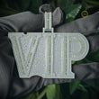This eye-catching custom pendant spells out "VIP" and is completely covered in lab-grown diamonds, offering a luxurious, high-end look. The design features a mix of diamond cuts for maximum brilliance: baguette-cut stones are meticulously channel-set to define the letters, while round brilliant-cut stones cover the remaining surface in a paved setting.