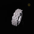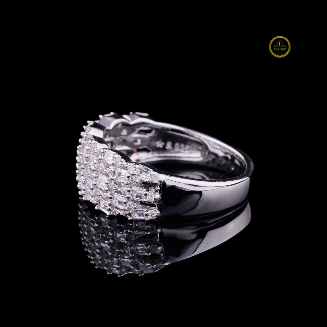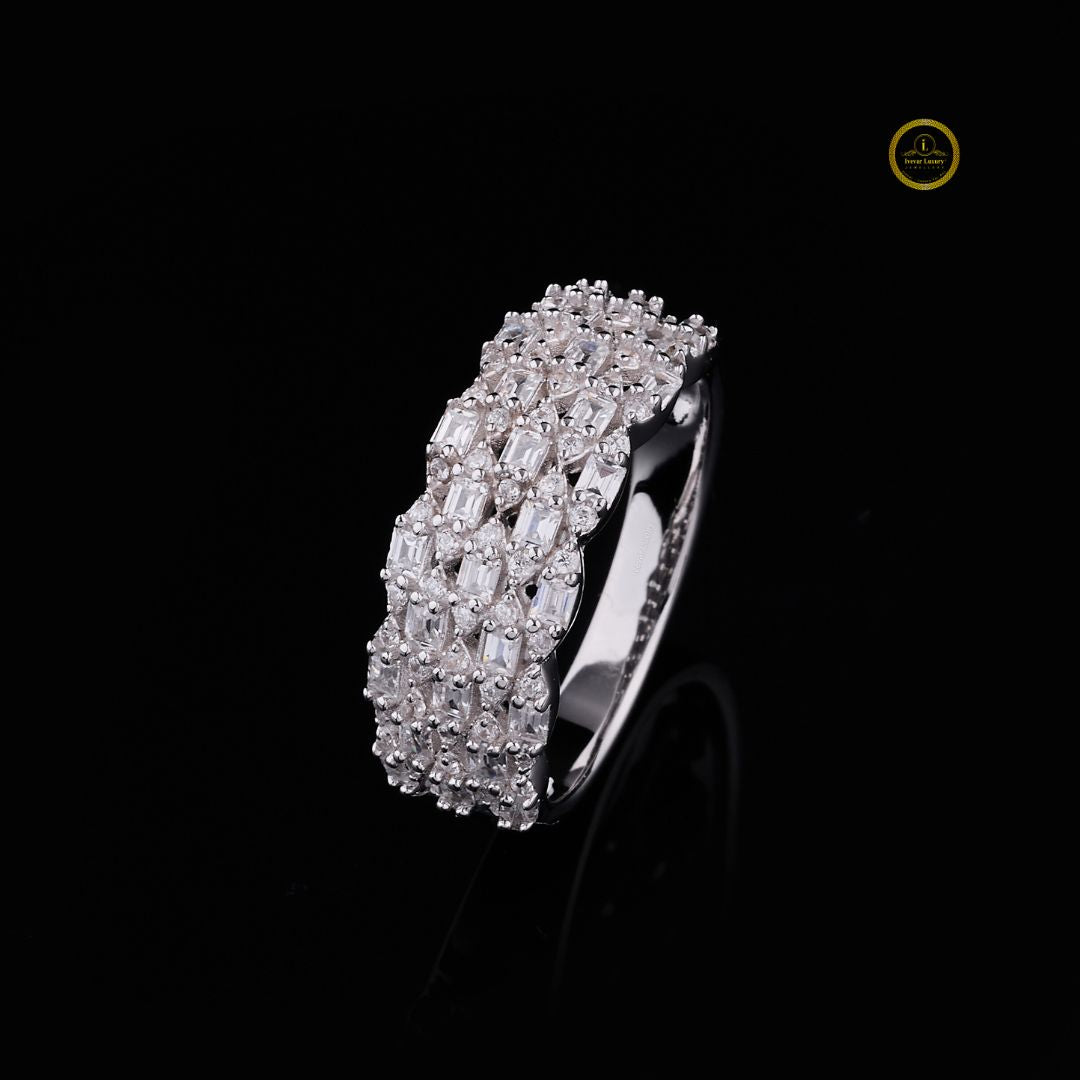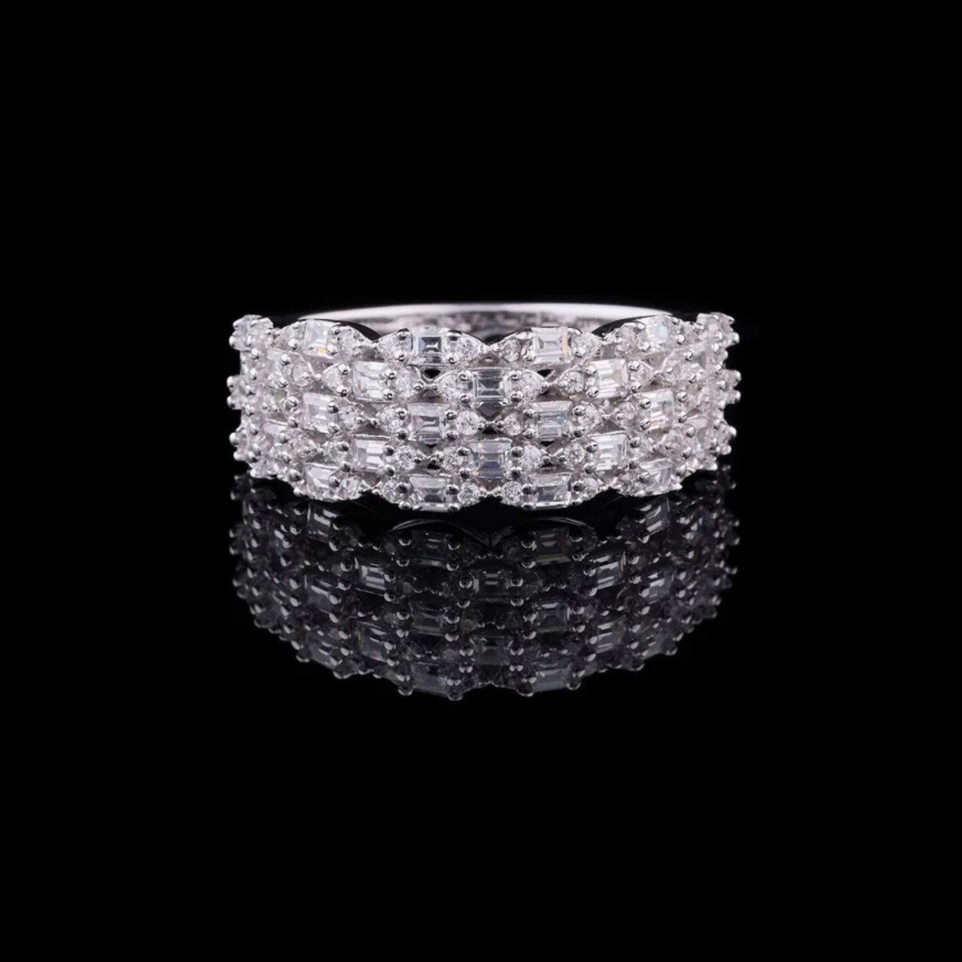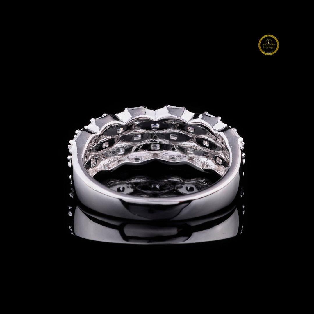 This elegant ring showcases a triple-row design crafted with precision emerald cut diamond and shimmering round-brilliant stones. Set in a sleek white-gold band, the repeating pattern creates a luxurious, high-sparkle finish that radiates sophistication. Perfect as a statement piece or an elevated everyday accessory, this ring embodies timeless elegance, refined craftsmanship, and enduring brilliance.