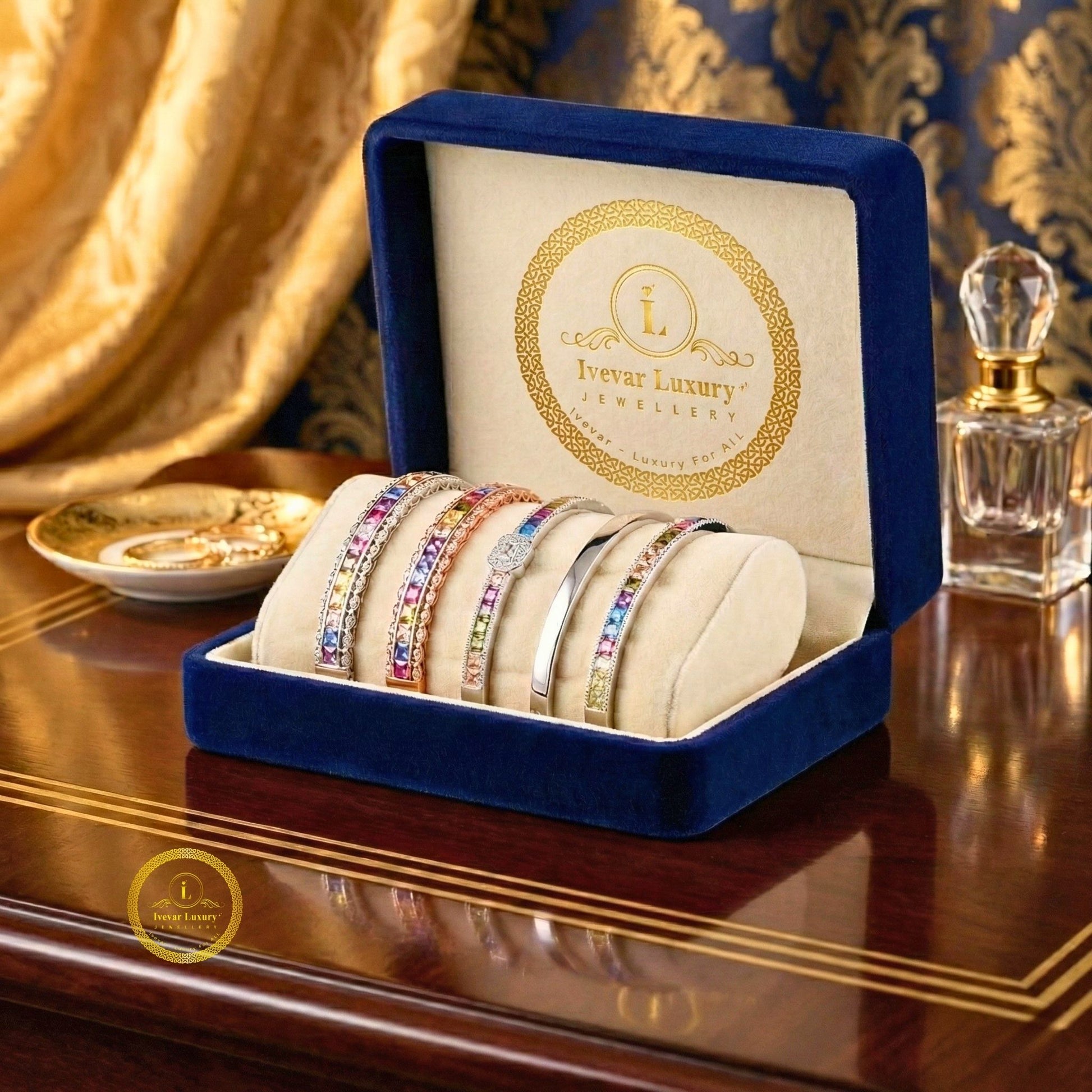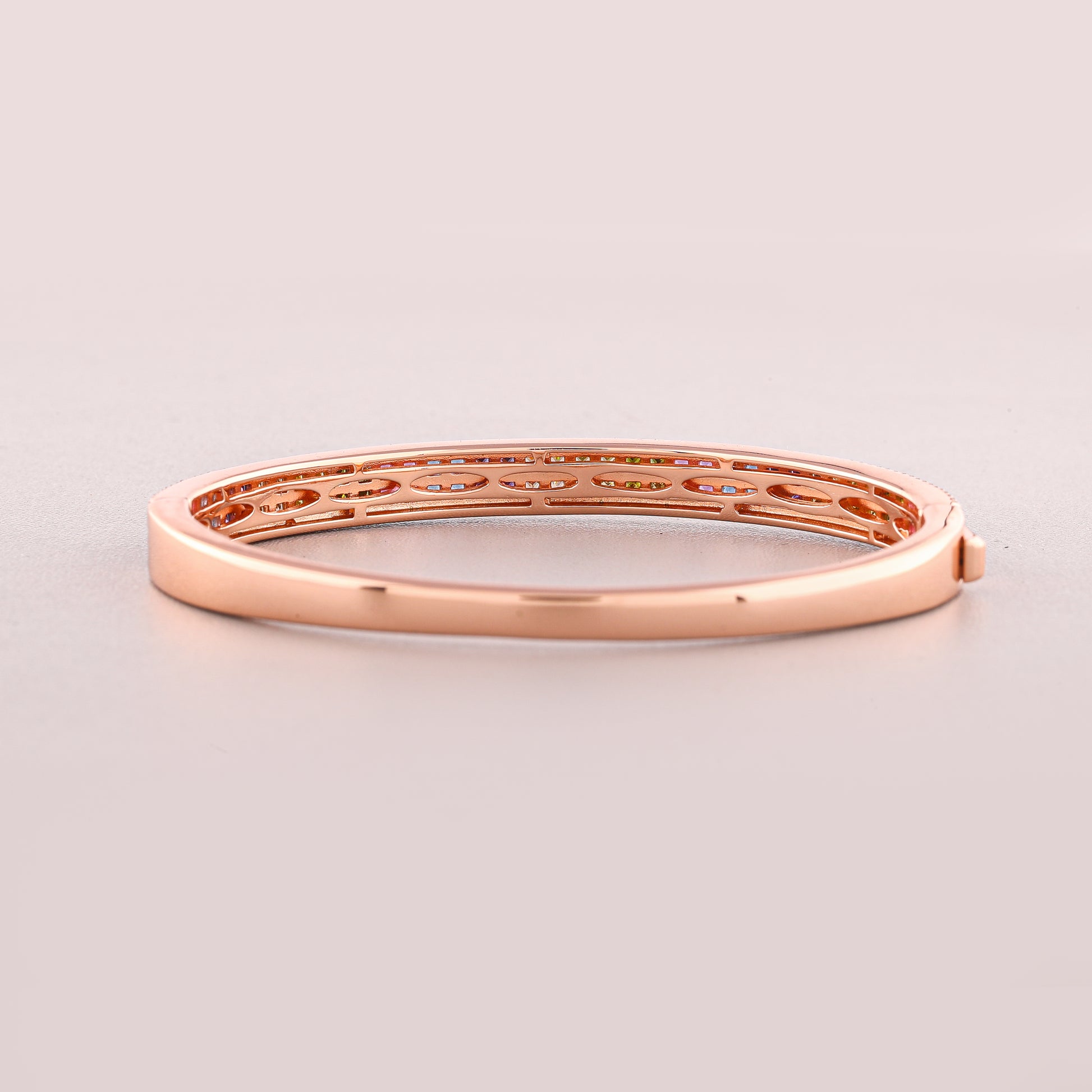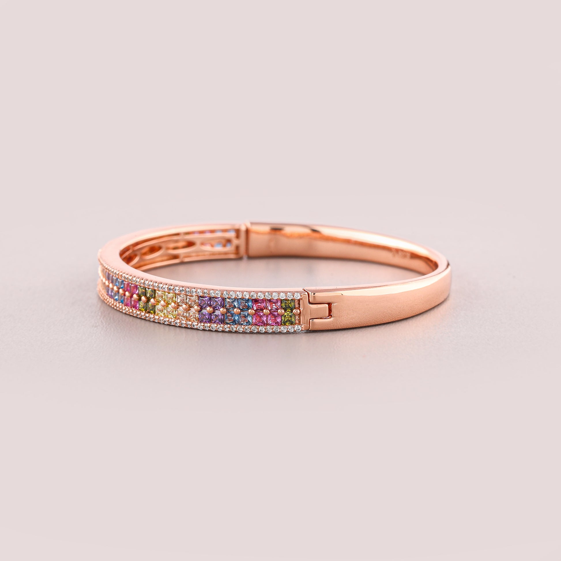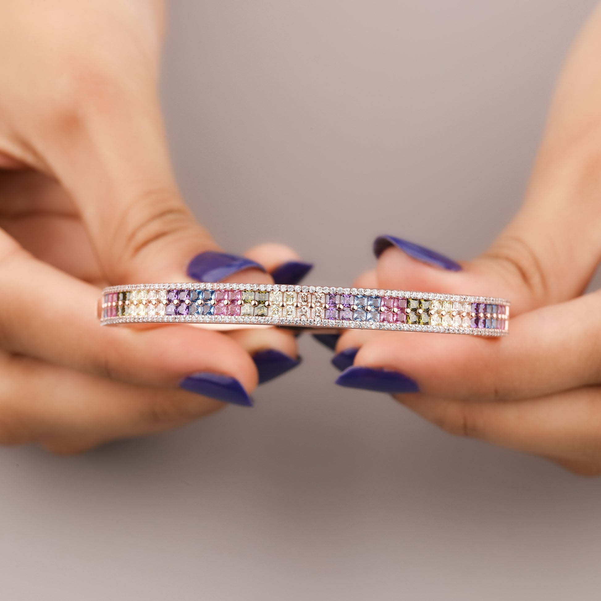 This beautiful hinged bangle bracelet is distinguished by its vibrant, clustered design. It features two closely set rows of natural, multi-colored sapphires (or similar gemstones), cut in the princess or square shape, creating an intense and dense rainbow spectrum. The colors are brilliant and encompass the full range, from pink and blue to yellow and green.