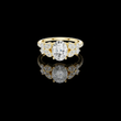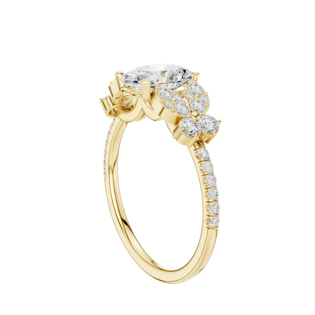 This enchanting ring features a brilliant oval-cut center diamond set in warm gold, complemented by intricate floral-inspired diamond clusters on each side. The clusters are composed of round diamonds arranged to resemble delicate petals, creating a romantic, nature-inspired silhouette that enhances the ring’s sparkle and elegance. With its blend of classic center-stone beauty and whimsical botanical detailing, this ring offers a unique and graceful look perfect for someone who loves timeless design with a touch of artistry.