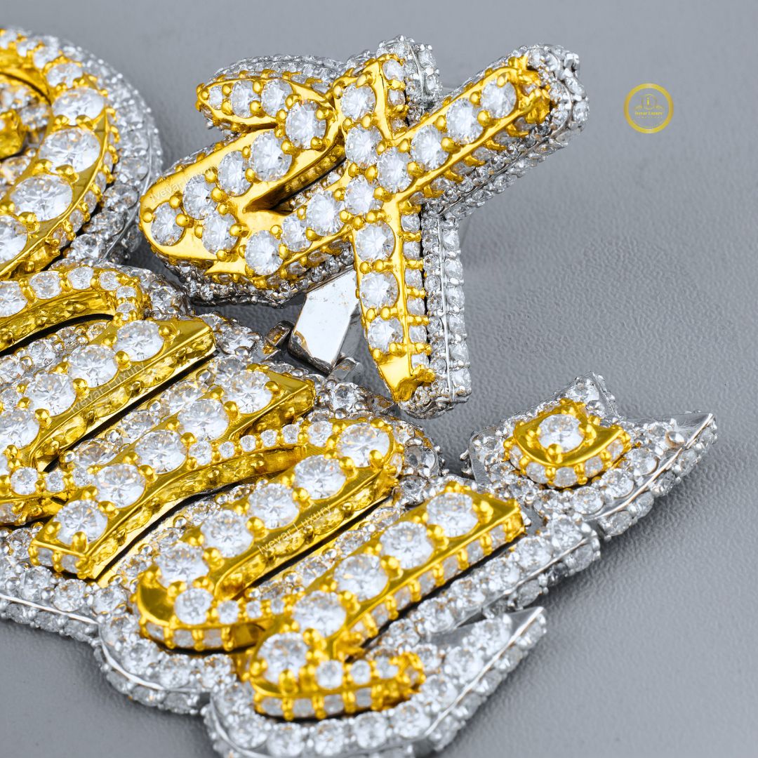 This is an opulent custom pendant, crafted with lab-grown diamonds set in contrasting colors of metal, likely white and yellow gold plating. The design features a two-tone aesthetic, where the main script is highlighted in one metal color (yellow/gold) and surrounded by another (white/silver), creating a 3D, layered look. It is fully paved with sparkling, brilliant-cut diamonds, maximizing its shine and "drip" effect. The piece is branded "Ivevar Luxury" suggesting it's a high-end, custom jewelry item perfect for making a bold fashion statement.