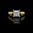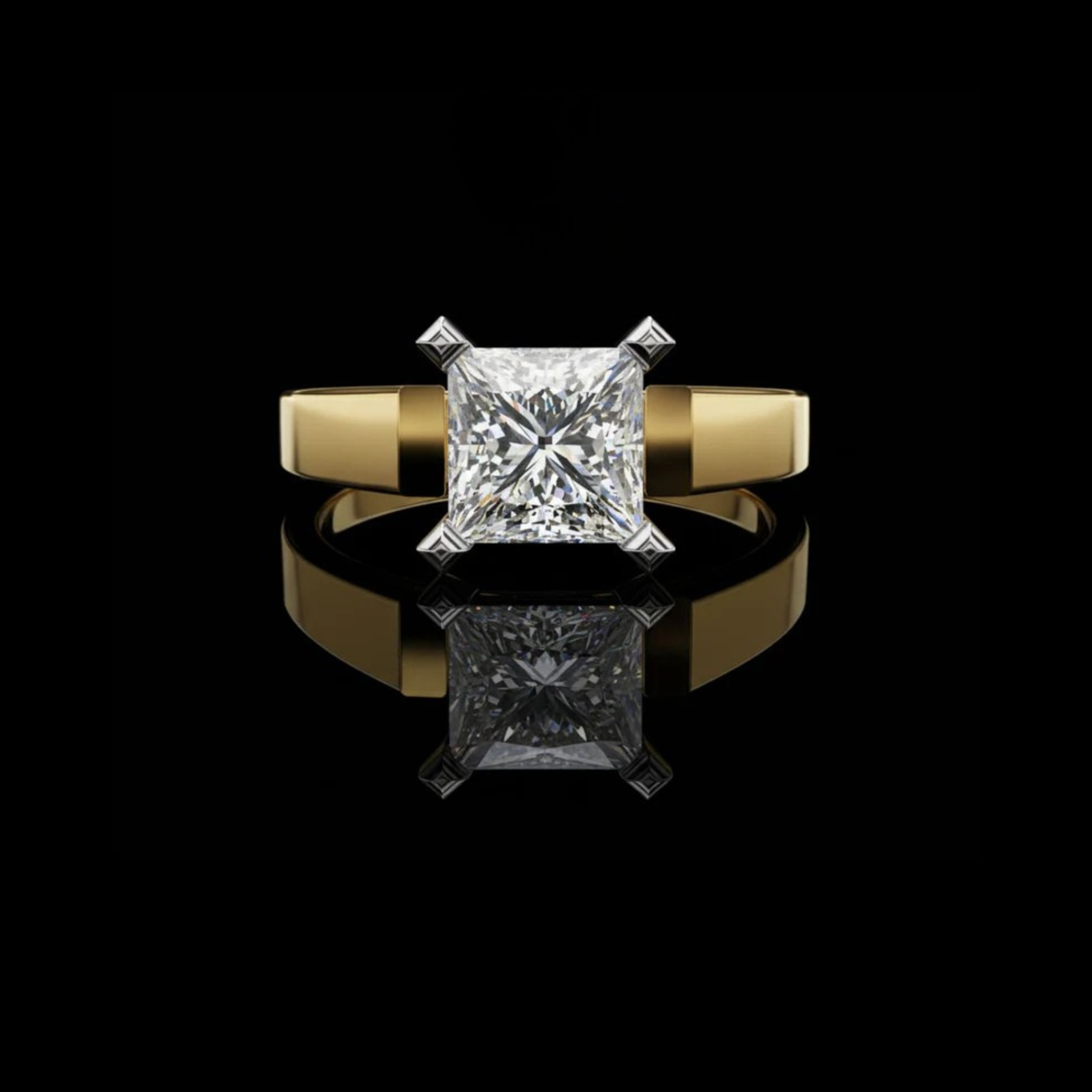This luxurious engagement ring features a stunning Princess-cut diamond set in a classic band, providing a timeless and sophisticated look. The diamond is secured with four sleek prongs, allowing its brilliance to shine from every angle. The high-quality craftsmanship ensures this piece will be cherished for generations. Perfect for a special engagement or as a symbol of lasting commitment, this ring combines elegance and luxury in a beautiful design.