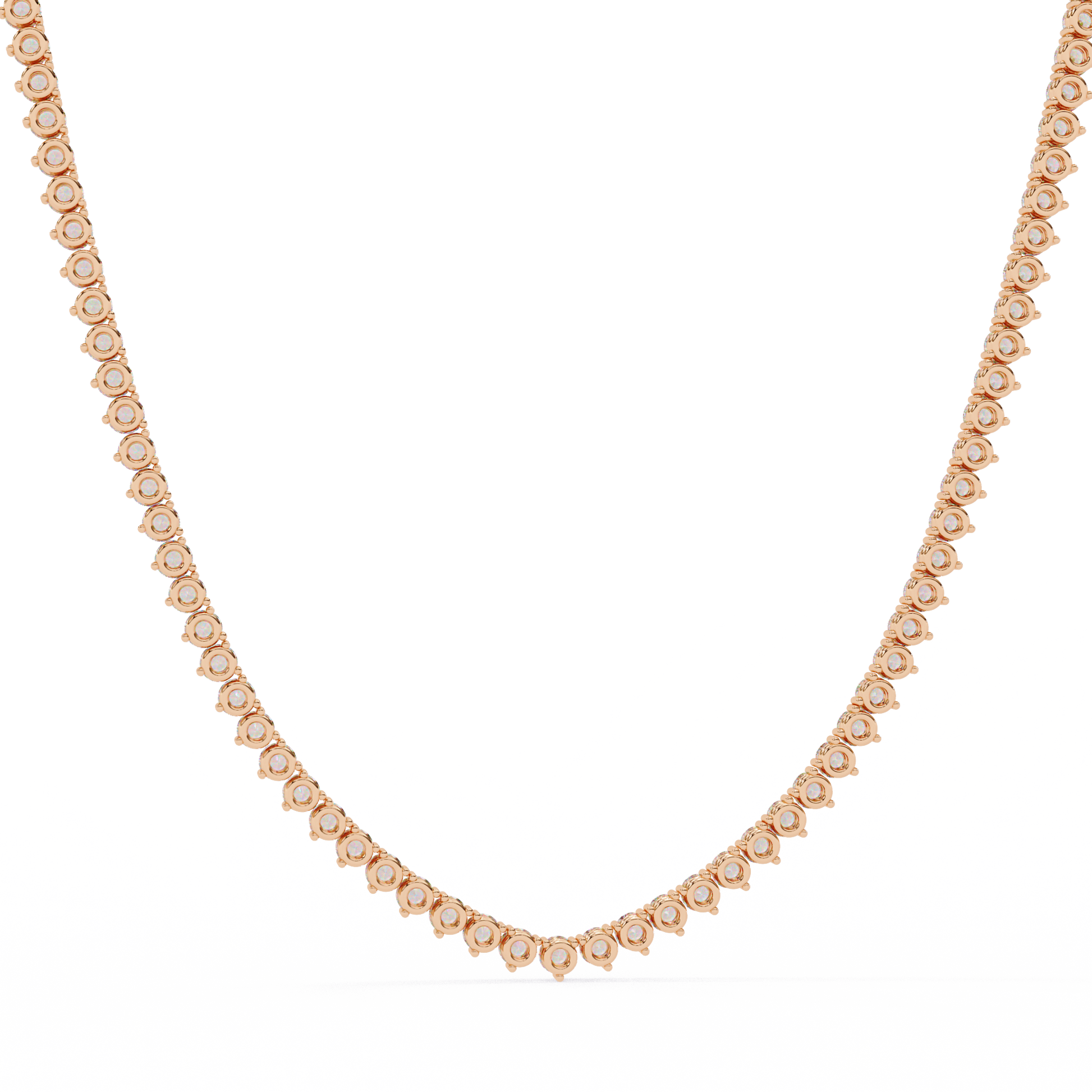 This stunning necklace radiates timeless sophistication, featuring a delicate strand of perfectly matched Round Shaped Diamonds set in gleaming gold. Each stone is meticulously arranged to create a graceful, shimmering silhouette that enhances the neckline with refined brilliance. The elegant tapering design captures light from every angle, offering a luxurious sparkle that’s ideal for both grand occasions and everyday elegance. A masterpiece of craftsmanship and classic beauty by Ivevar Luxury.